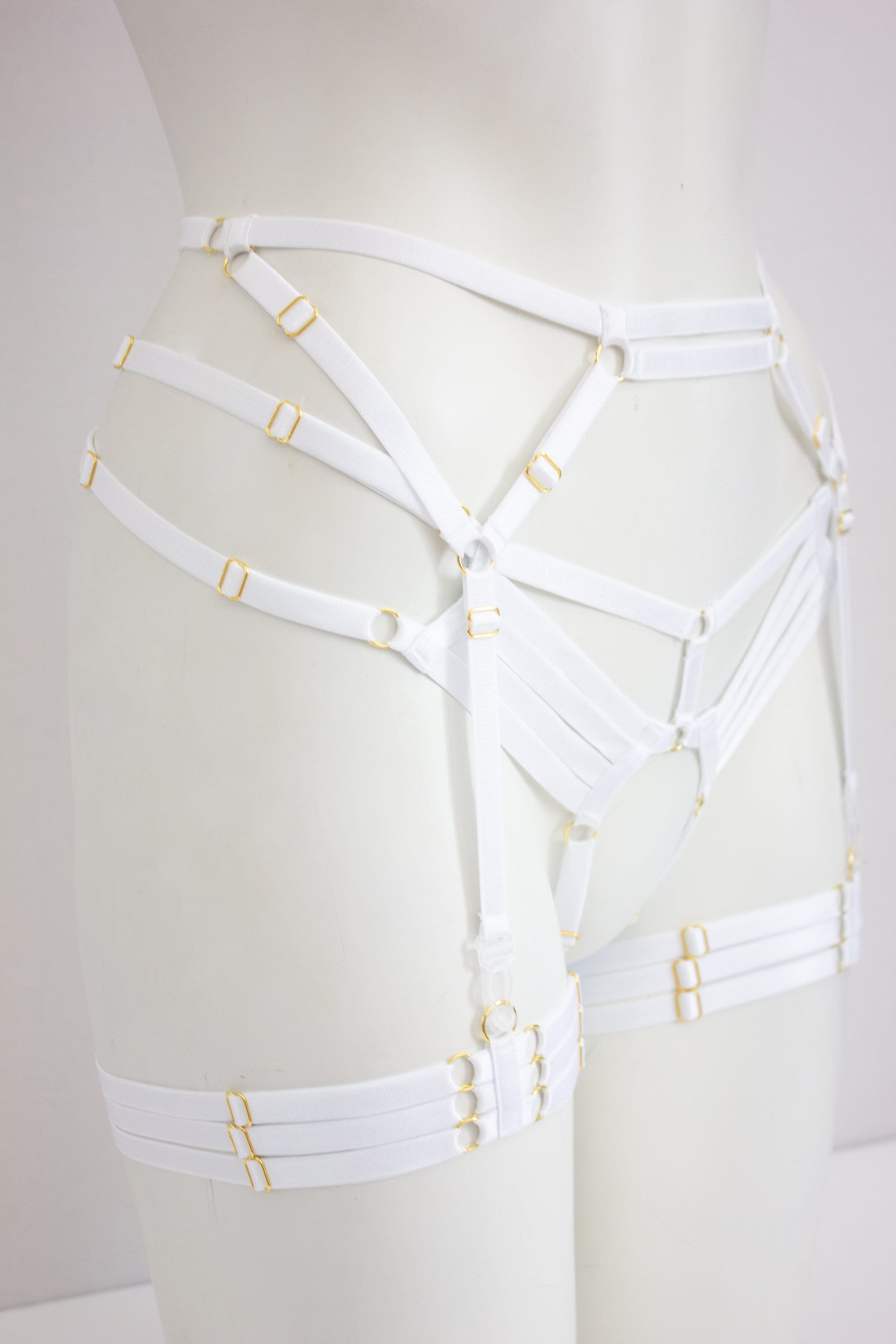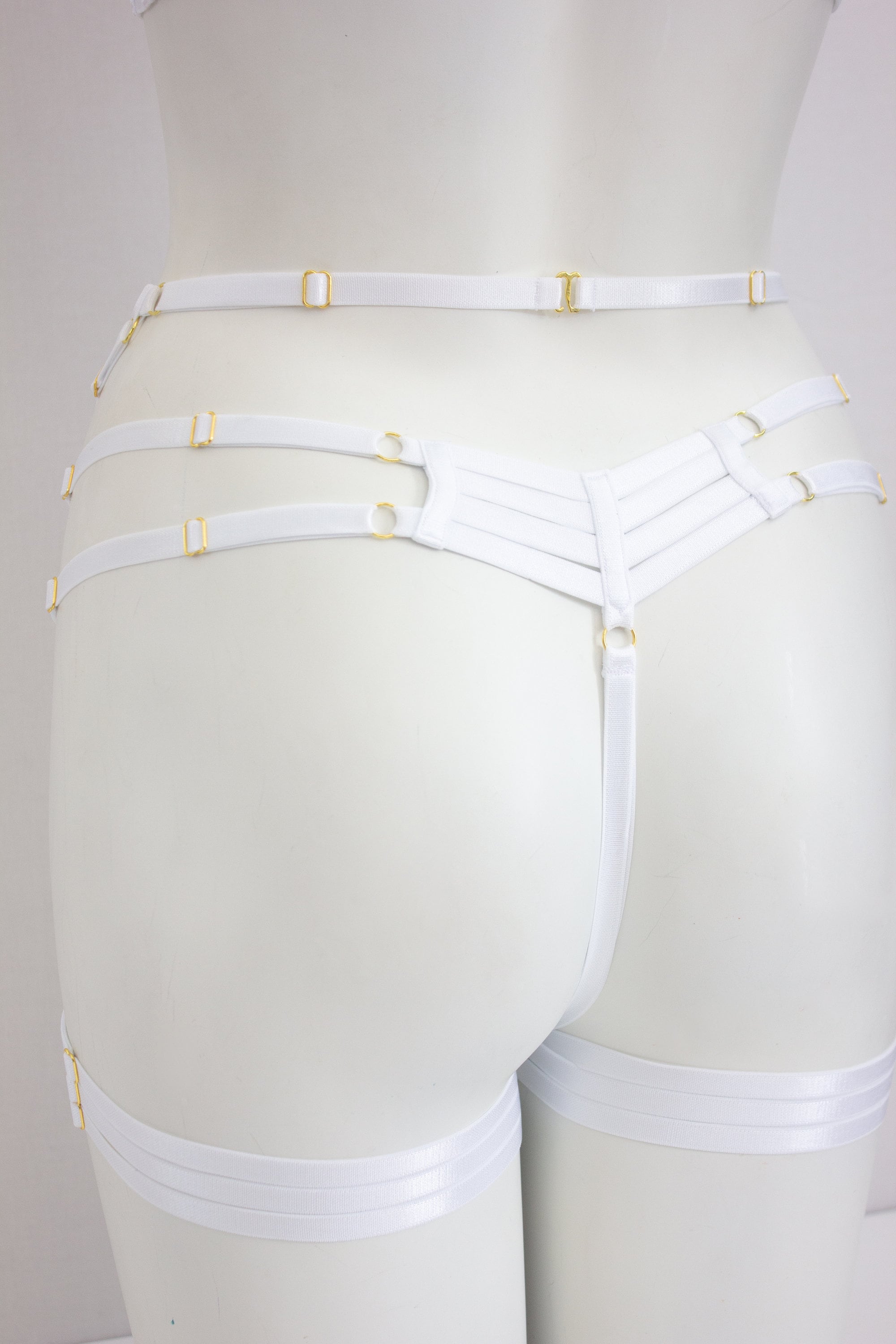 Cora Luna Cage Panties, 3 Strap Garters, & Waist Garter Delux Set - Displayed in WHITE w/ GOLD colour findings.