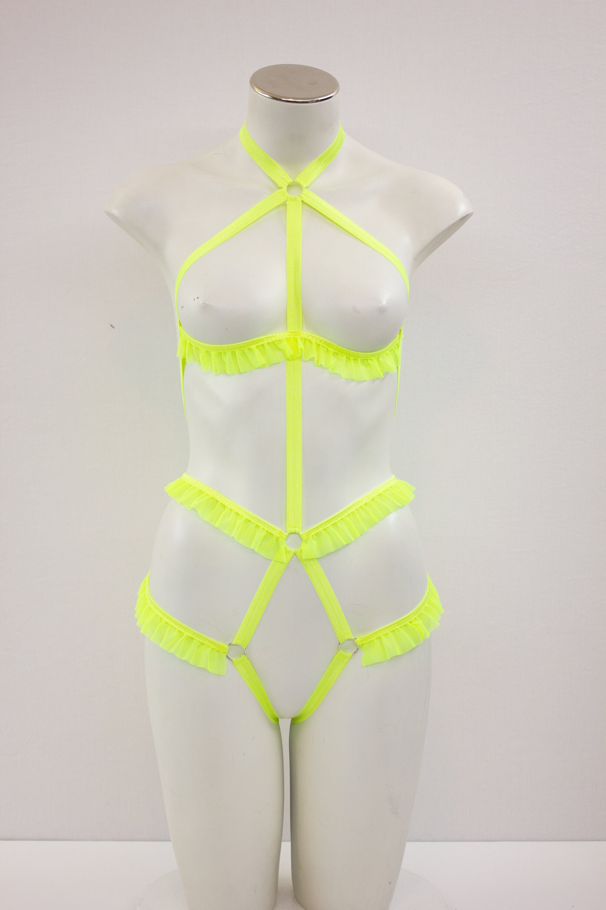 Neon Yellow Glow Harness, Exotic Dance Wear, Festival Harness, Rave Outfit, Ruffle Bodysuit, Neon Yellow Bodysuit, Sexy Strappy Lingerie
