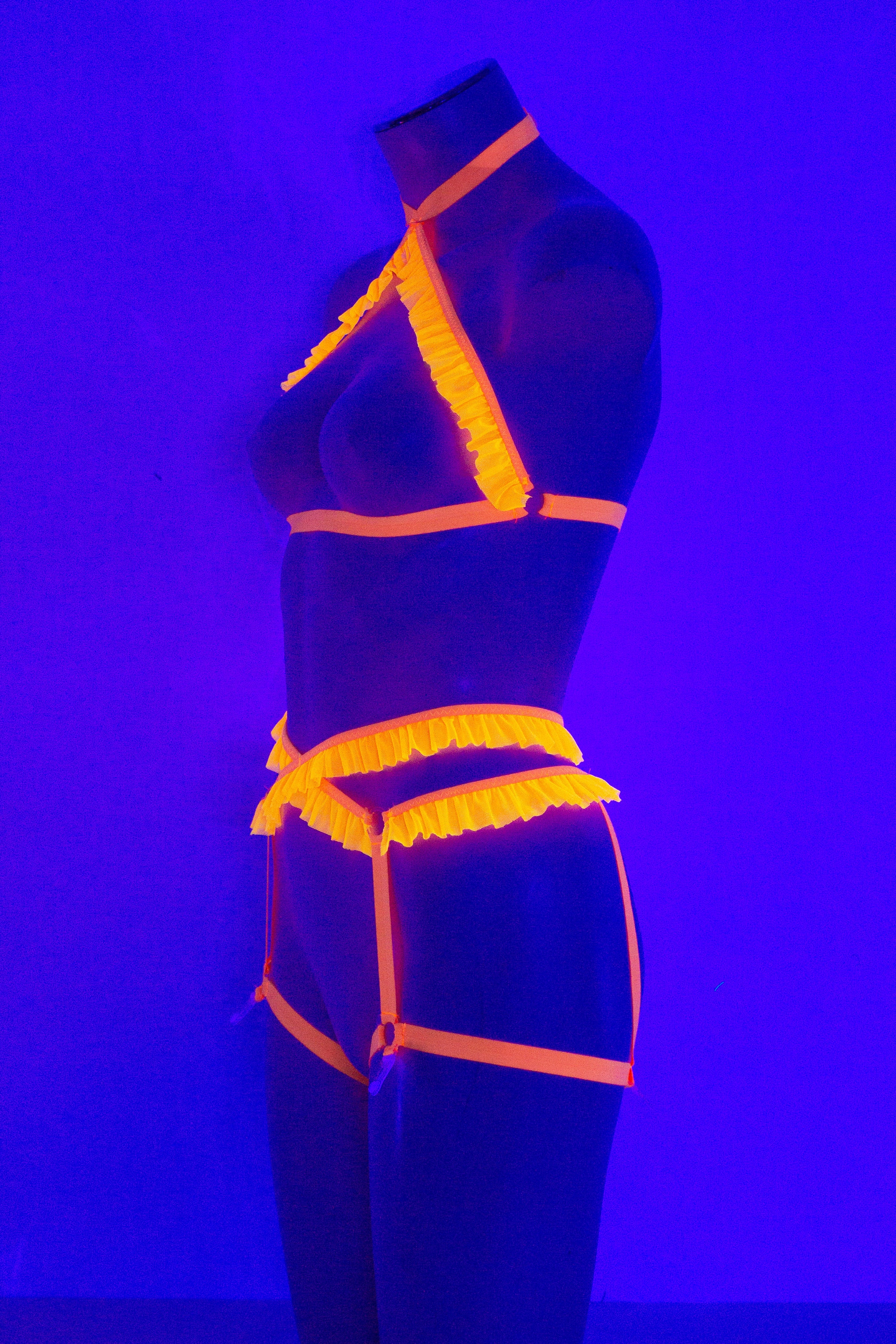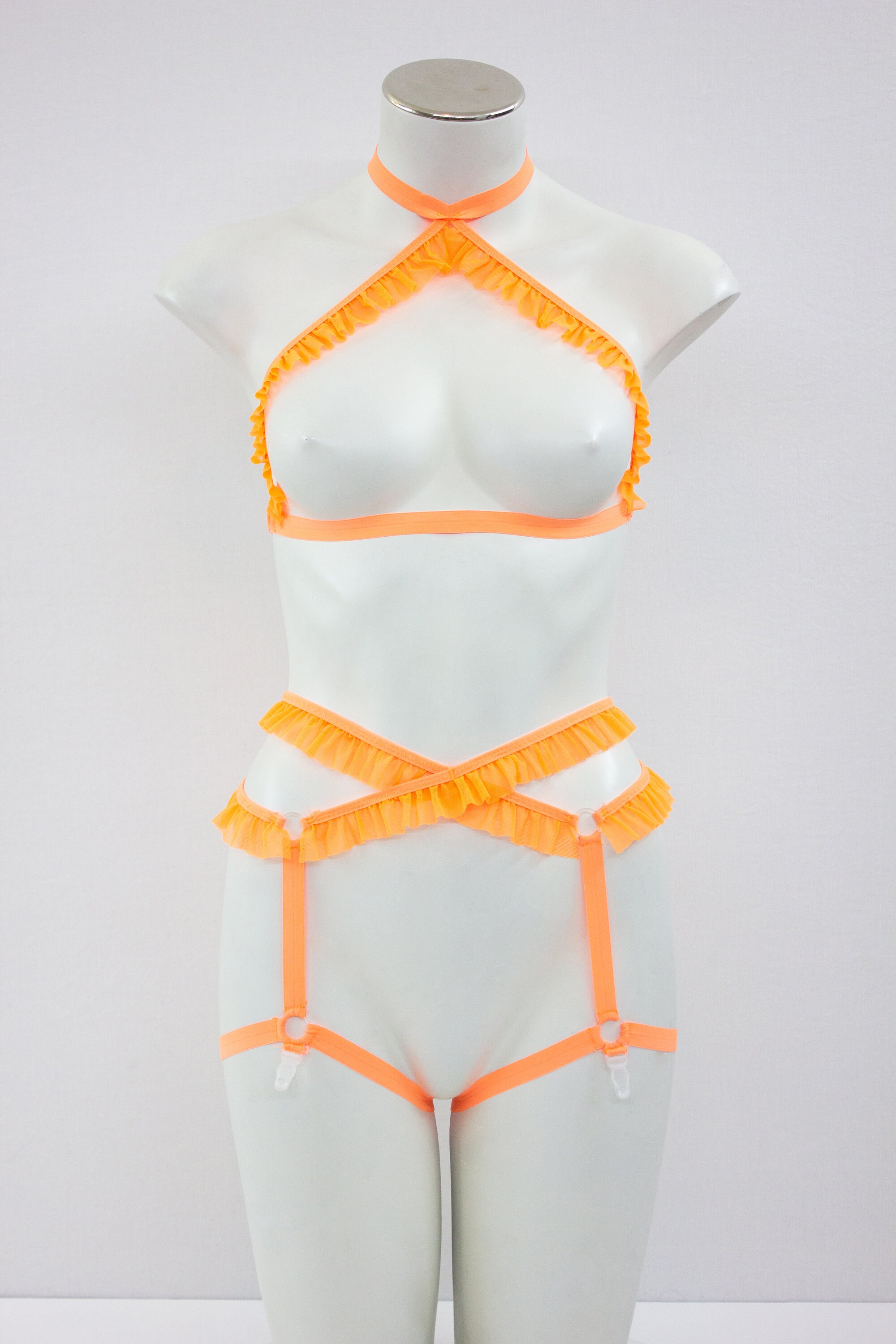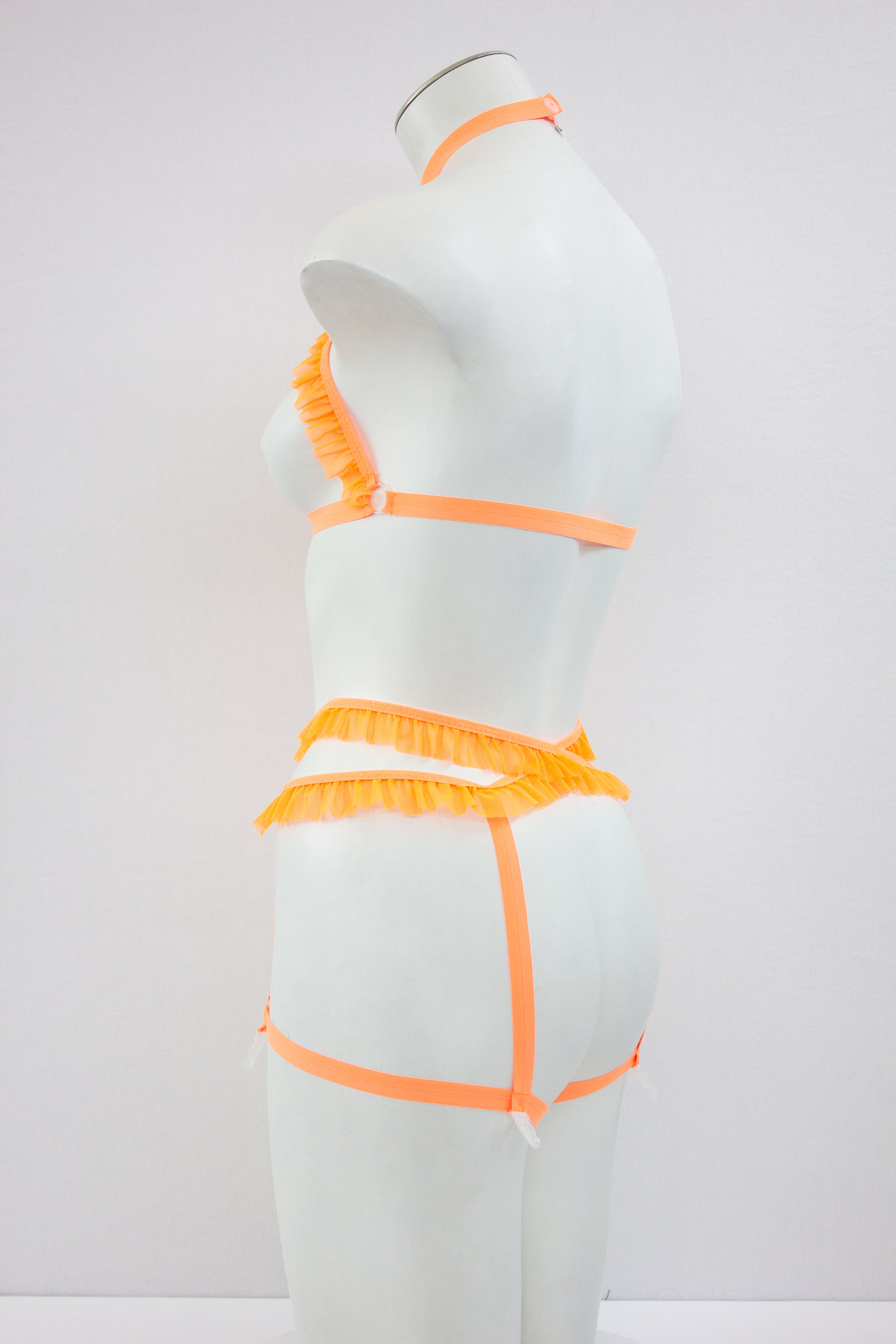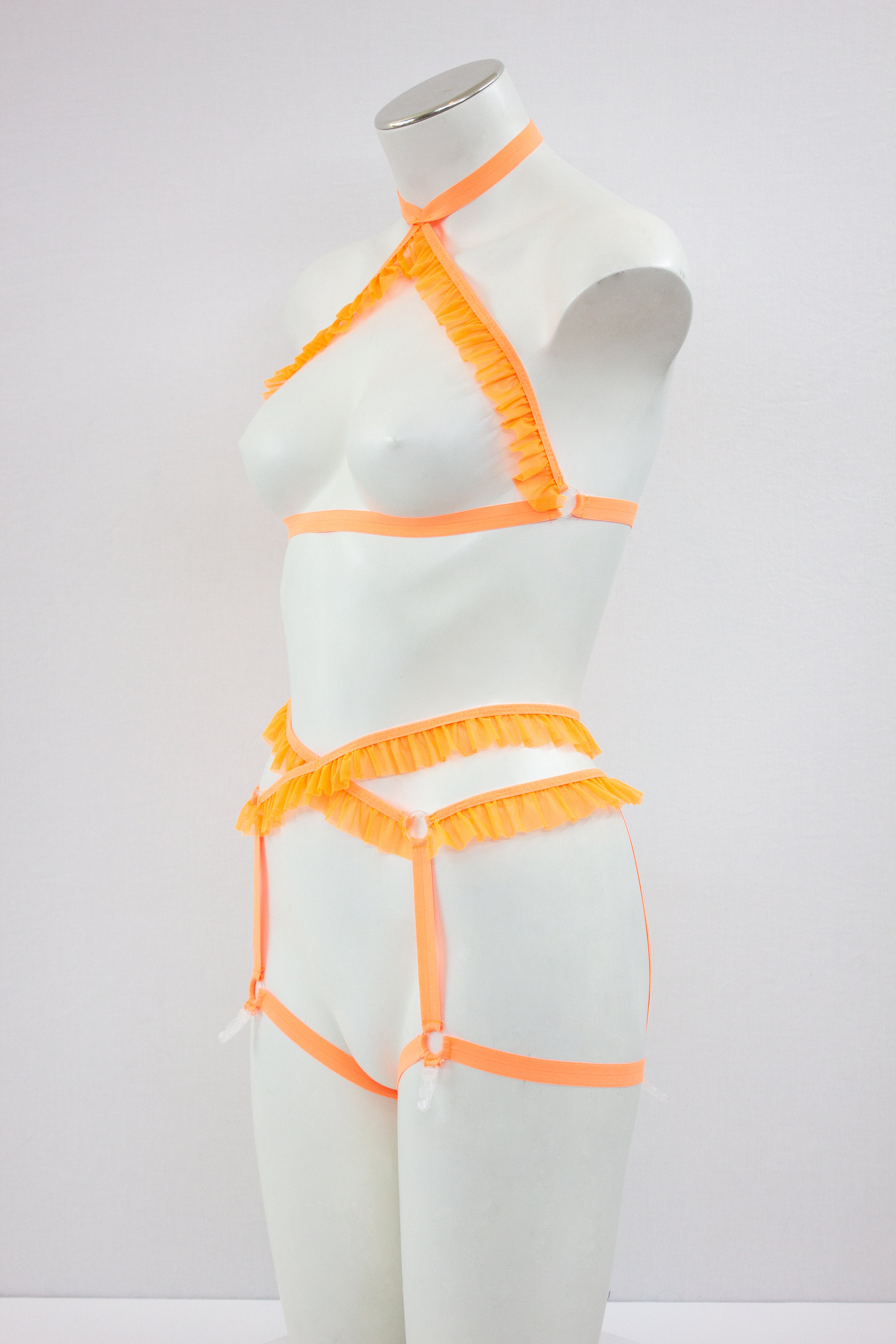 One and only of this set - soft and sensual, blush pink stretch strapping with a soft blush pink mesh ruffle trim in matching tone offers a unique look. Ballerina vibes flow through this soft and gentle feeling harness set. Lite and effervescent, strong and beautiful, just like you. Pick this harness if you feel it will match your soul and it will help you show off your life energy wherever you go.