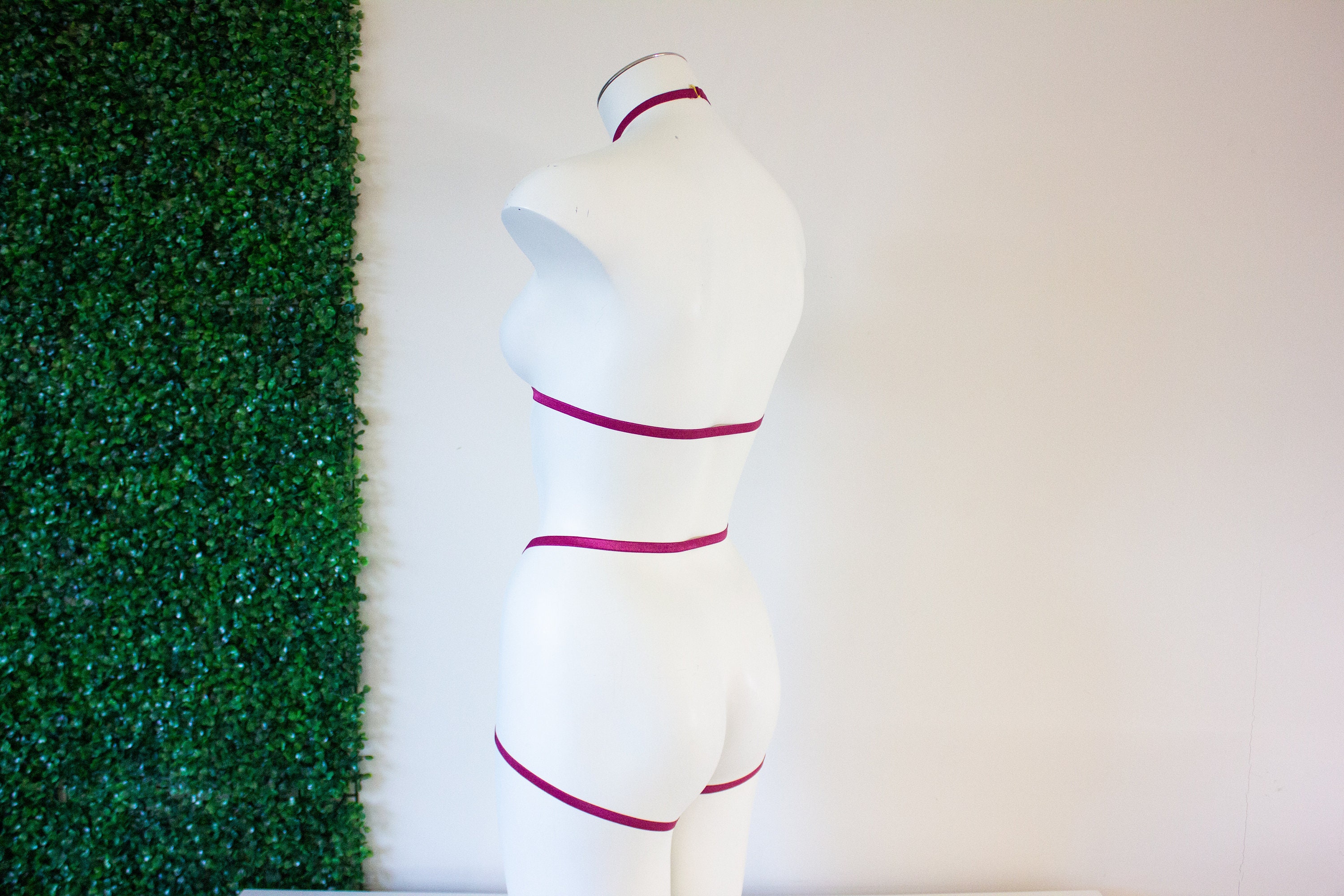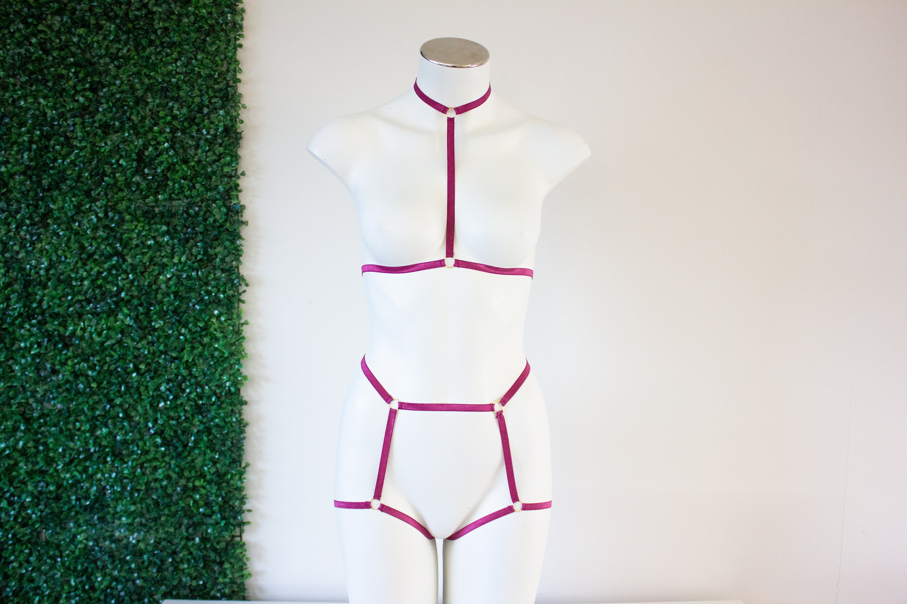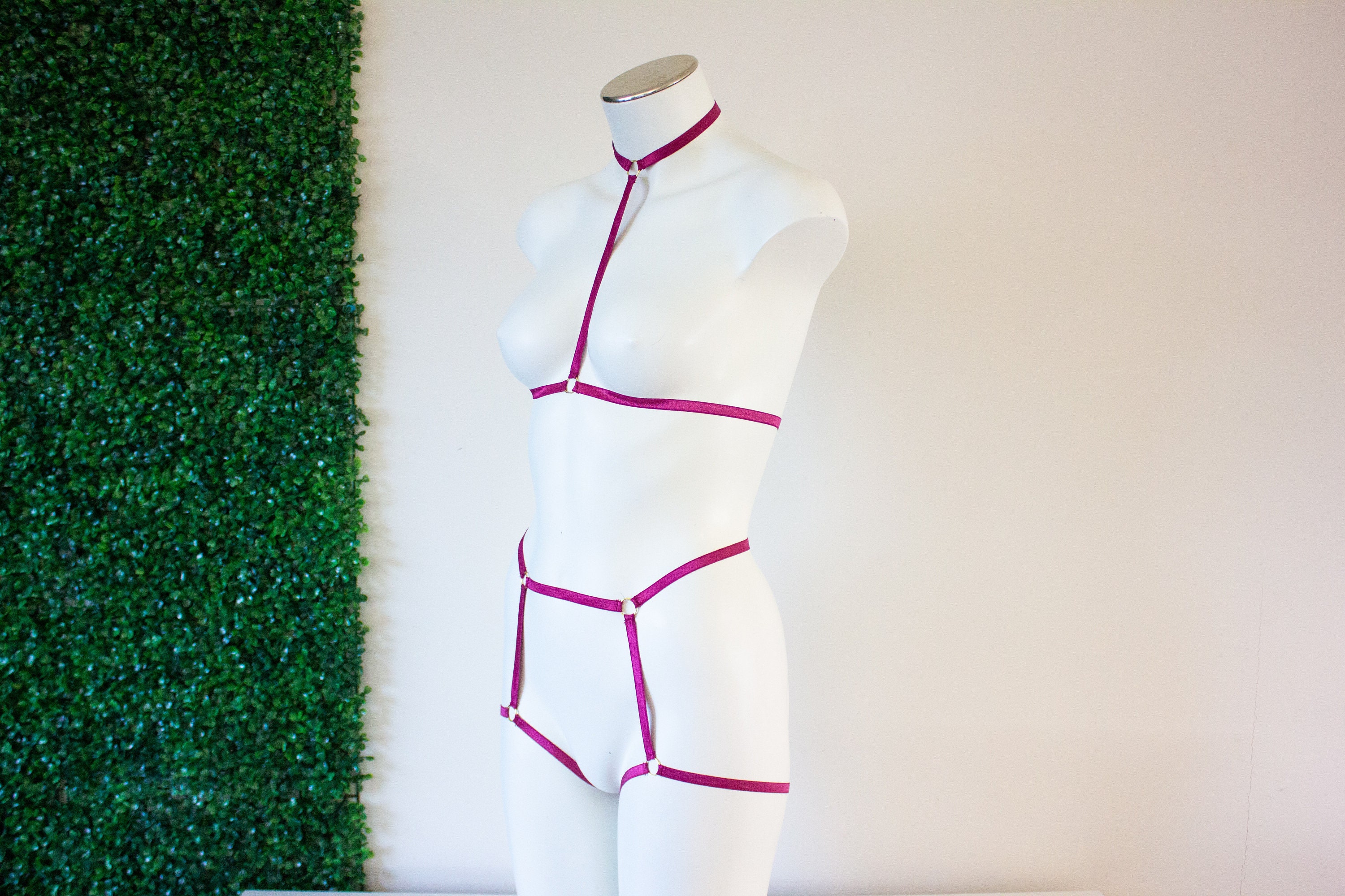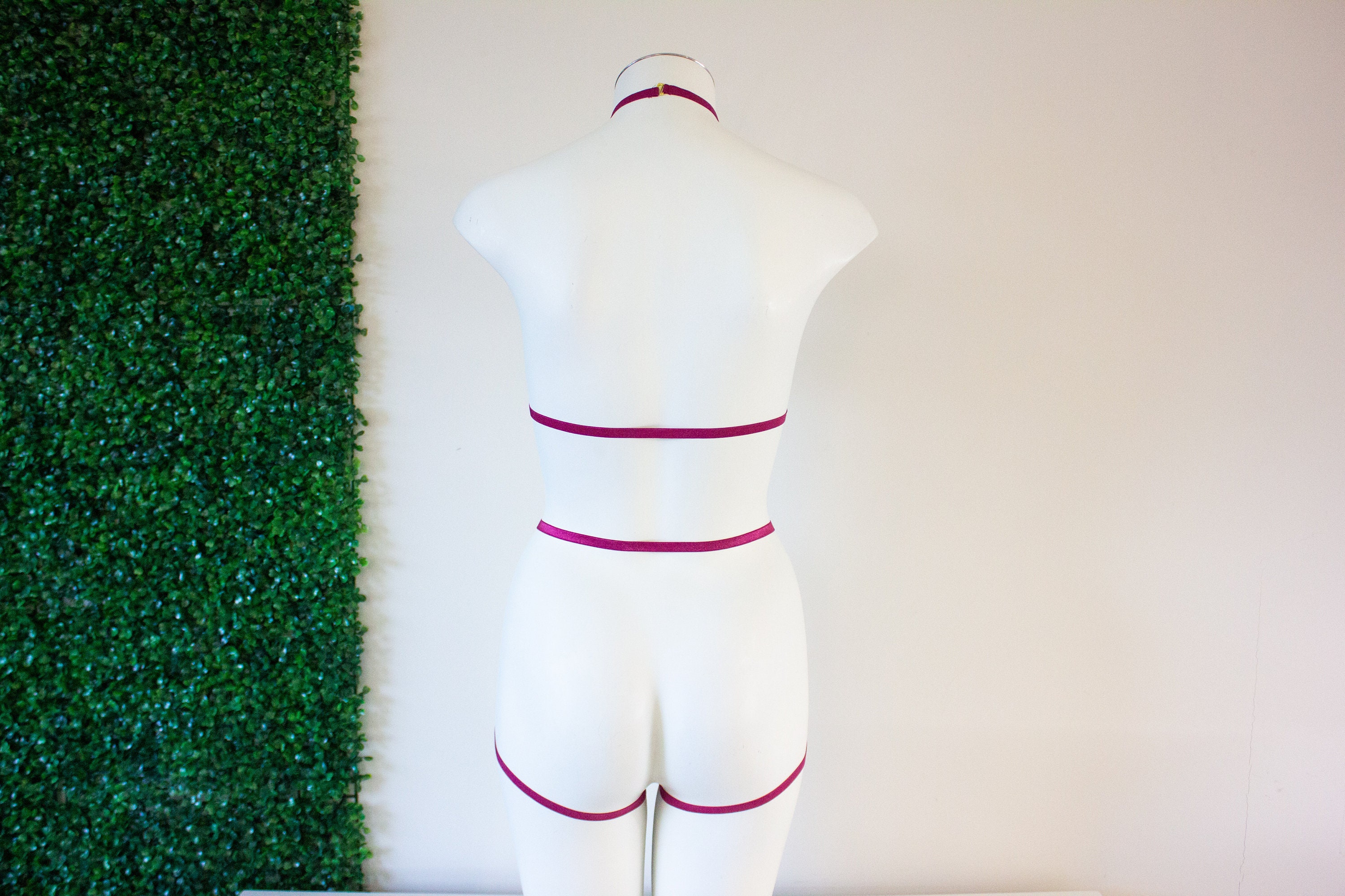 Burgundy Wine Red Sexy Spaghetti Thin Strappy Dance Rave Festival Halter Top Cage Bralette High Waist Booty Short Body Harness Lingerie Set