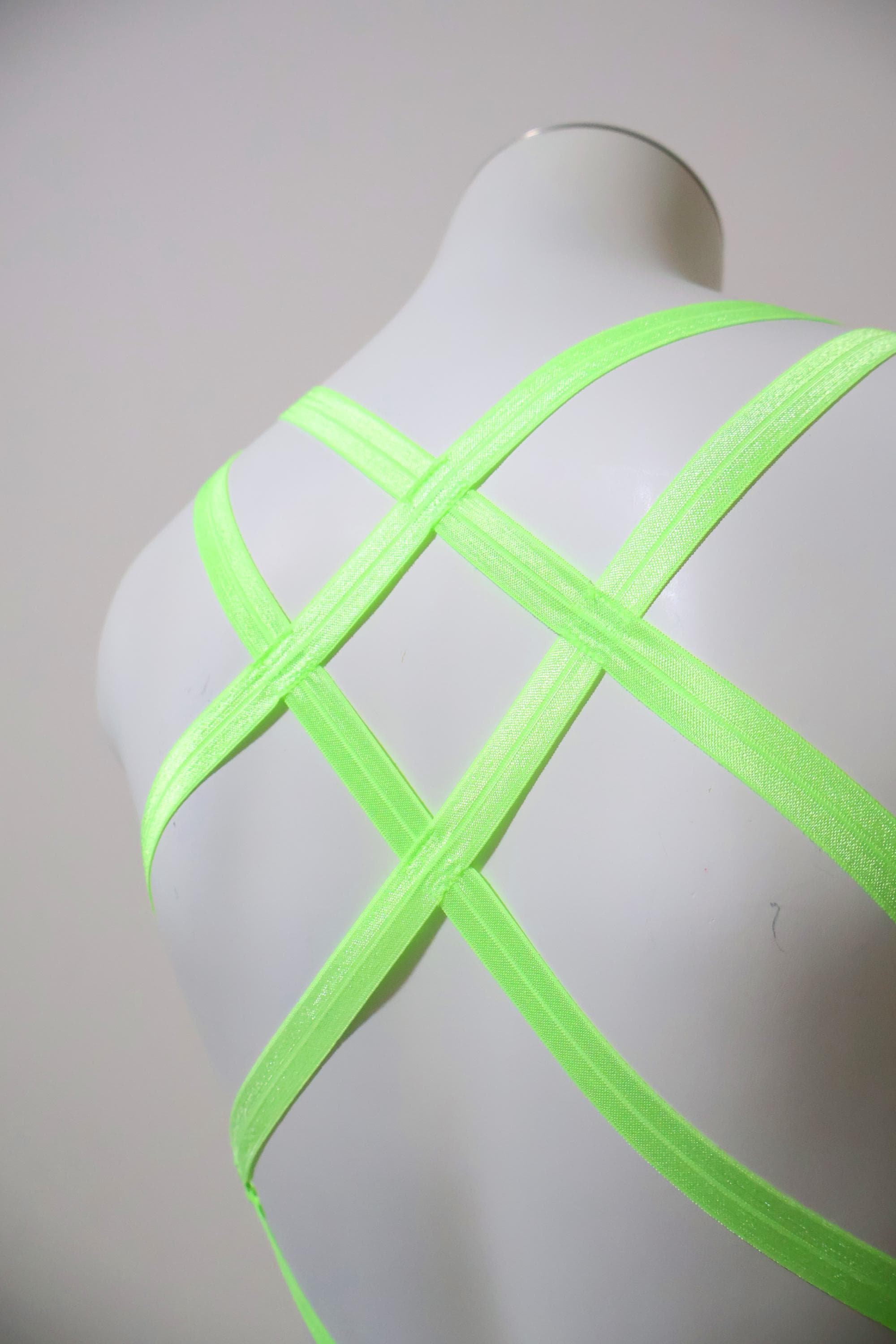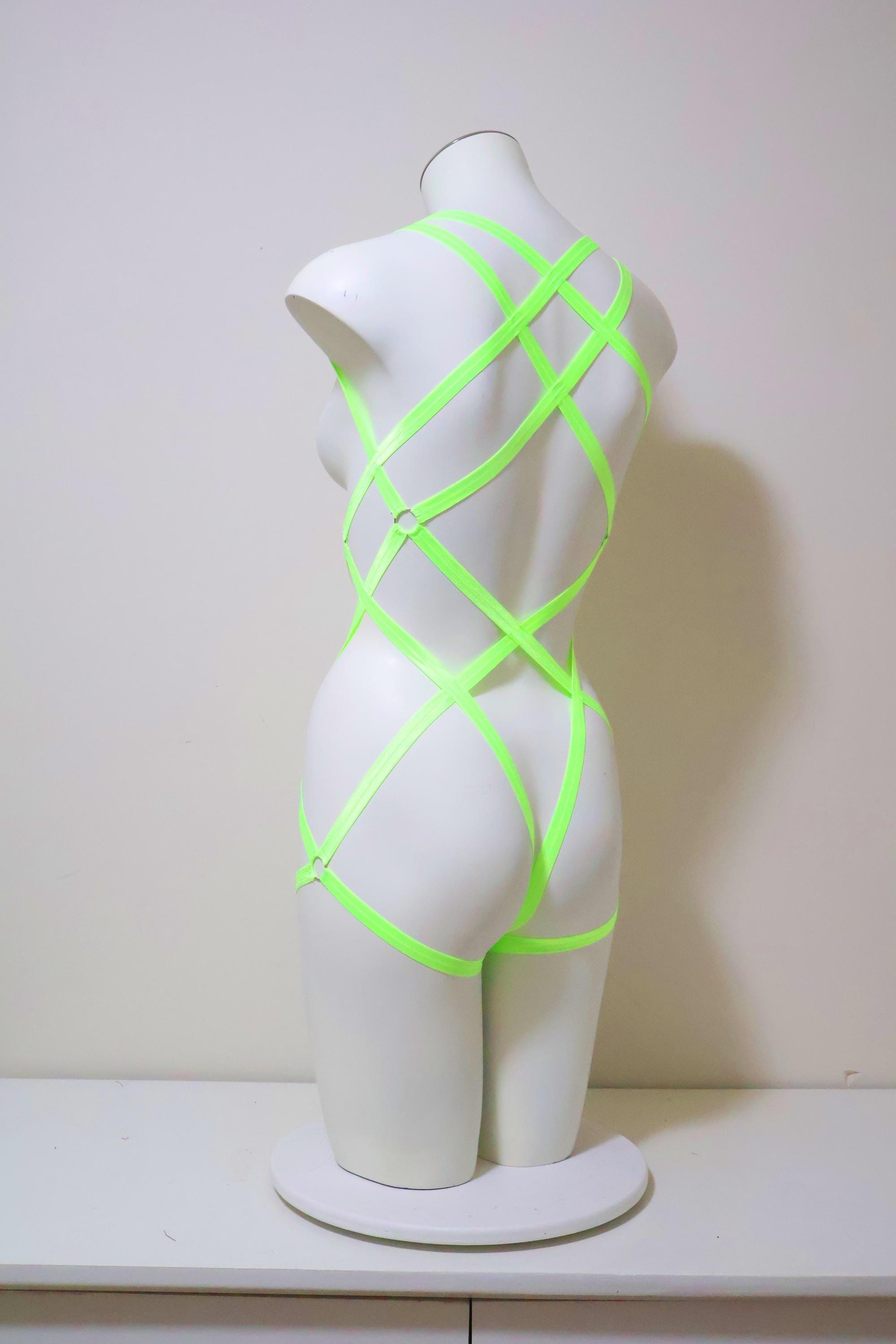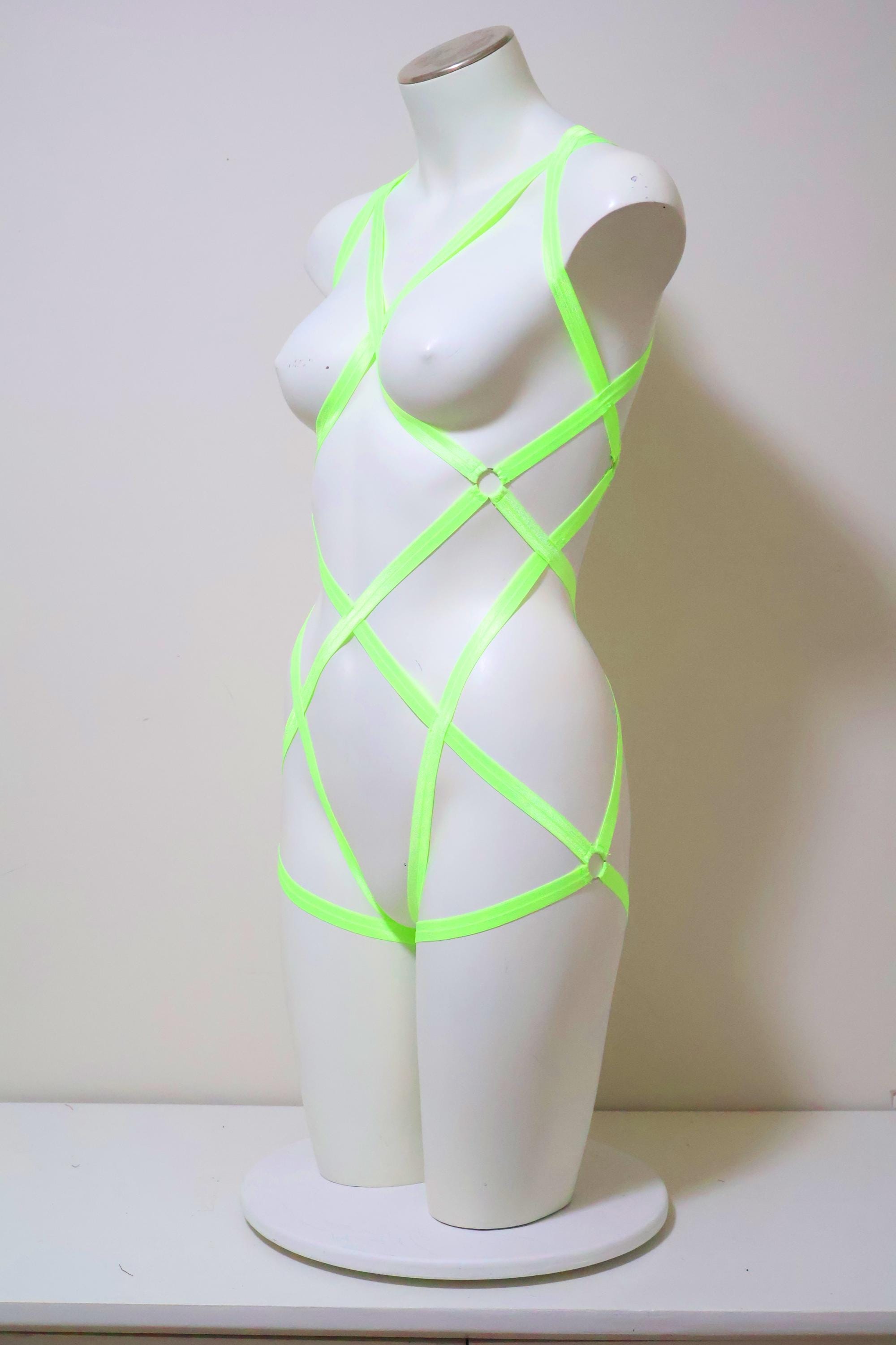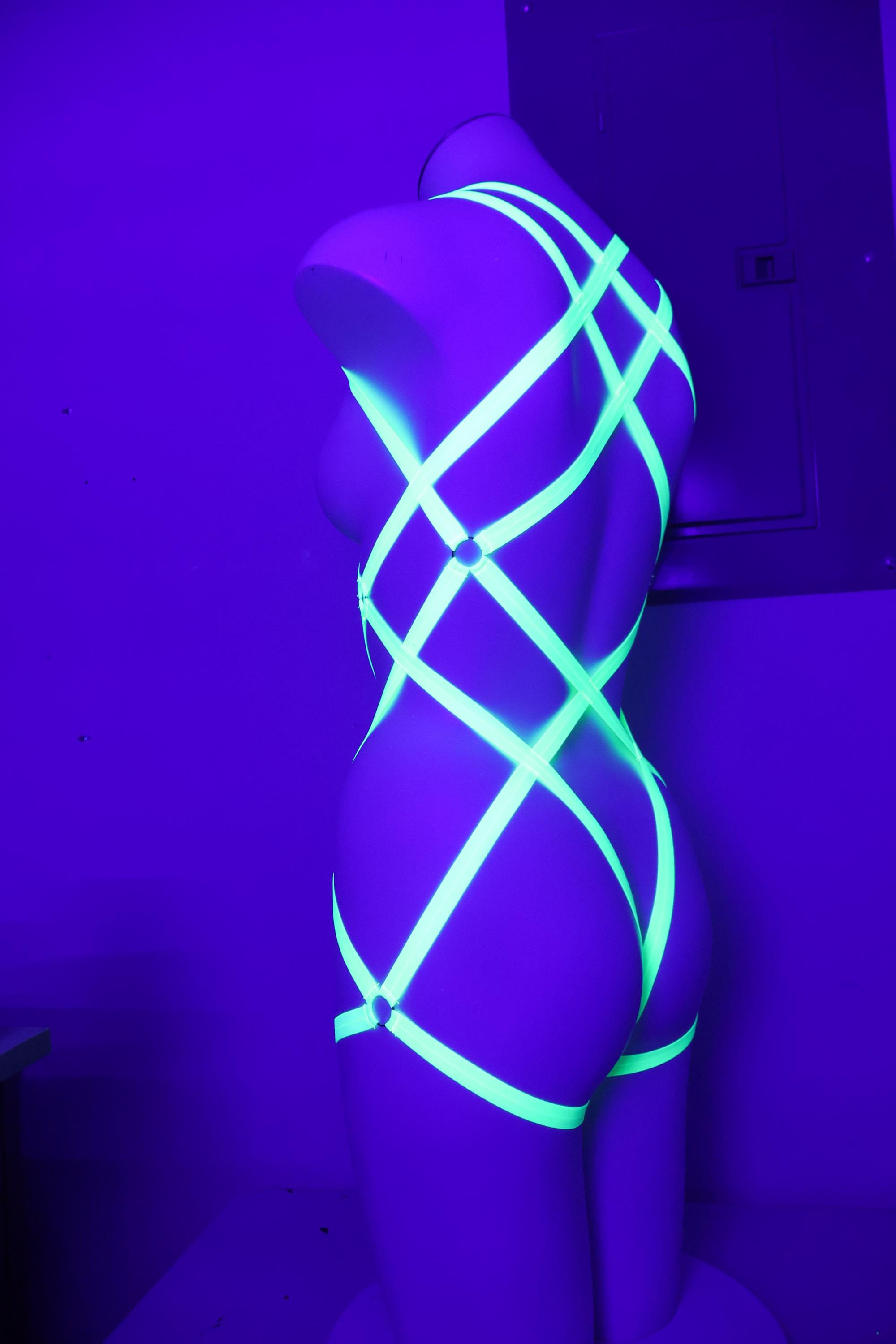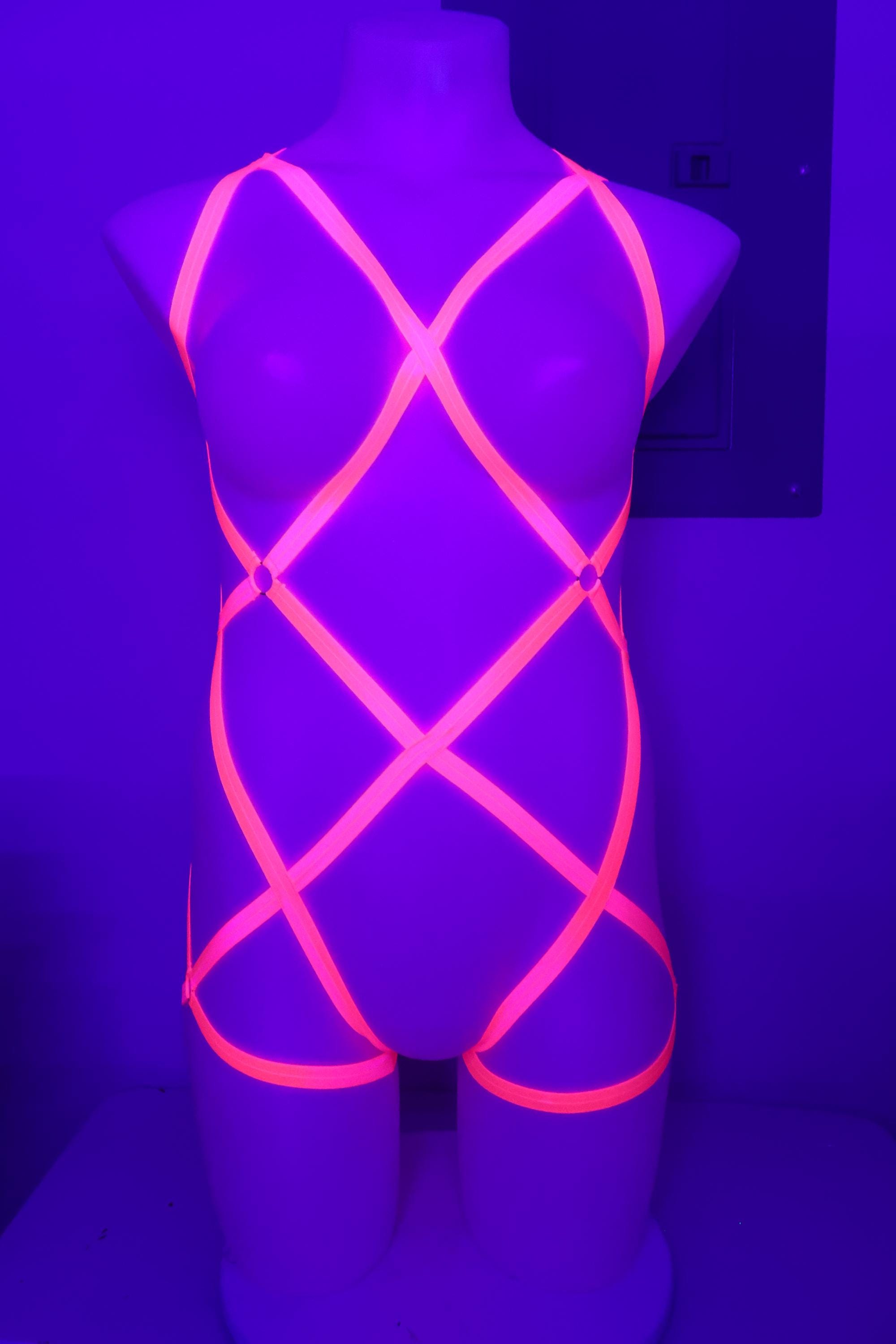DIAMONDS Neon Glow Body Harness Bodysuit Lingerie: Exotic Pole Work Dance Costume, Stretch Elastic Geometric Patterned Cage Rave Festival Outfit