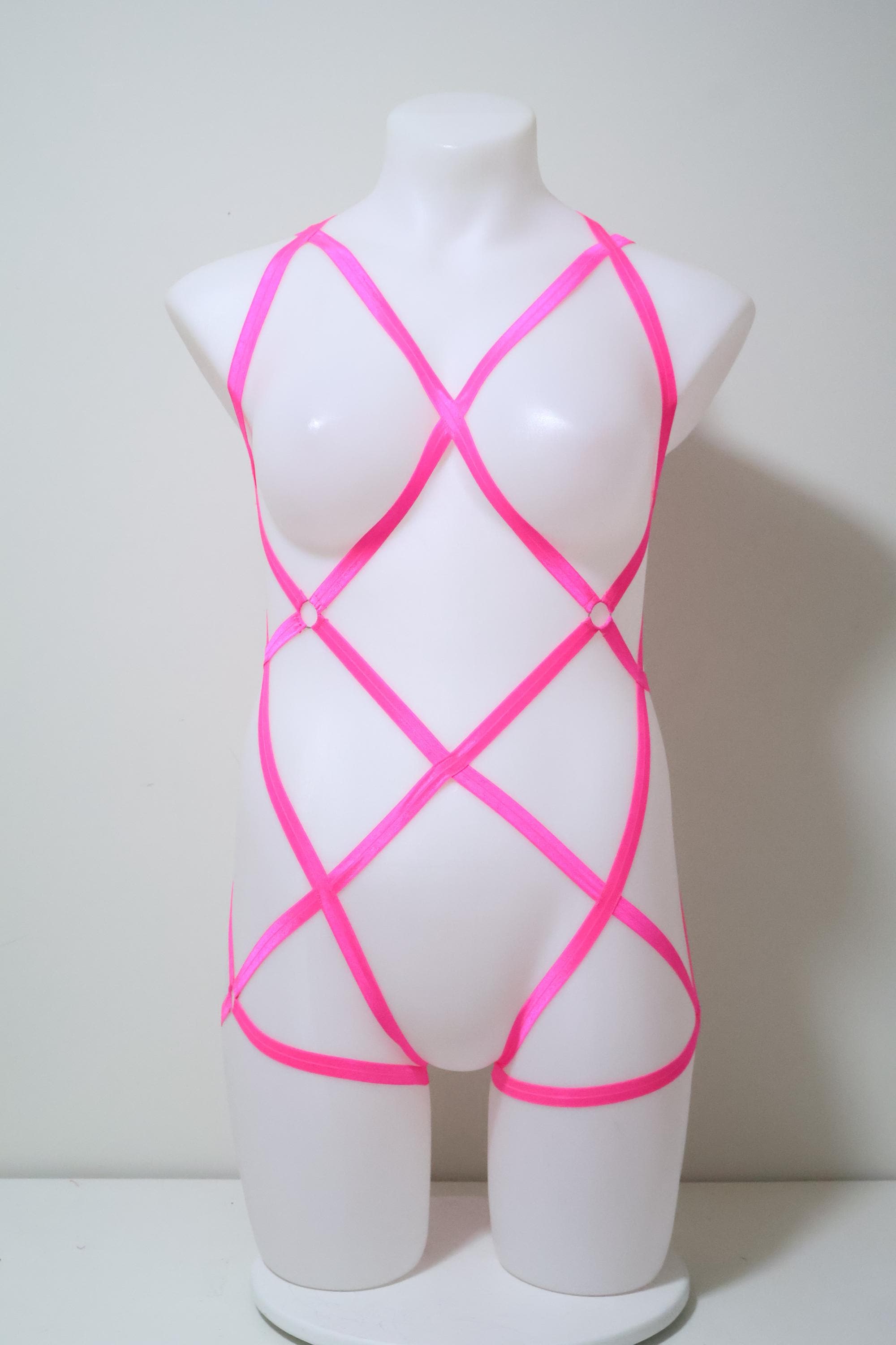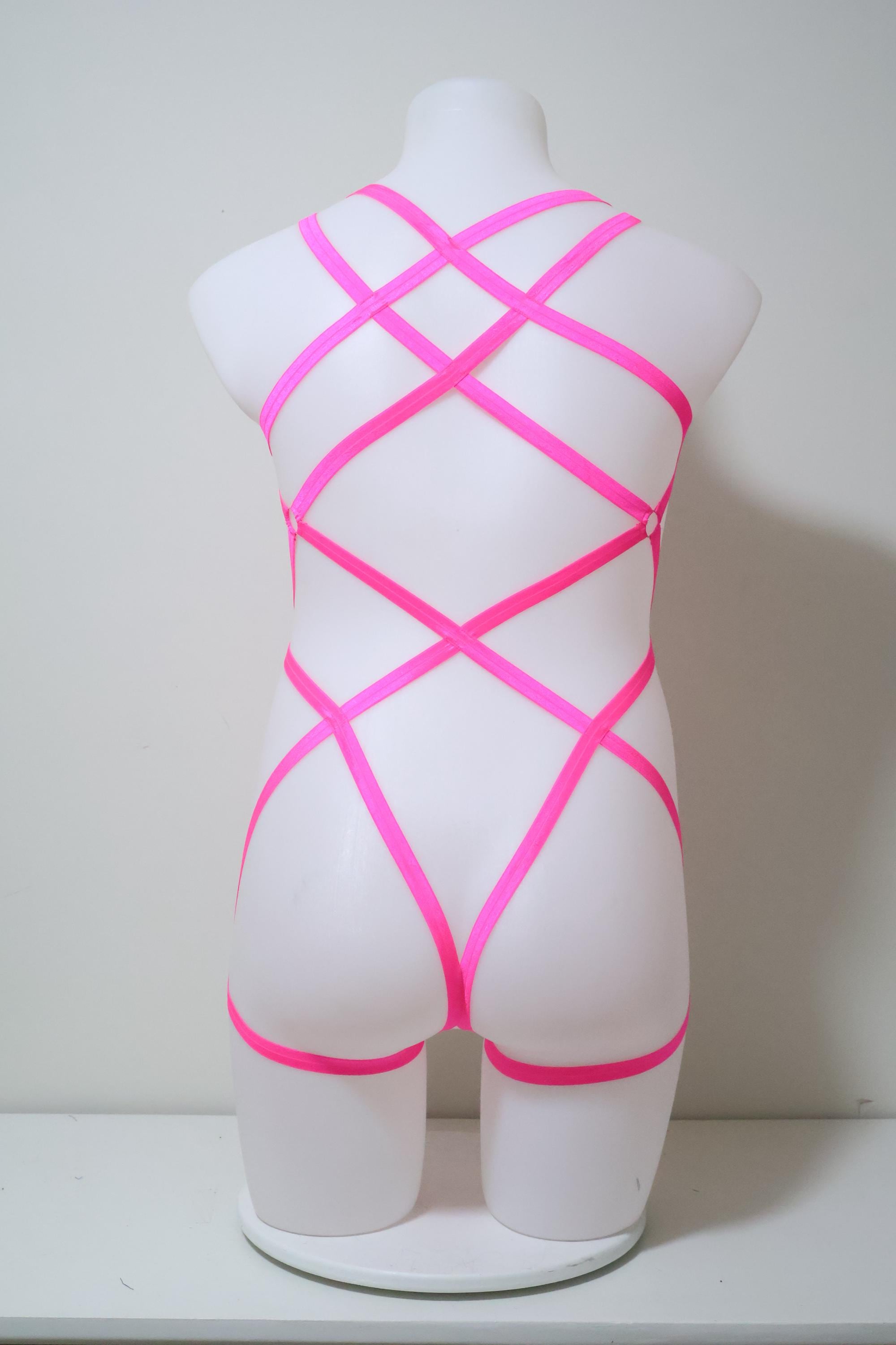 Style: Full body thong bodysuit body harness. Halter neck with snap closure.