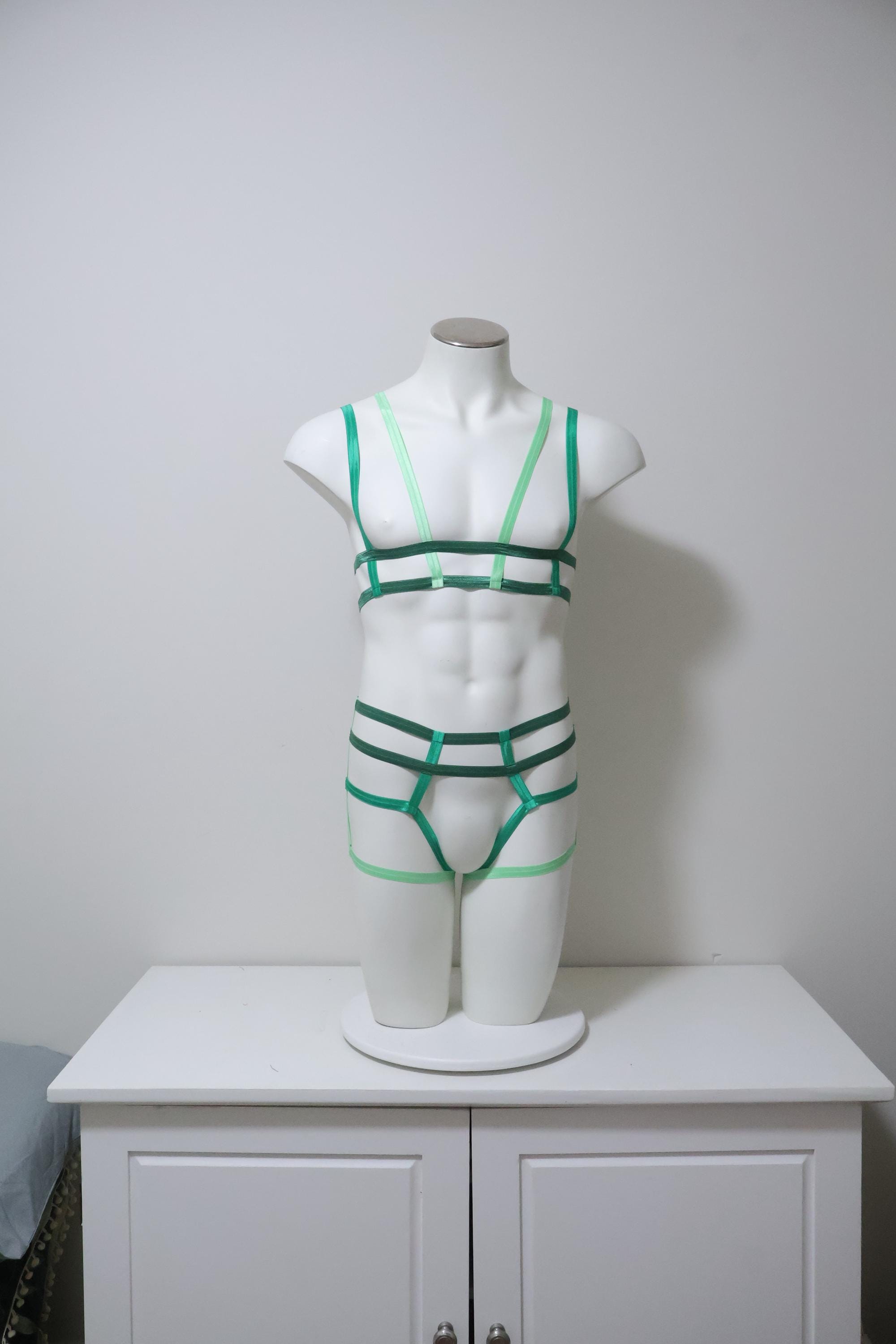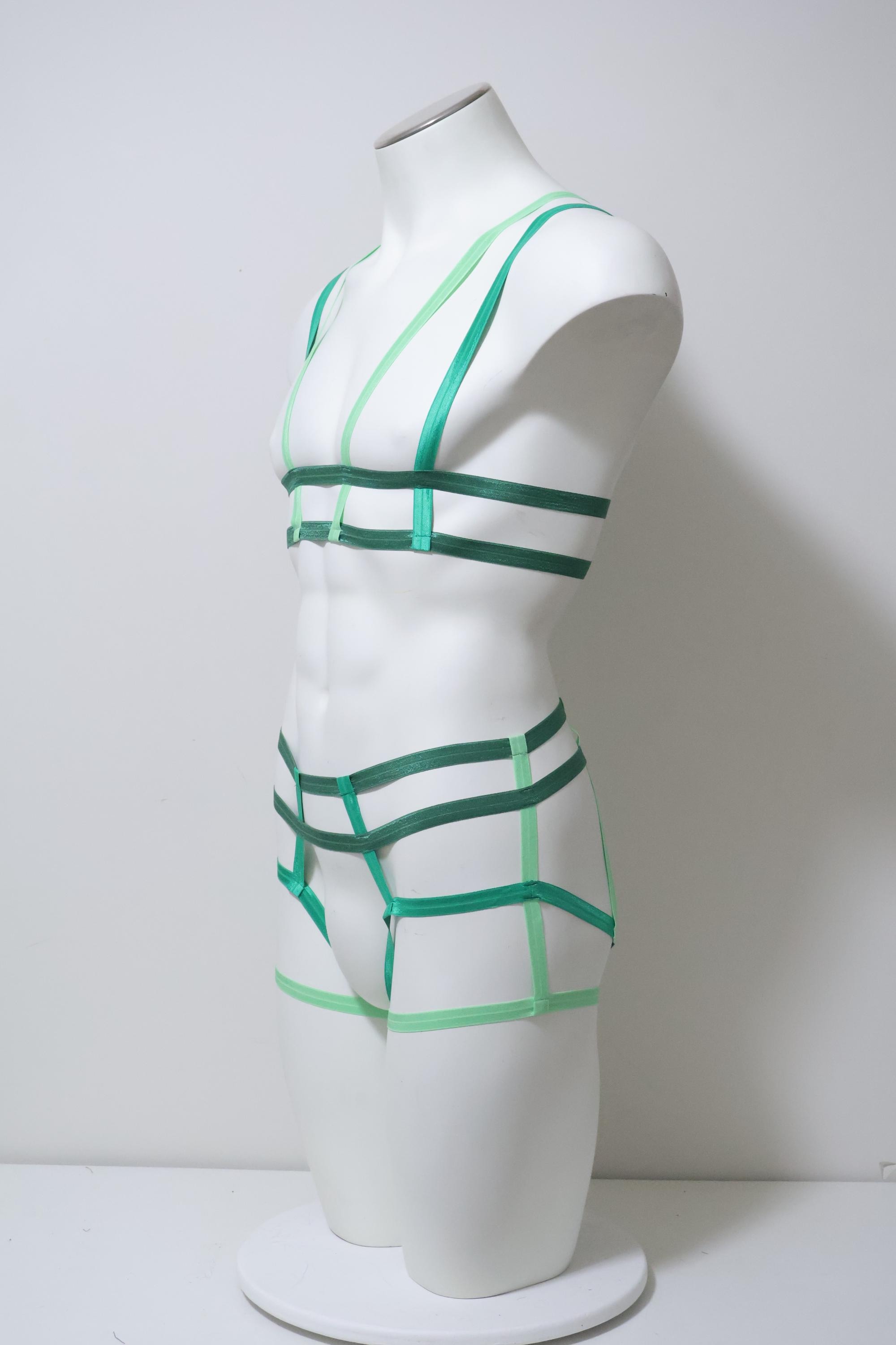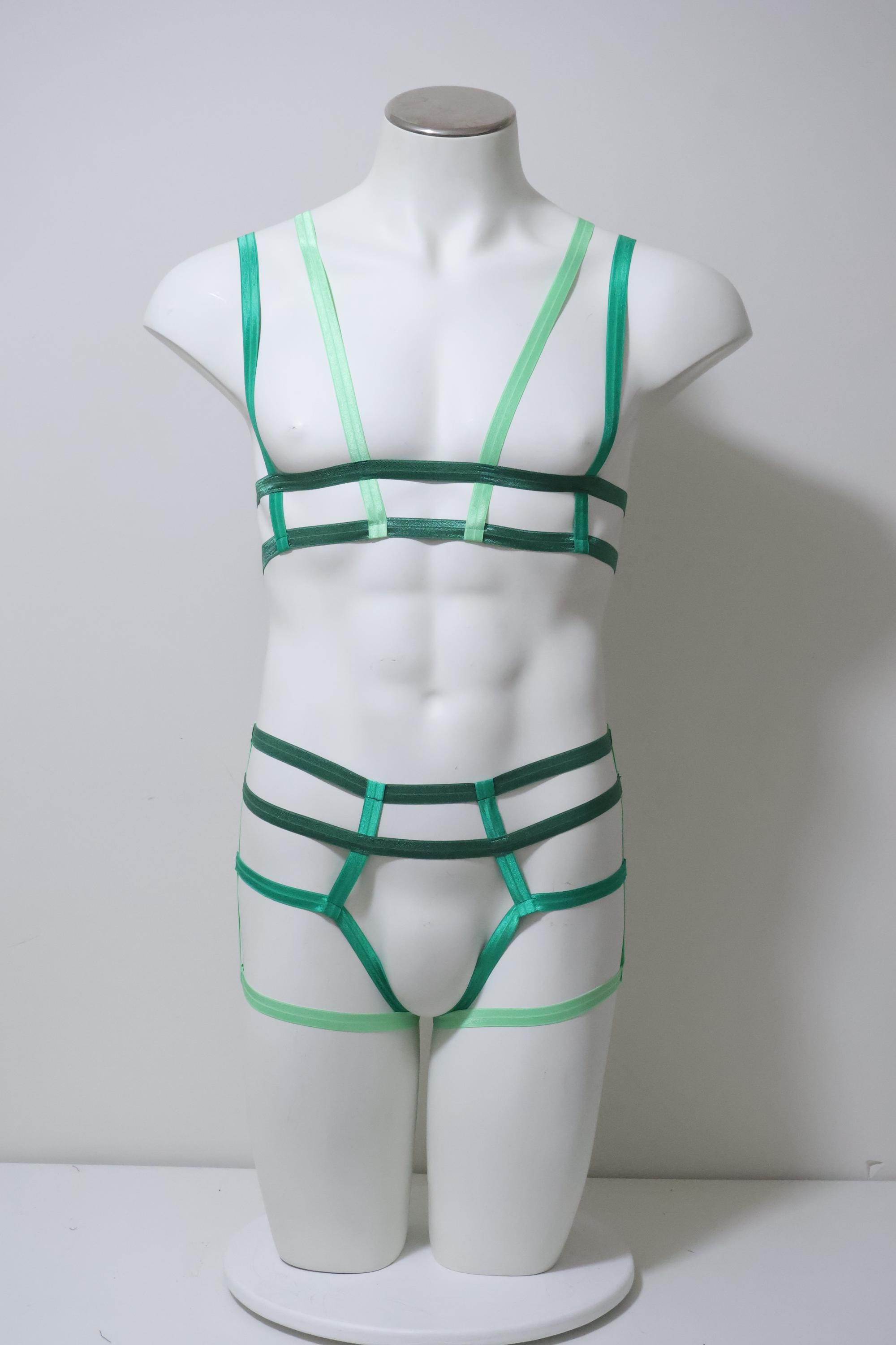 Mens Stretch Body Harness Lingerie Set: Ombre Multi Color Cage Outfit, Festival Rave Costume, Sexy Strappy Booty Shorts and Top