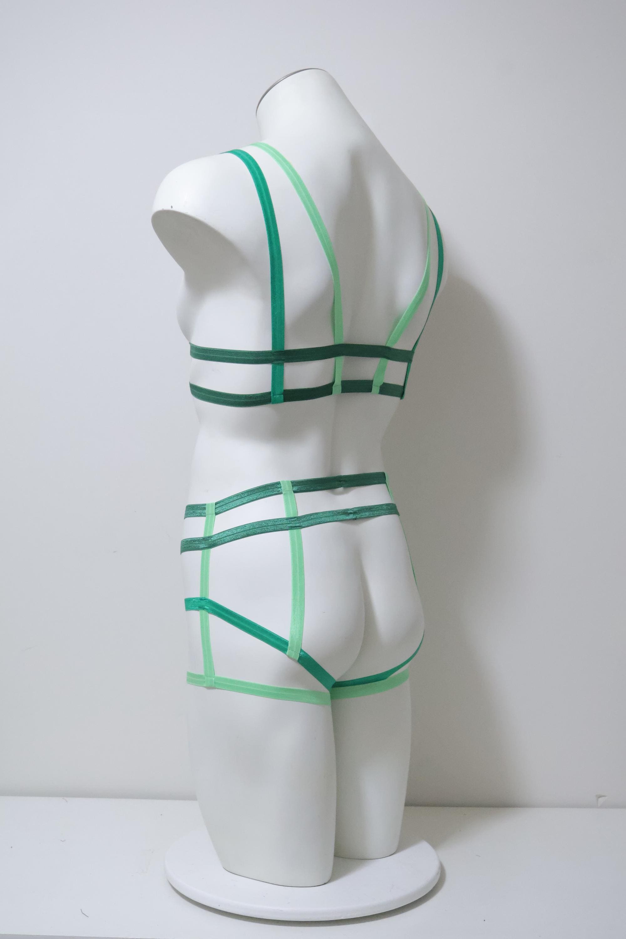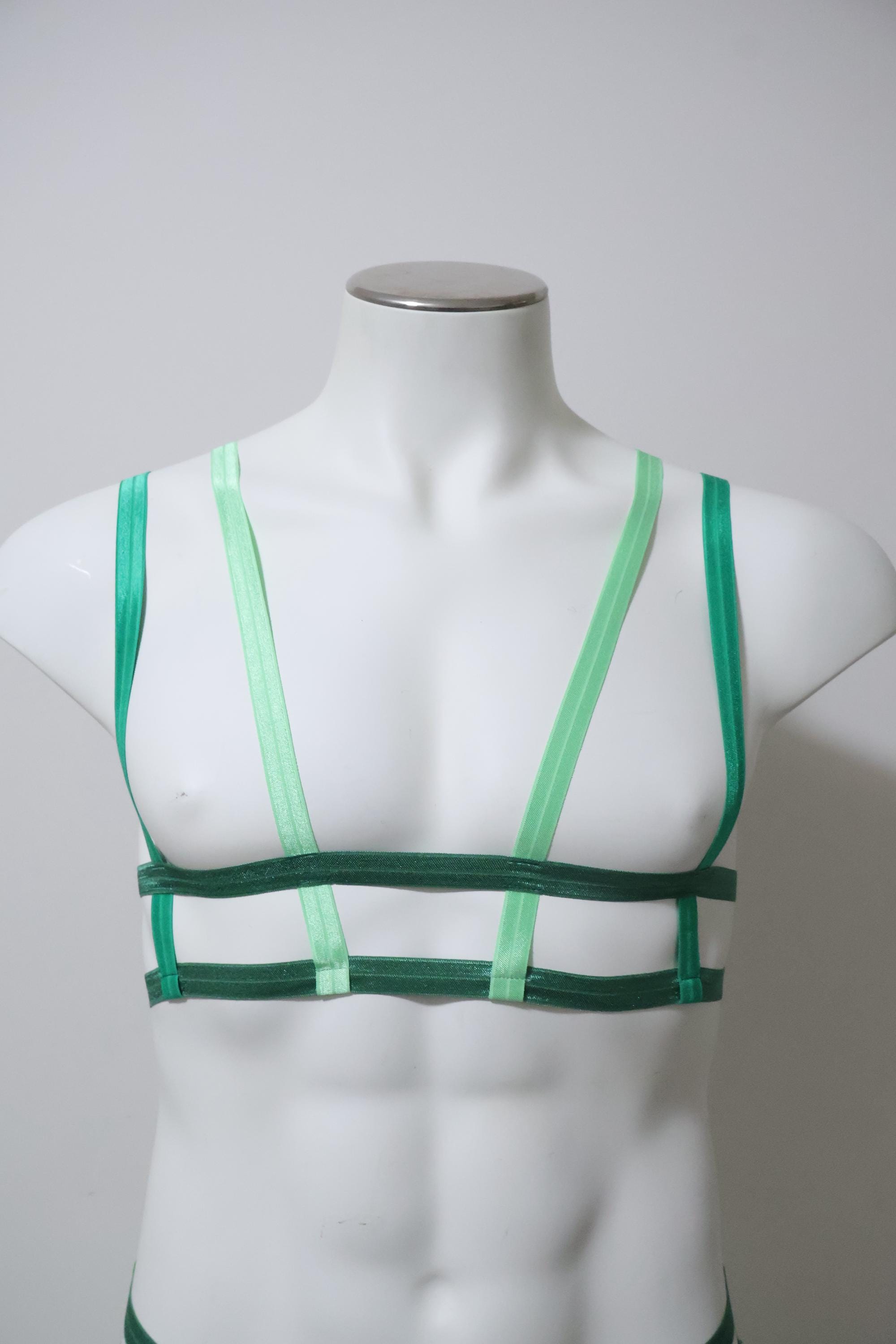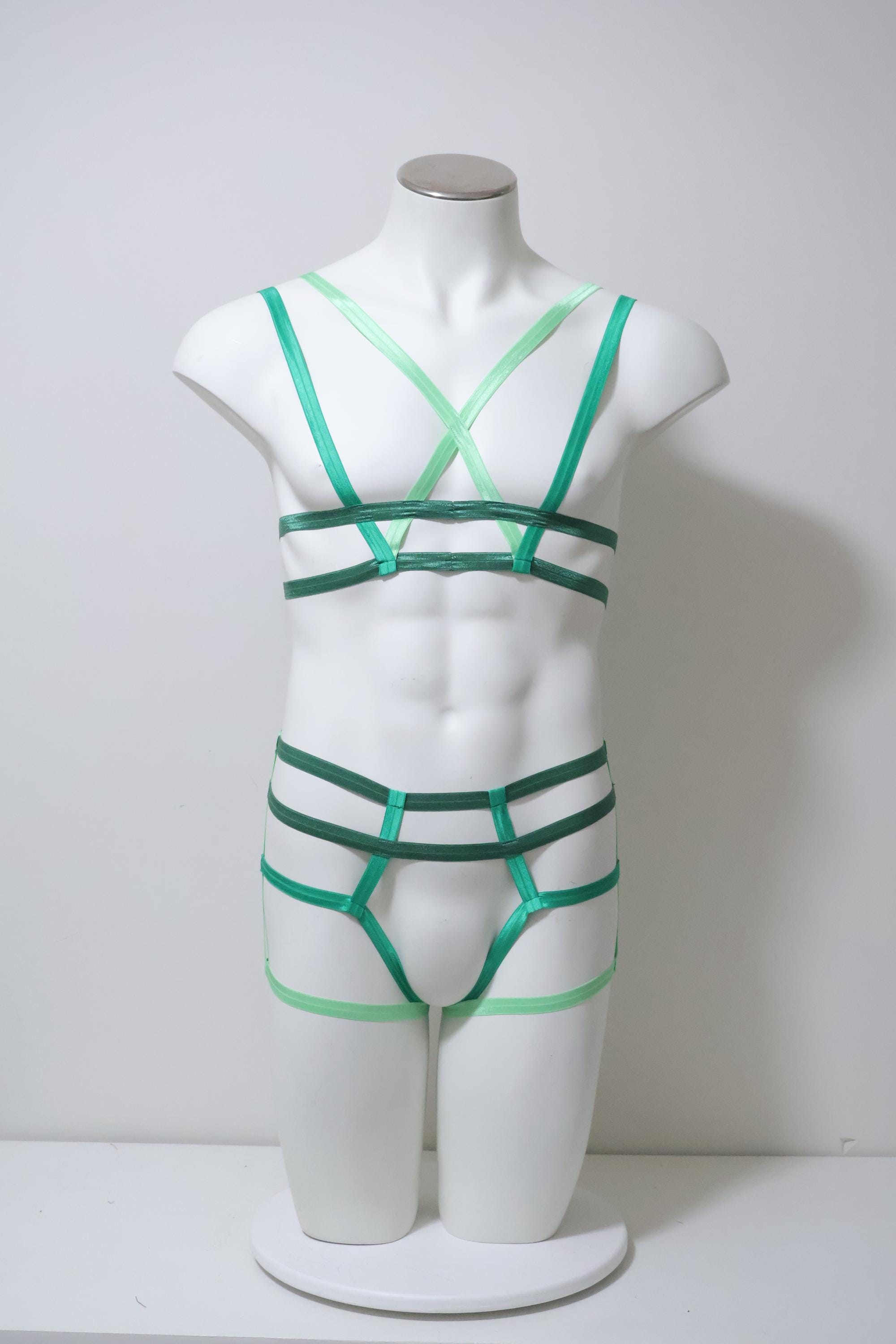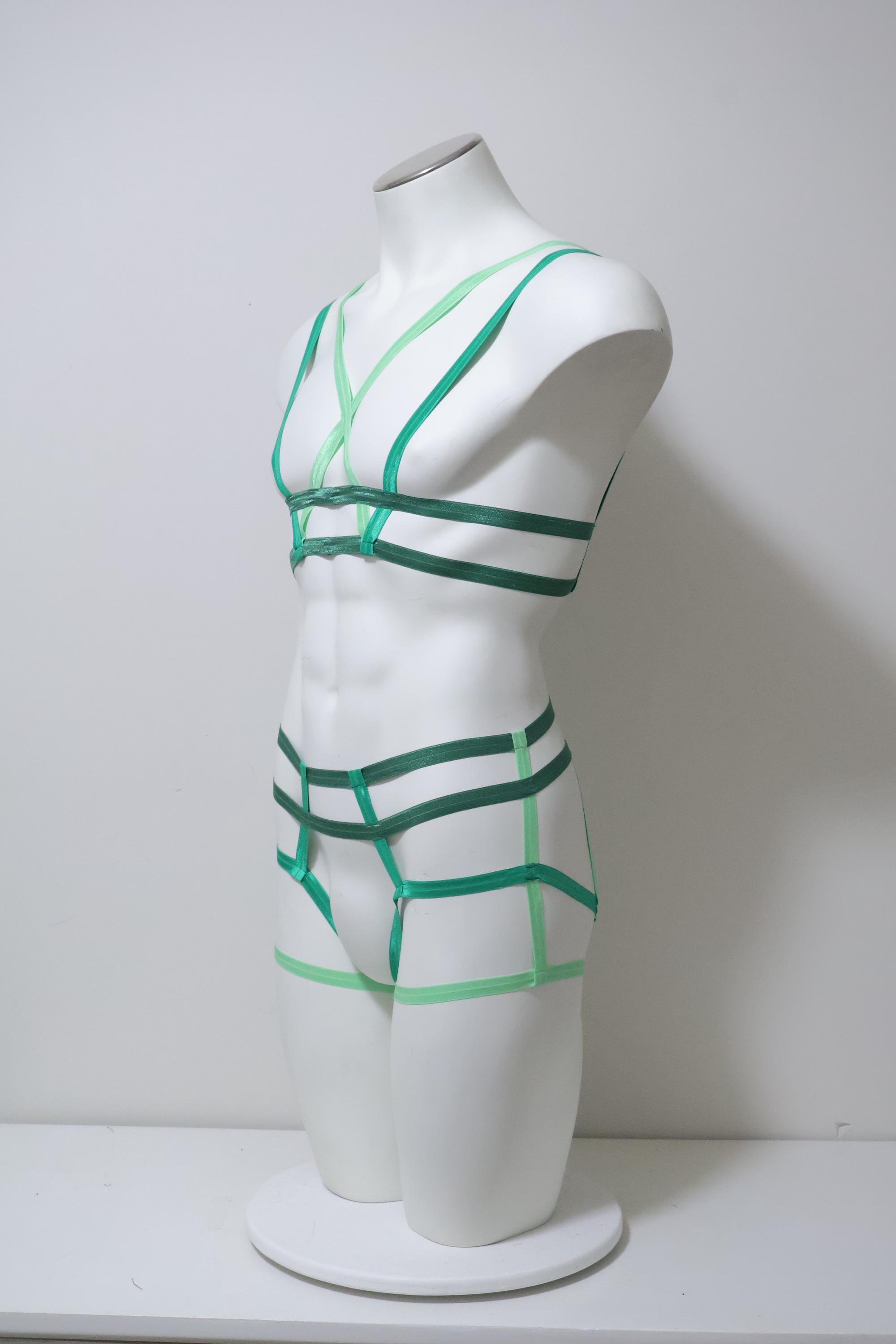 Mens Stretch Body Harness Lingerie Set: Ombre Multi Color Cage Outfit, Festival Rave Costume, Sexy Strappy Booty Shorts and Top