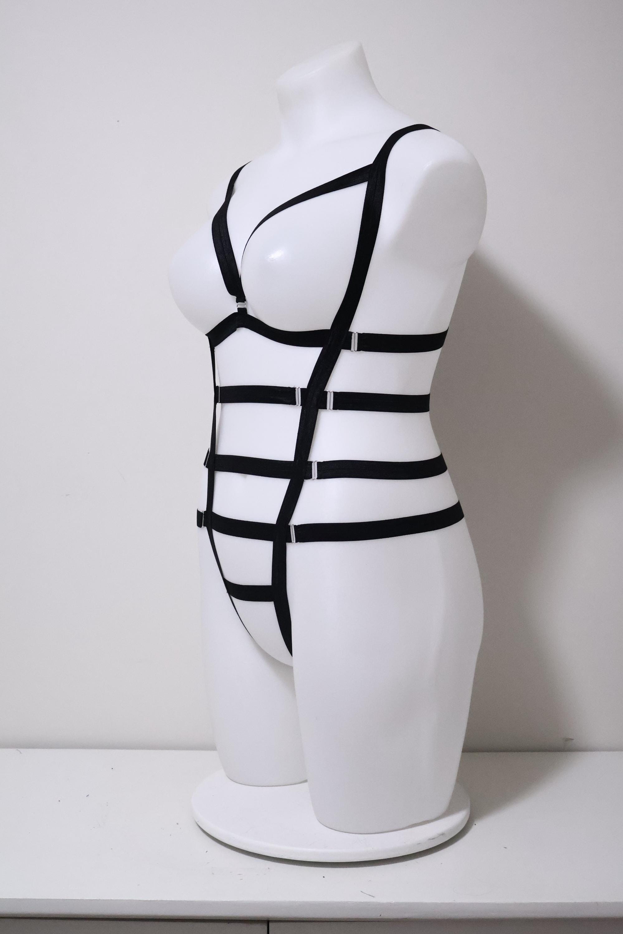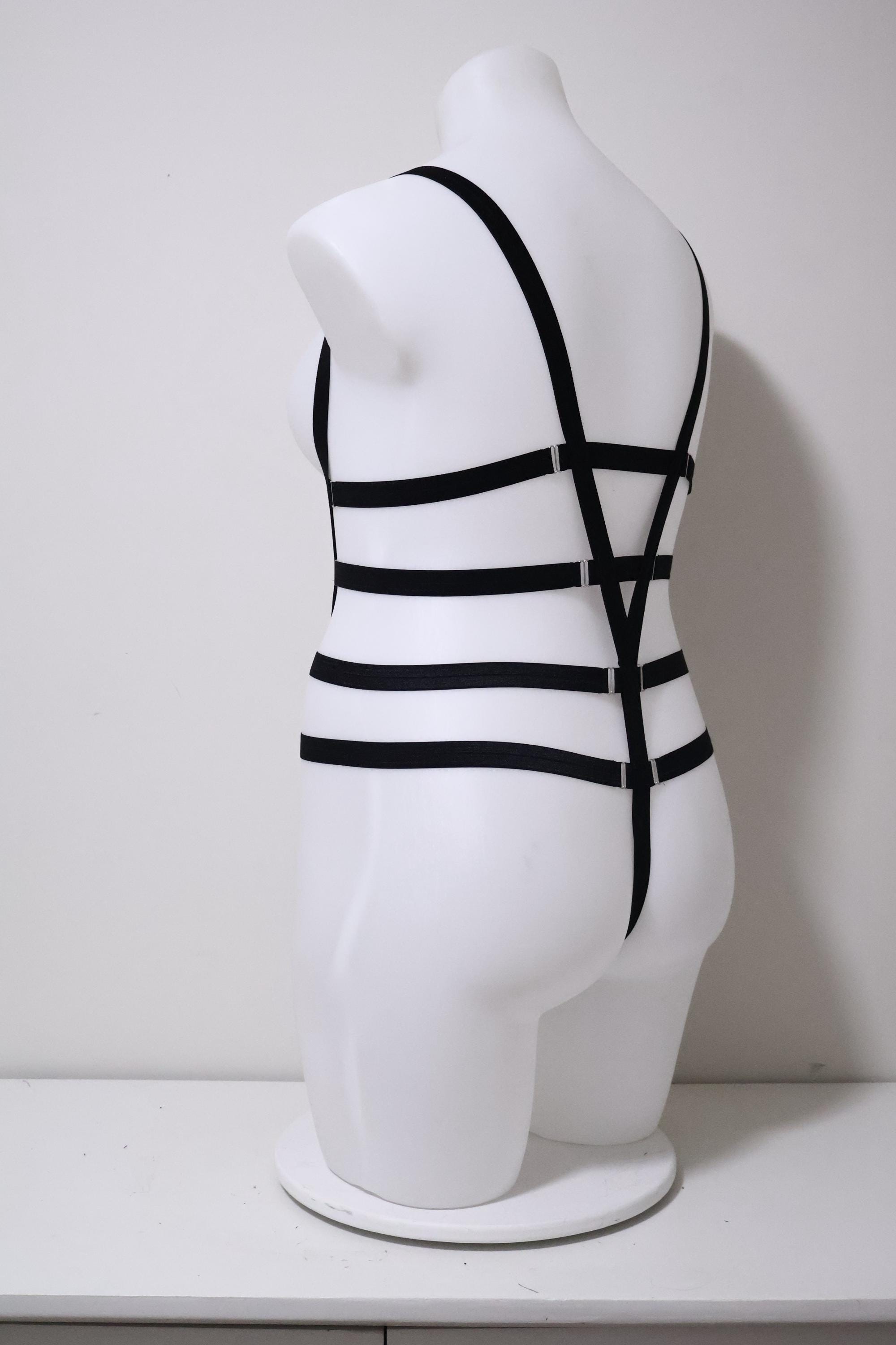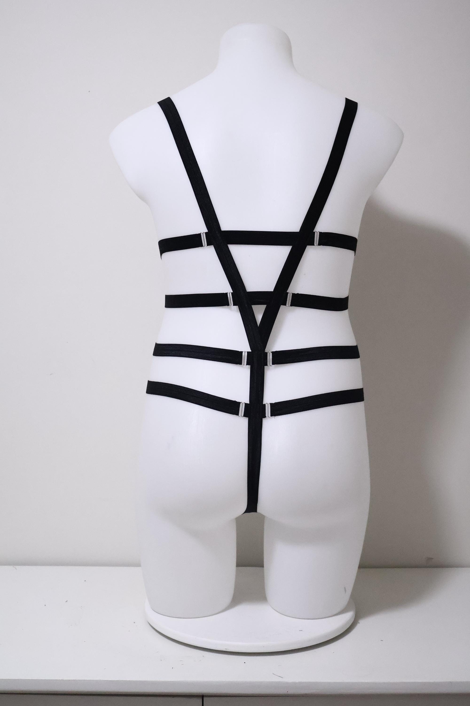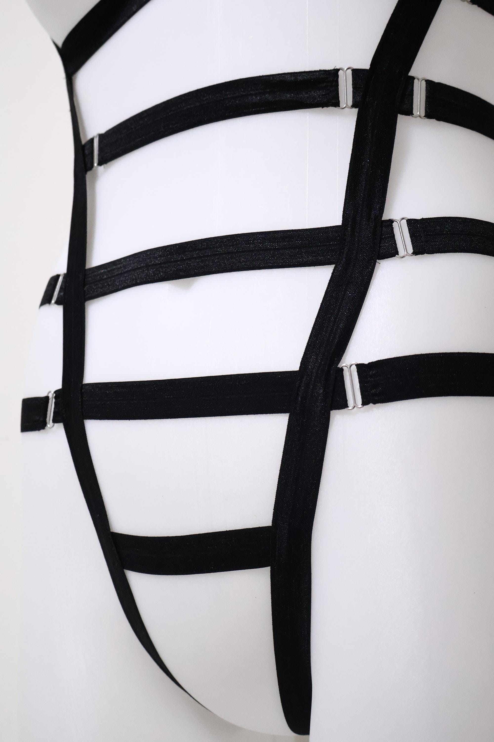 Style: Full body thong bodysuit body harness. Halter neck with snap closure.