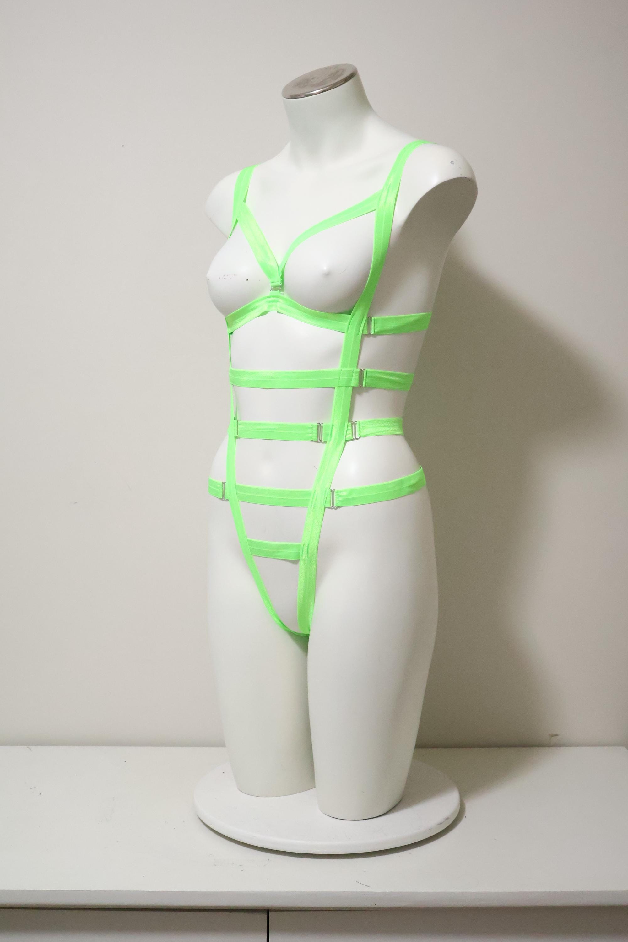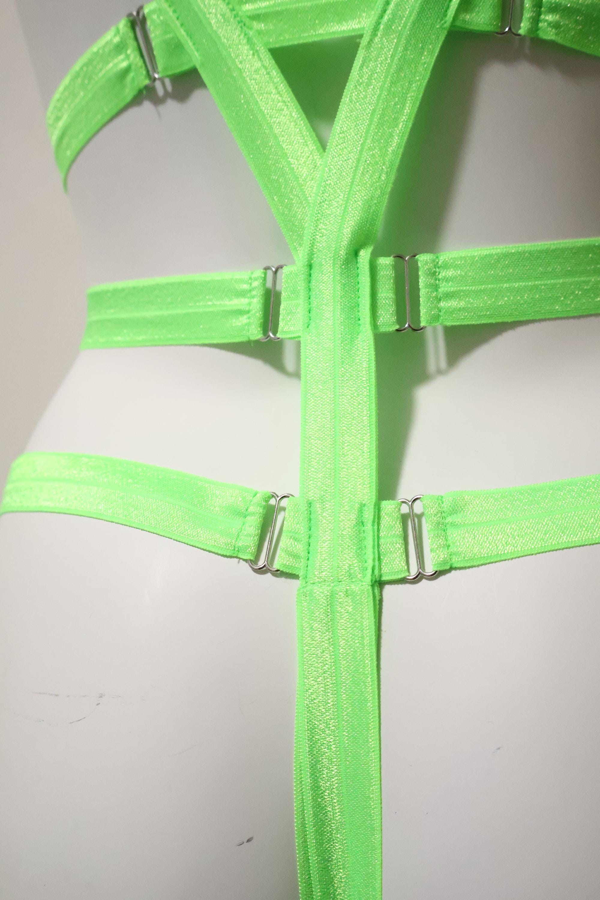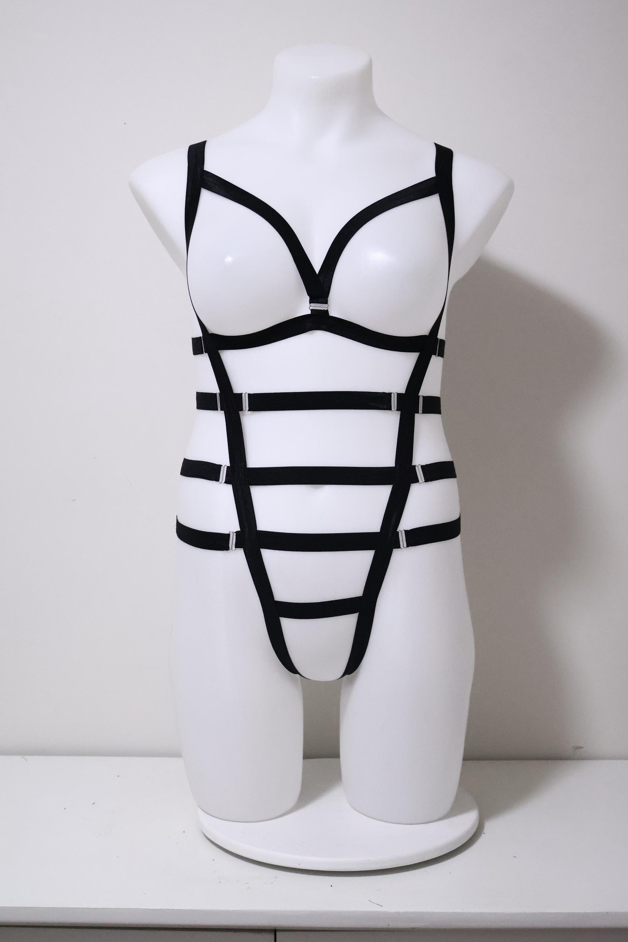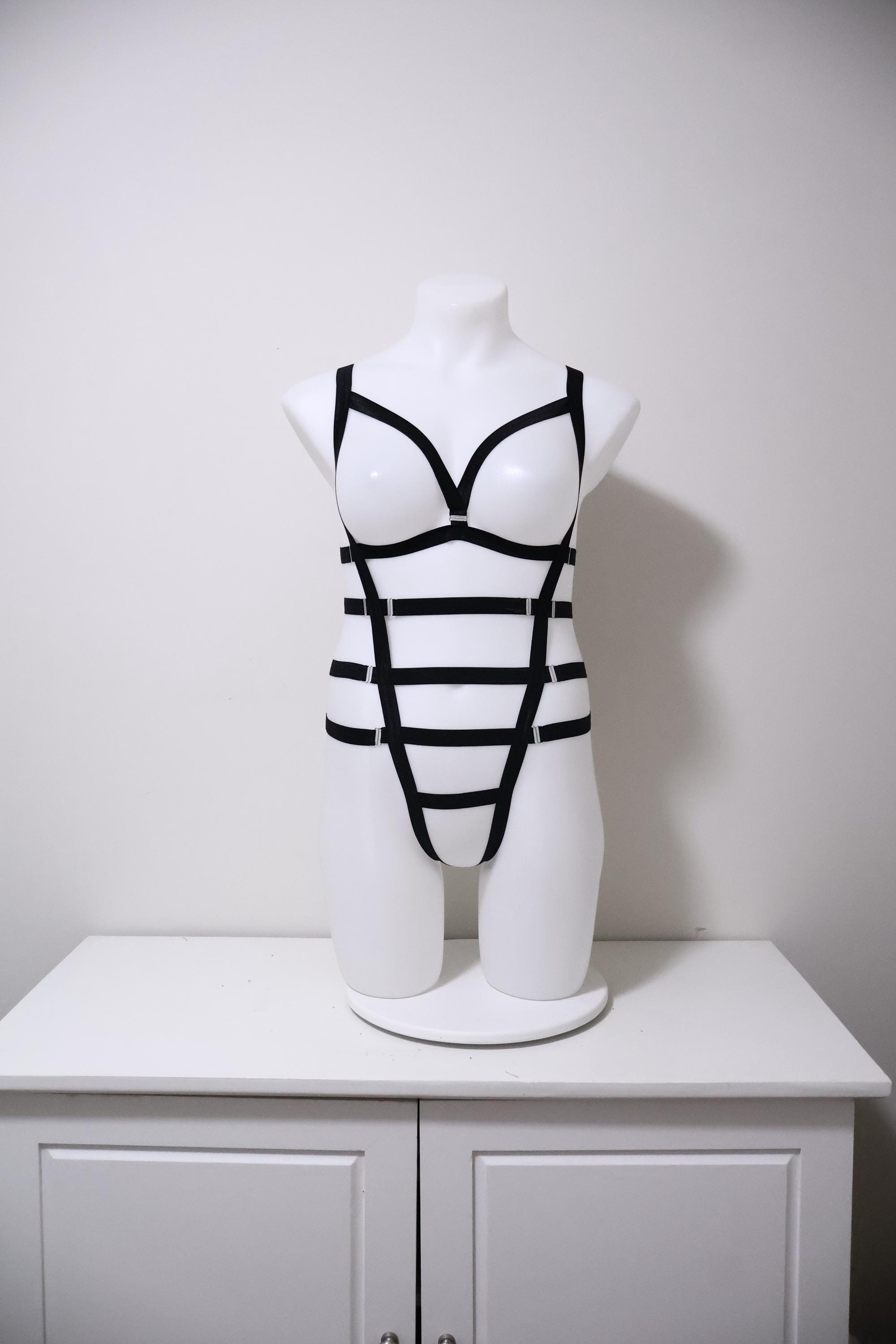 Style: Full body thong bodysuit body harness. Halter neck with snap closure.