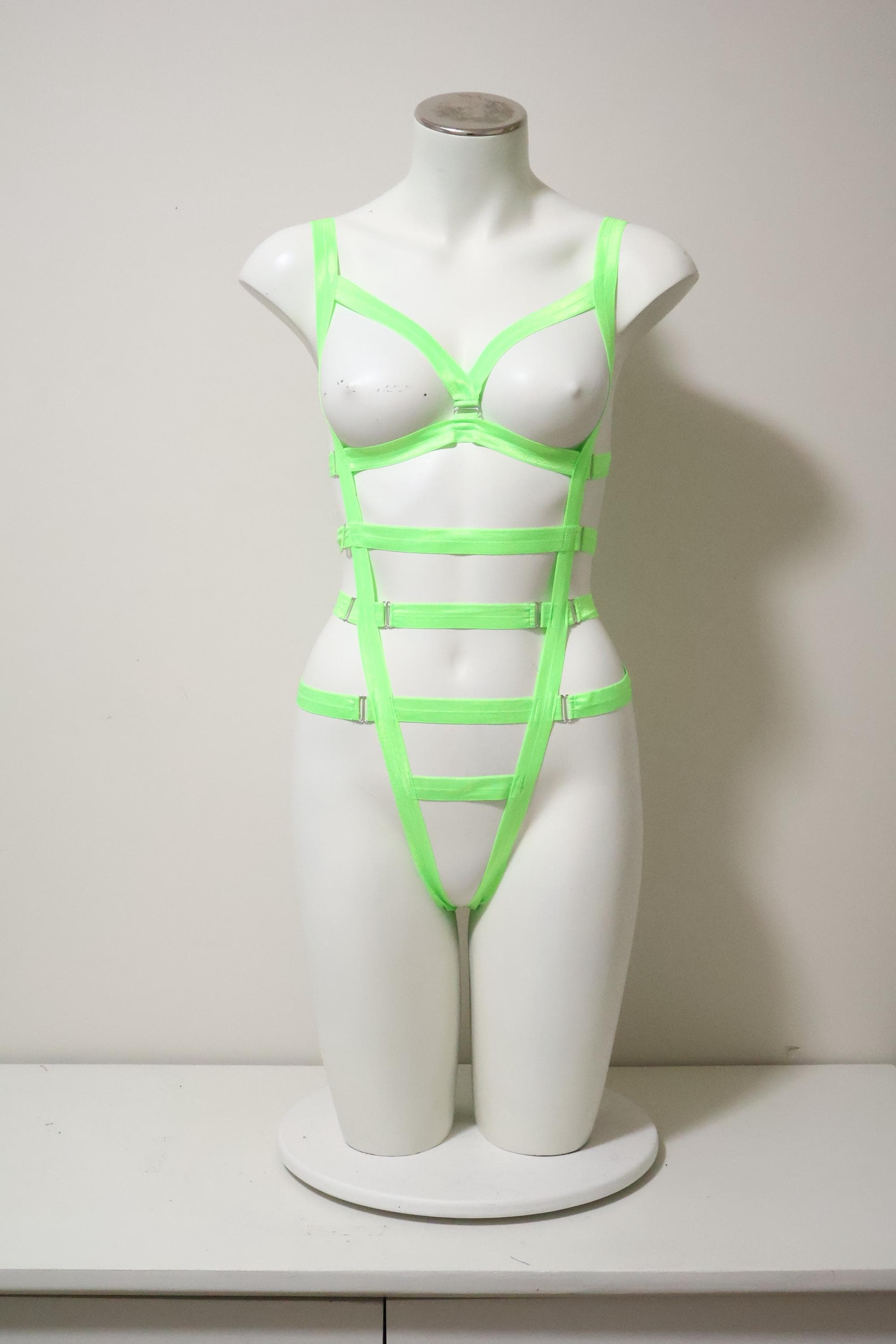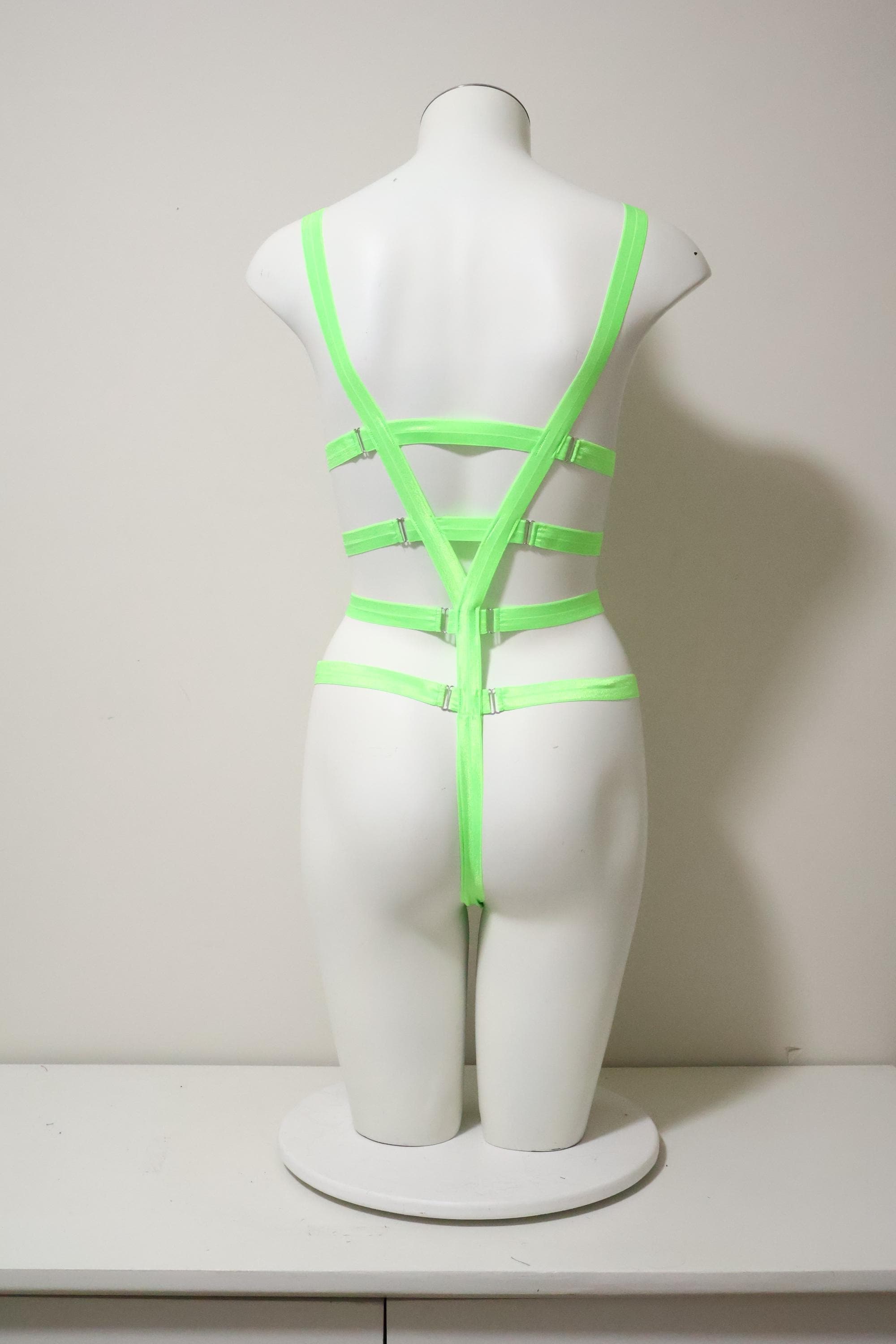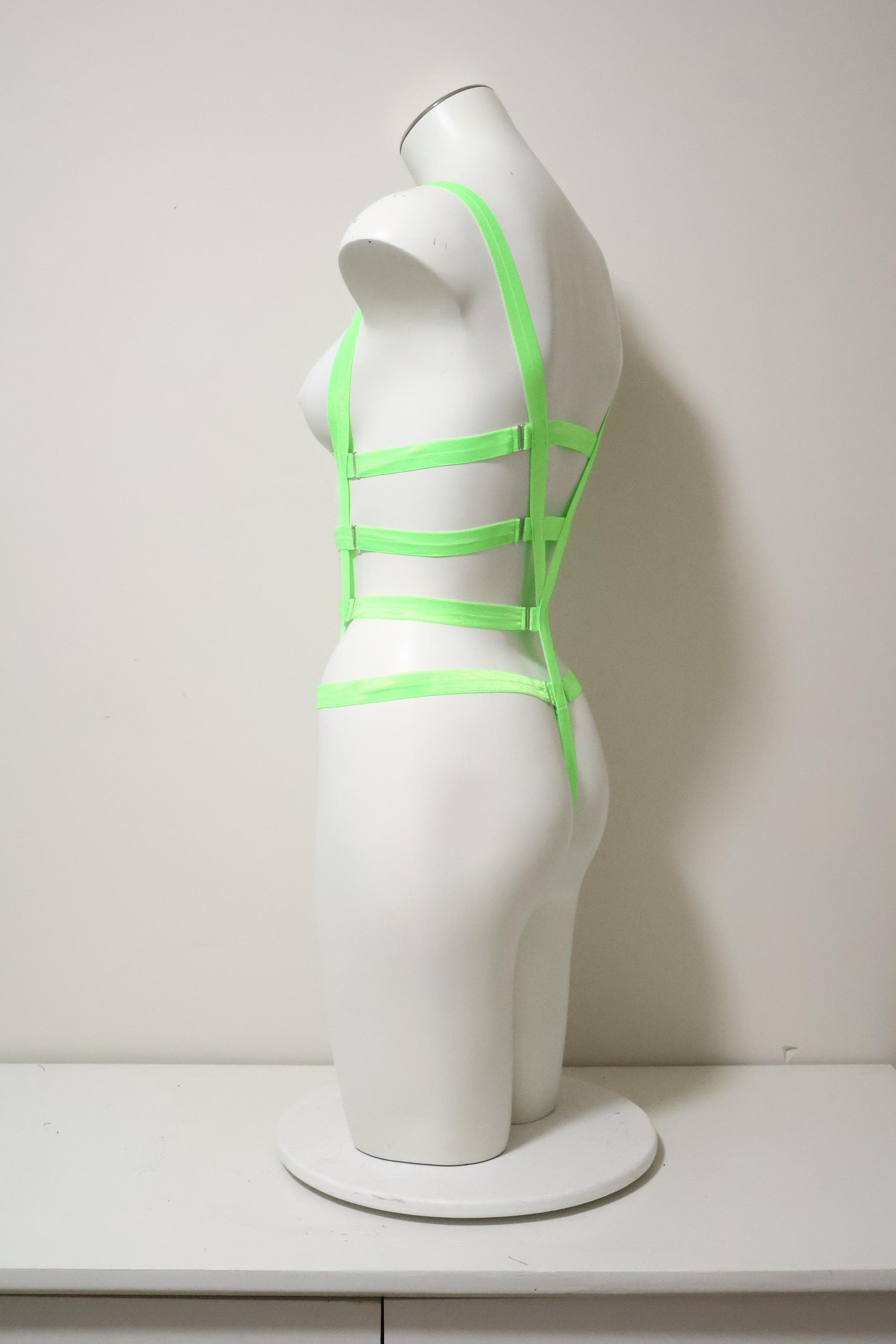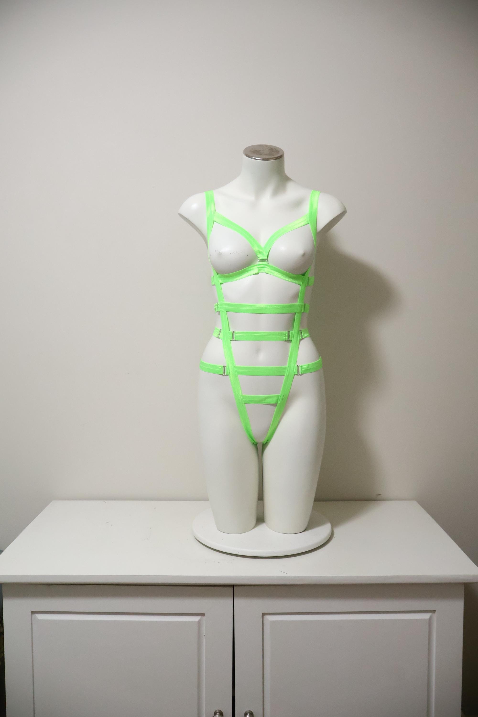 Style: Full body thong bodysuit body harness. Halter neck with snap closure.