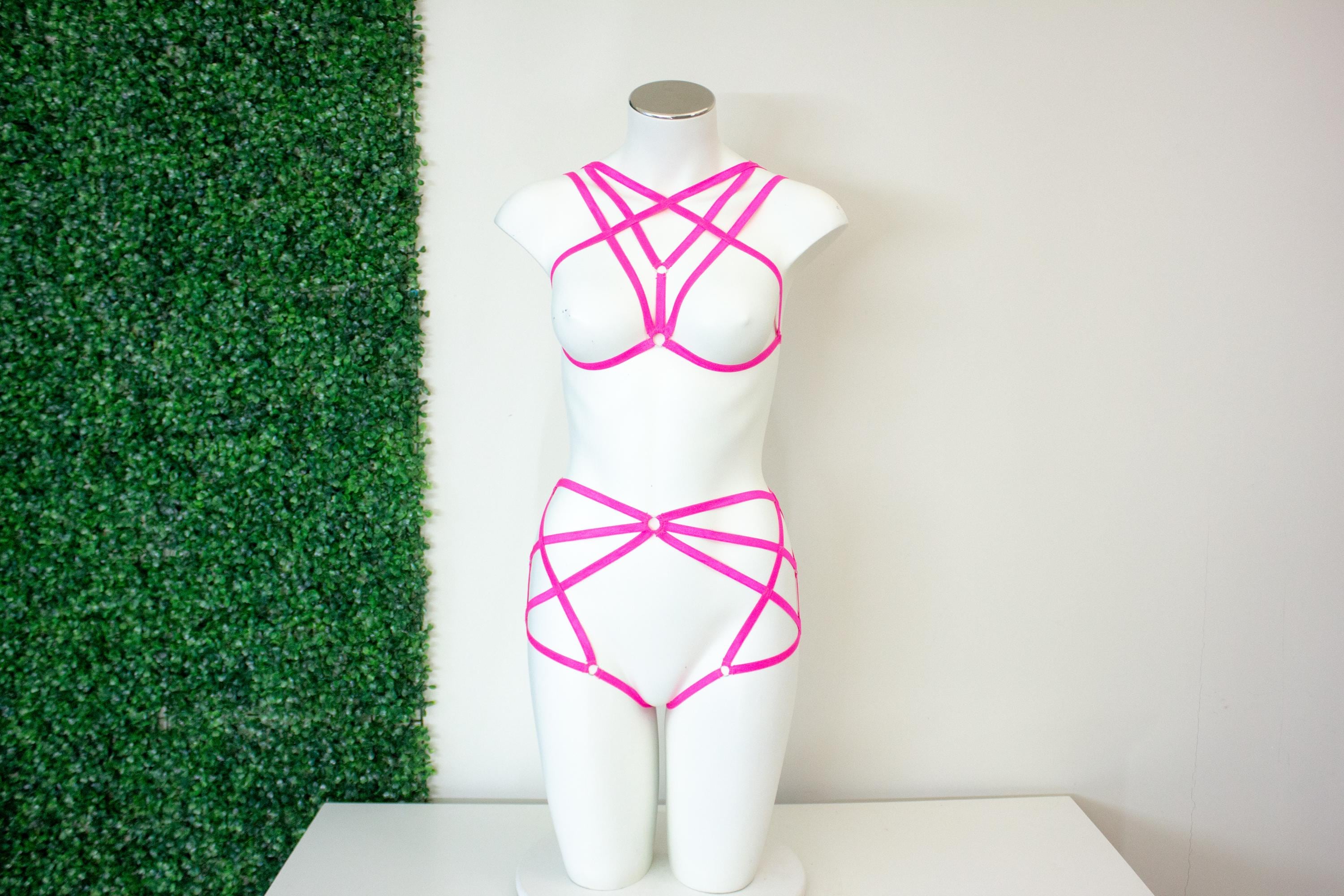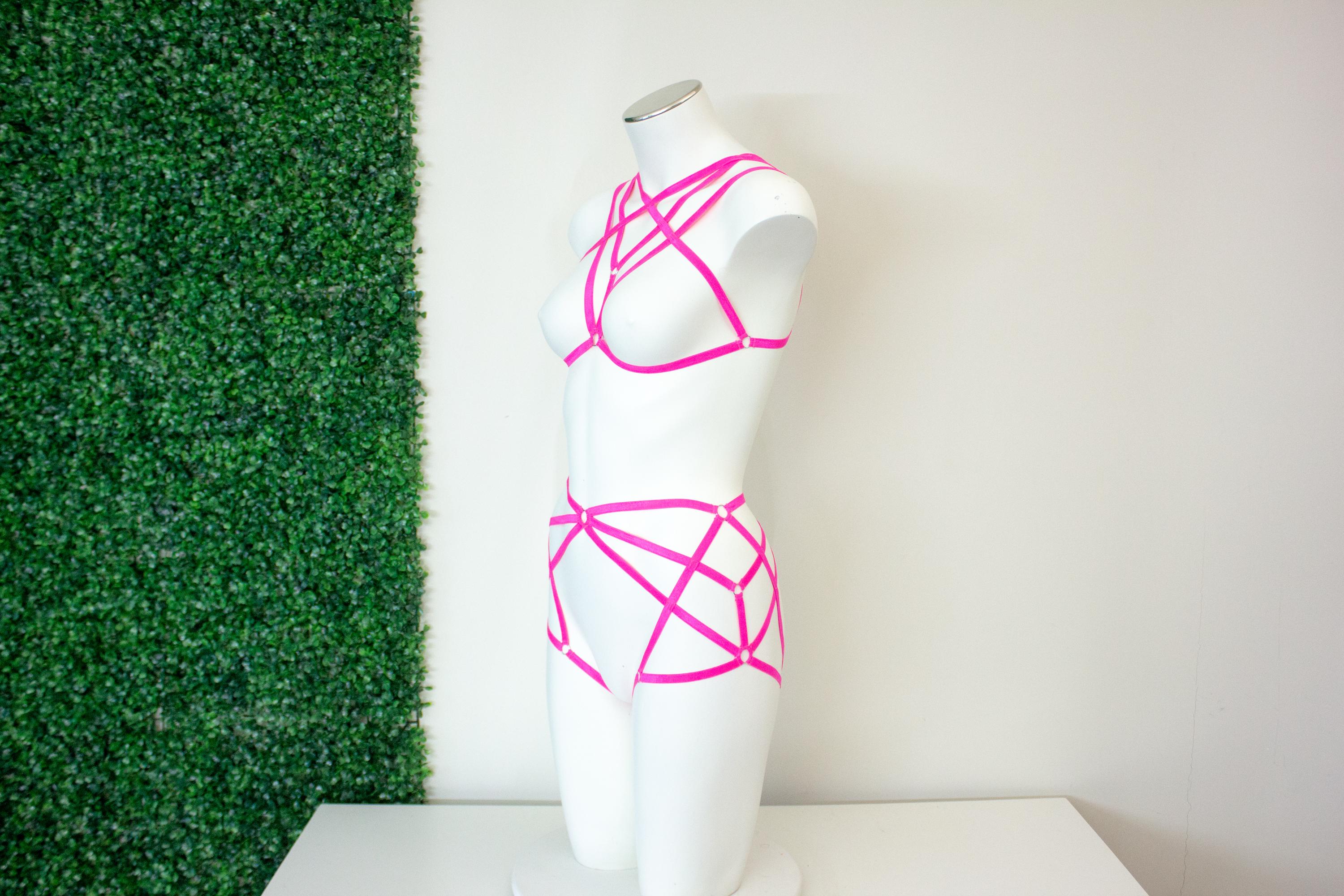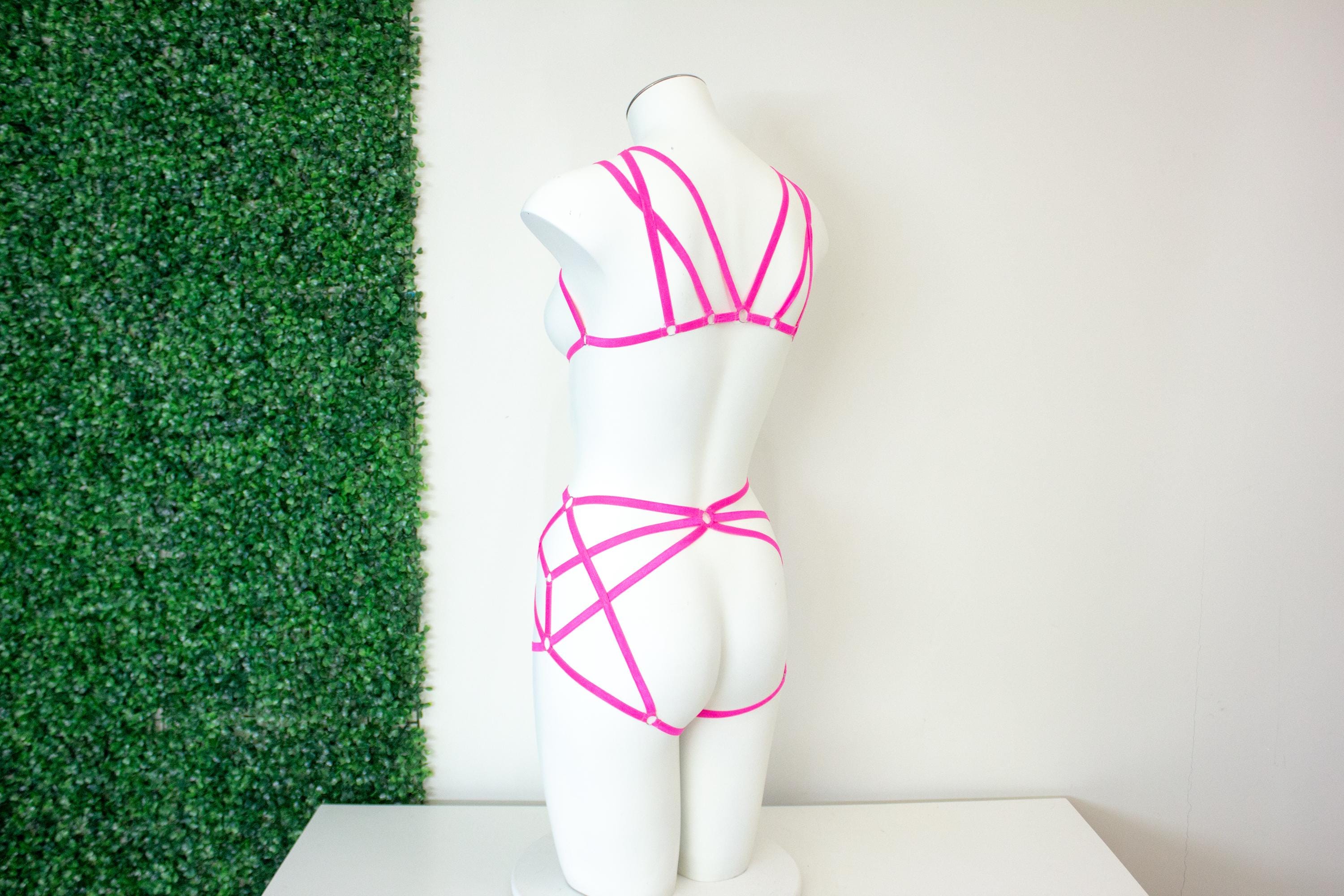 Neon Rose Black Light UV Glow Reactive Pole Fitness Rave Festival Stretch Body Harness Lingerie Set. Reversible Top.