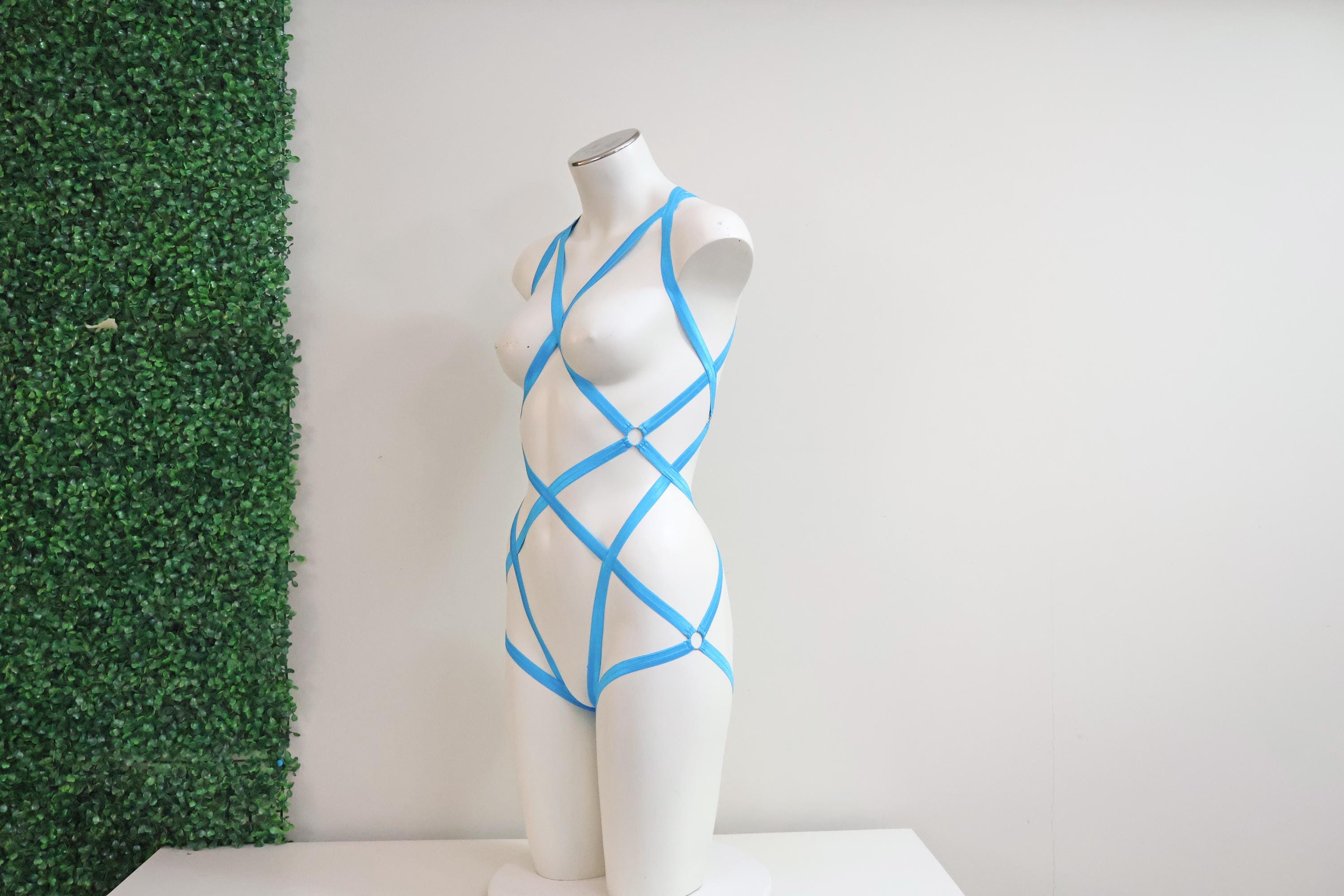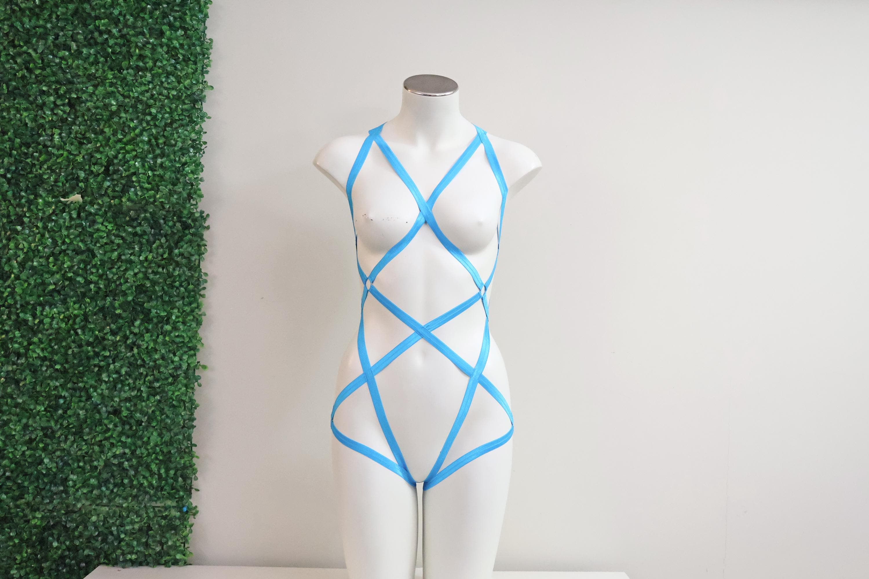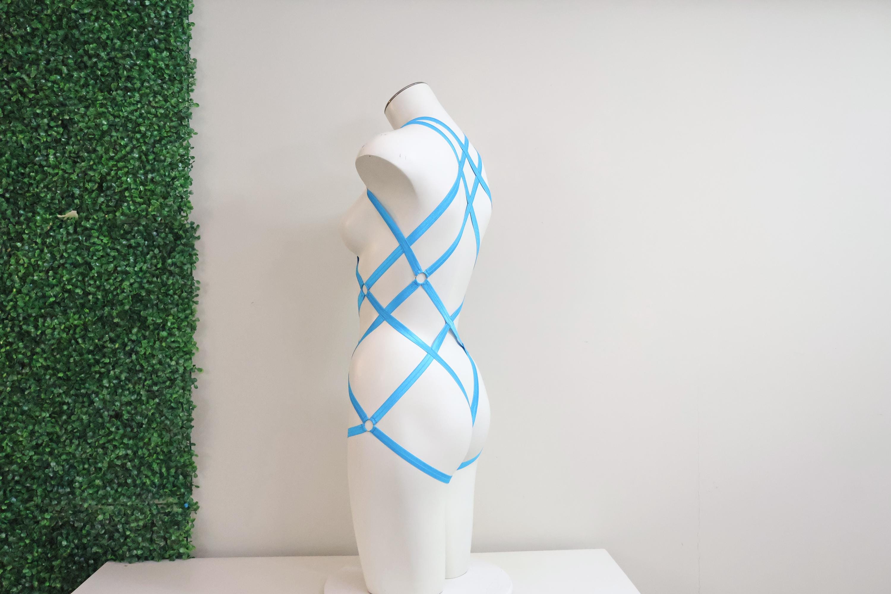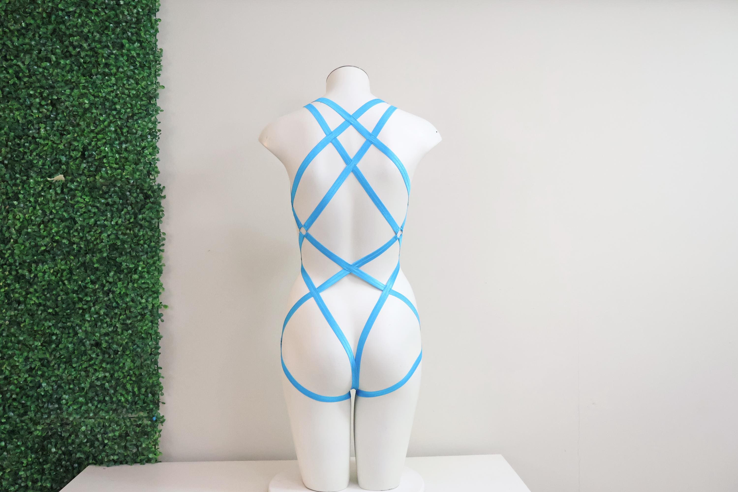 Style: Full body thong bodysuit body harness. Halter neck with snap closure.