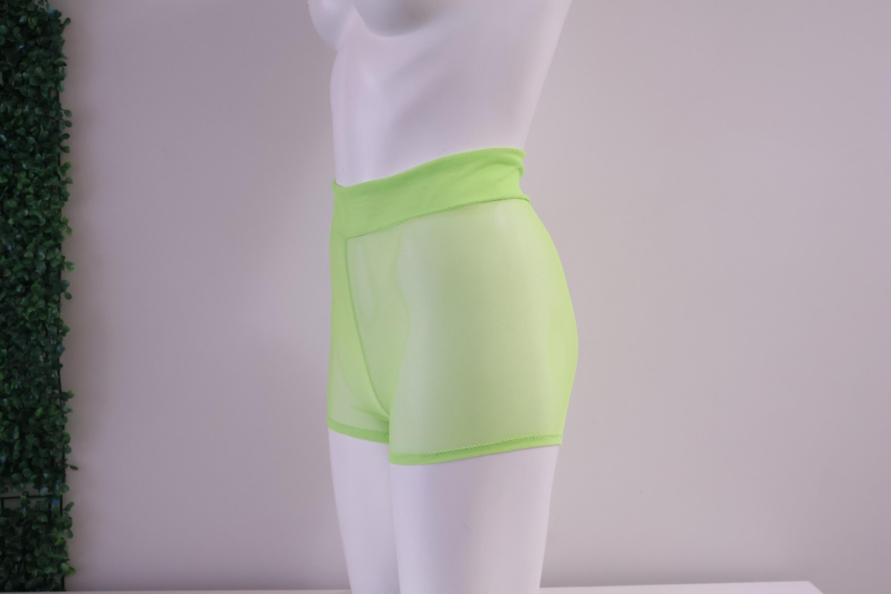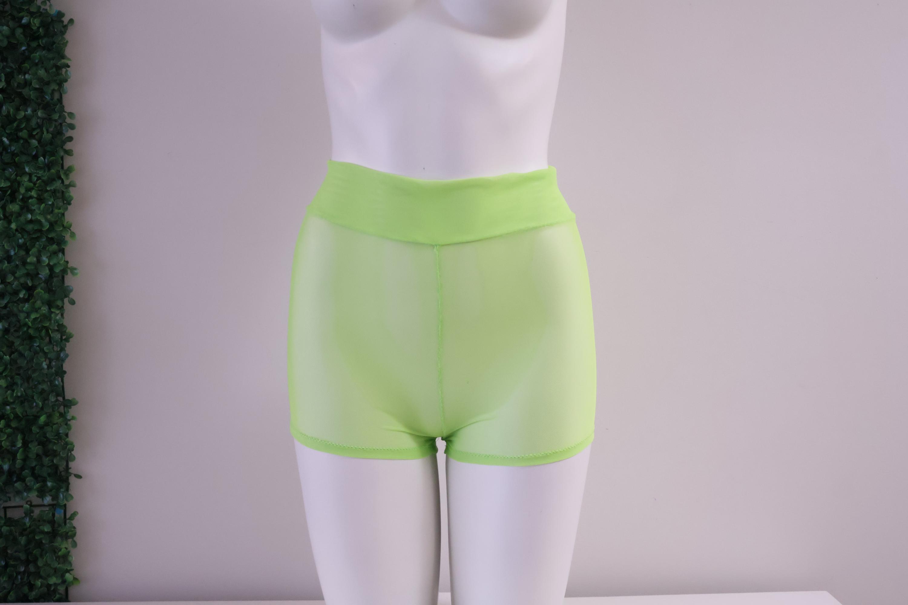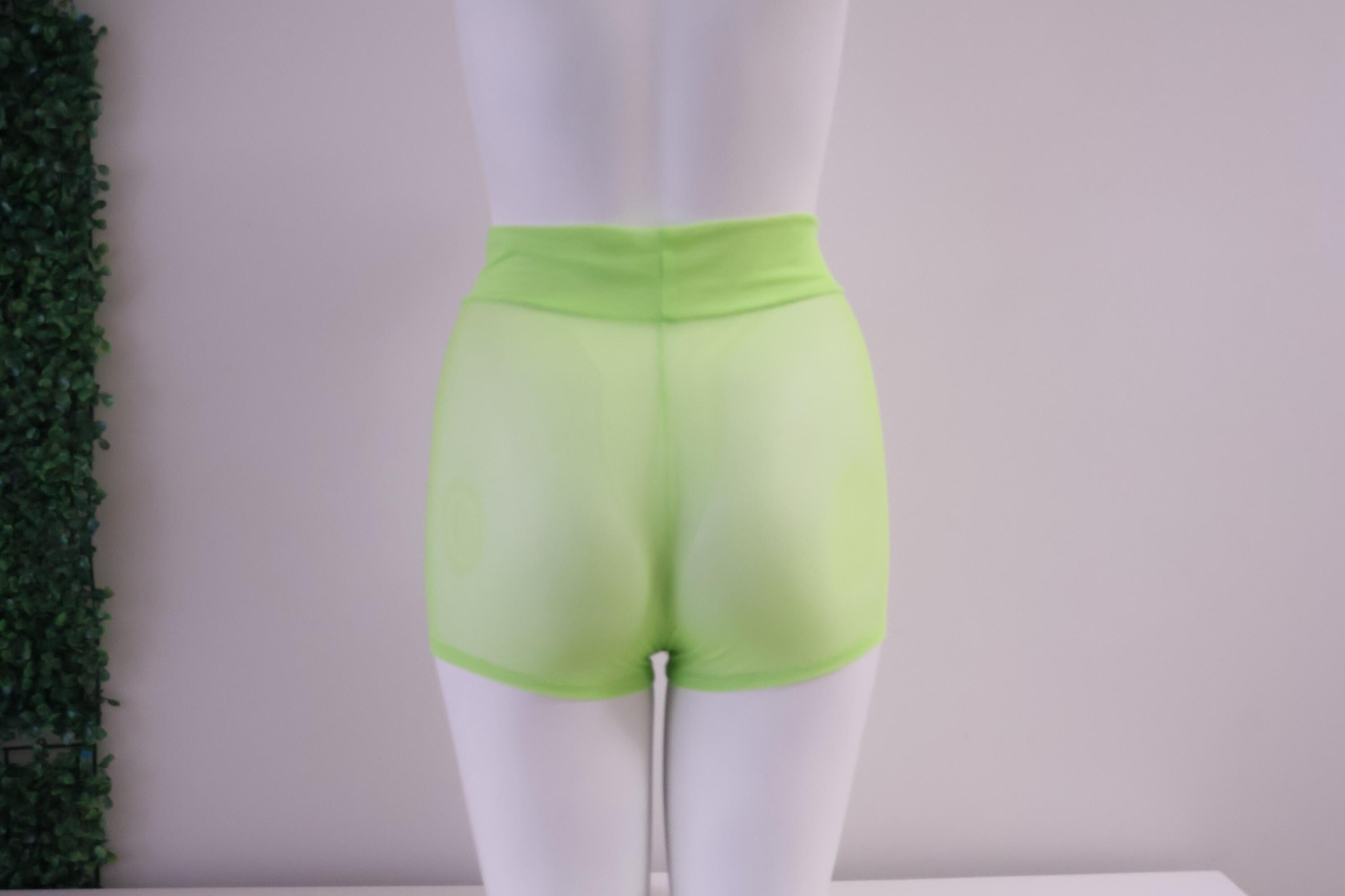 High Waist Sheer Mesh Glow Neon Green Booty Shorts: Festival Rave Fashion, Stripper Outfit, Rave Shorts, Mesh Short Shorts, Dancewear, Exotic Clothing