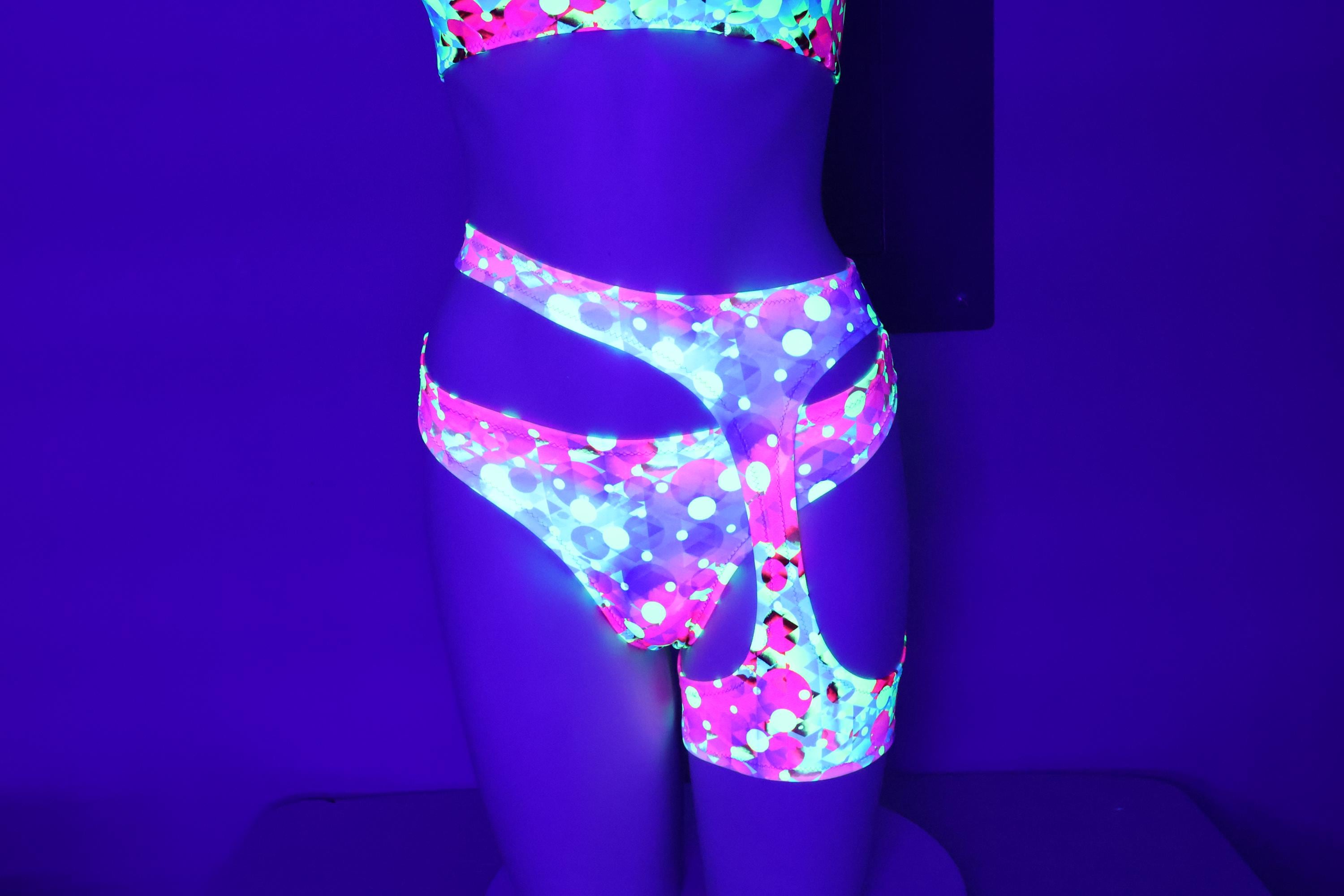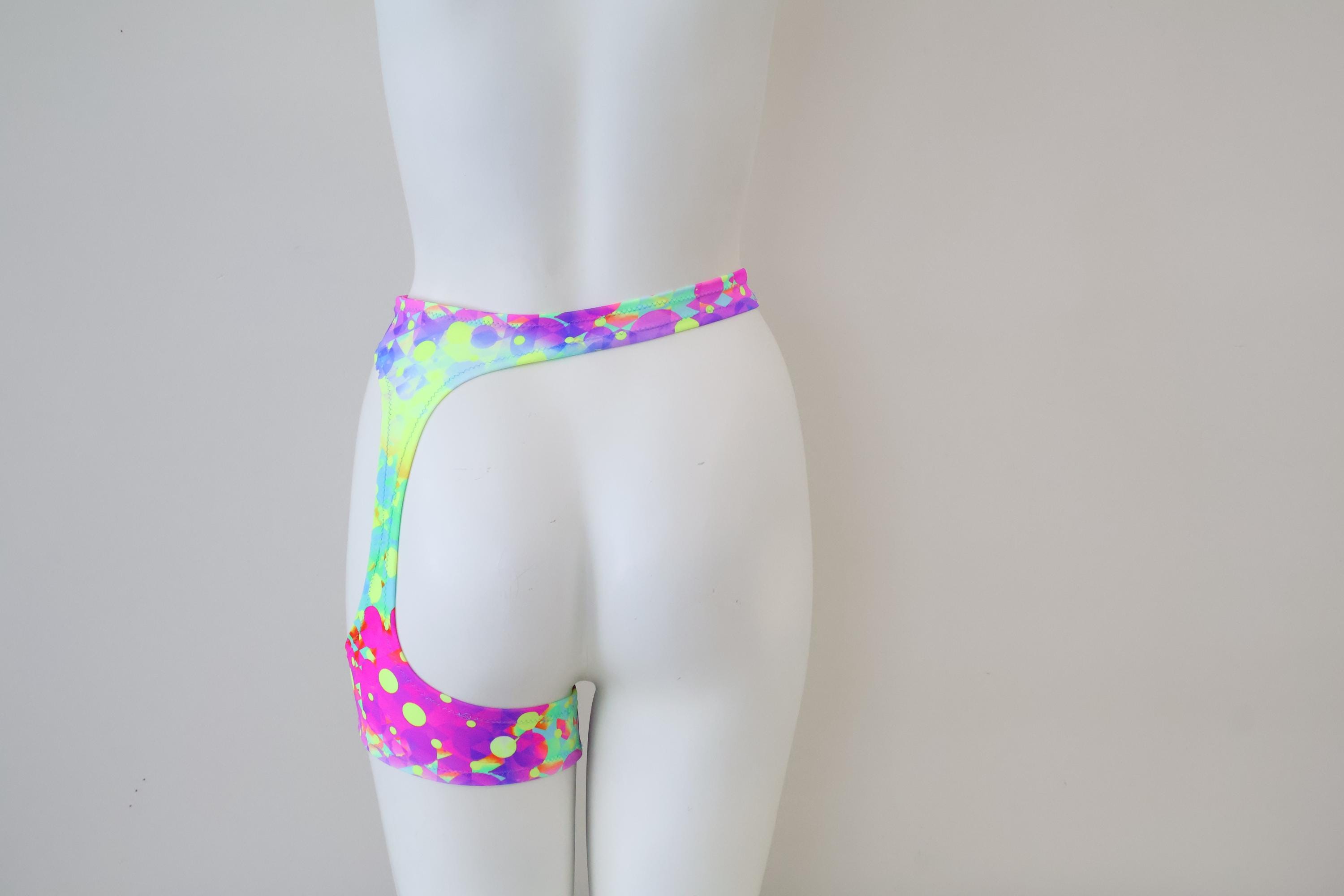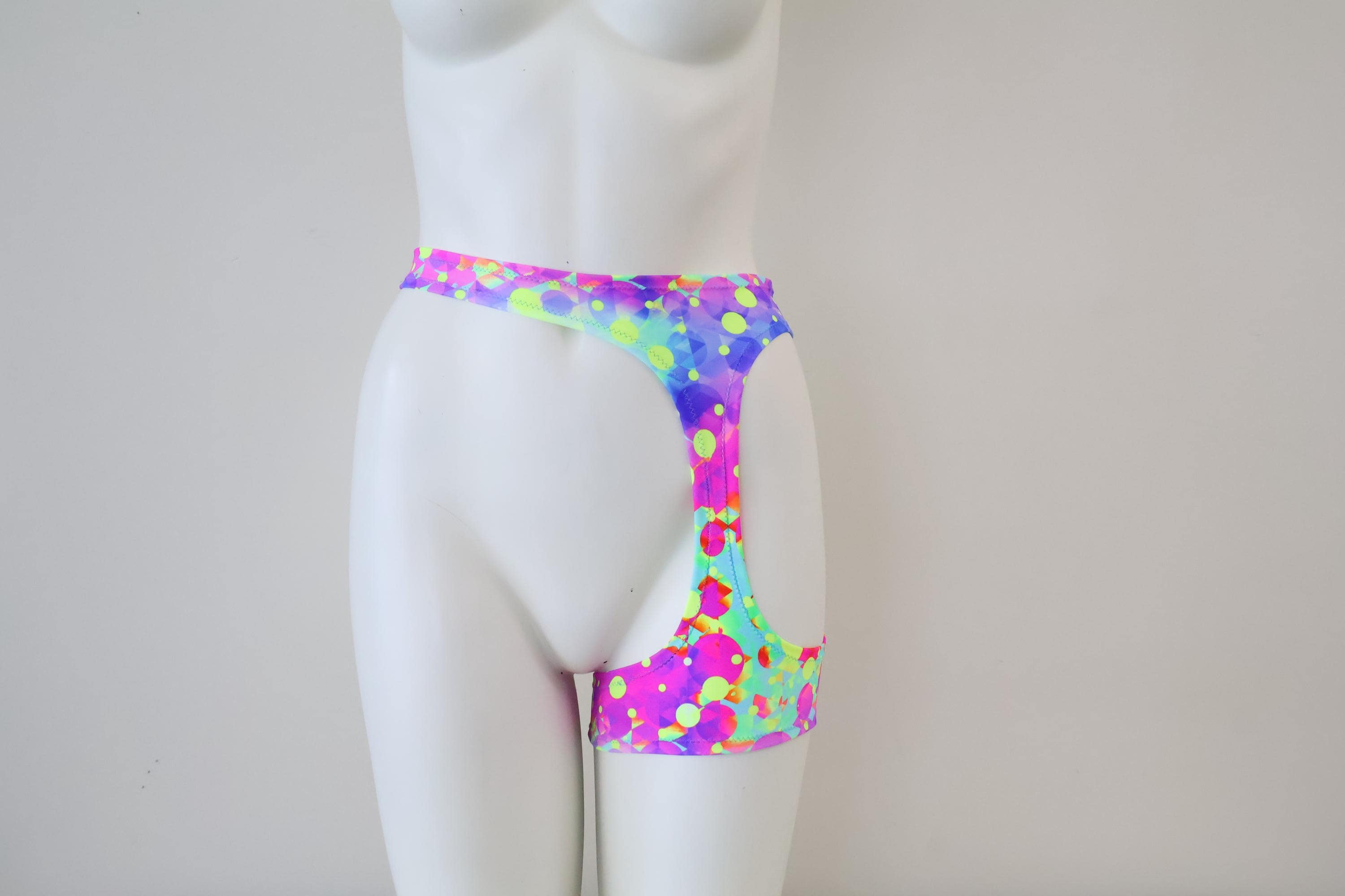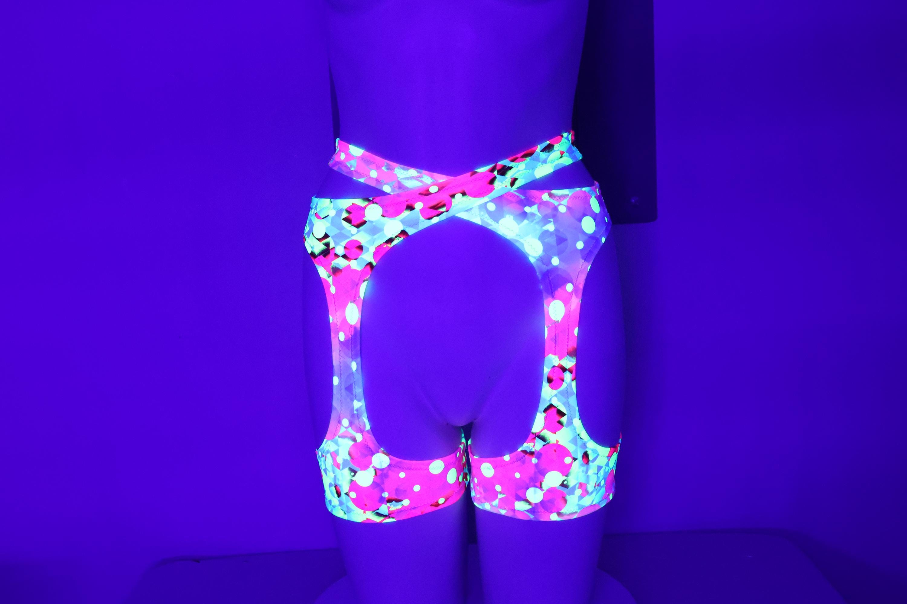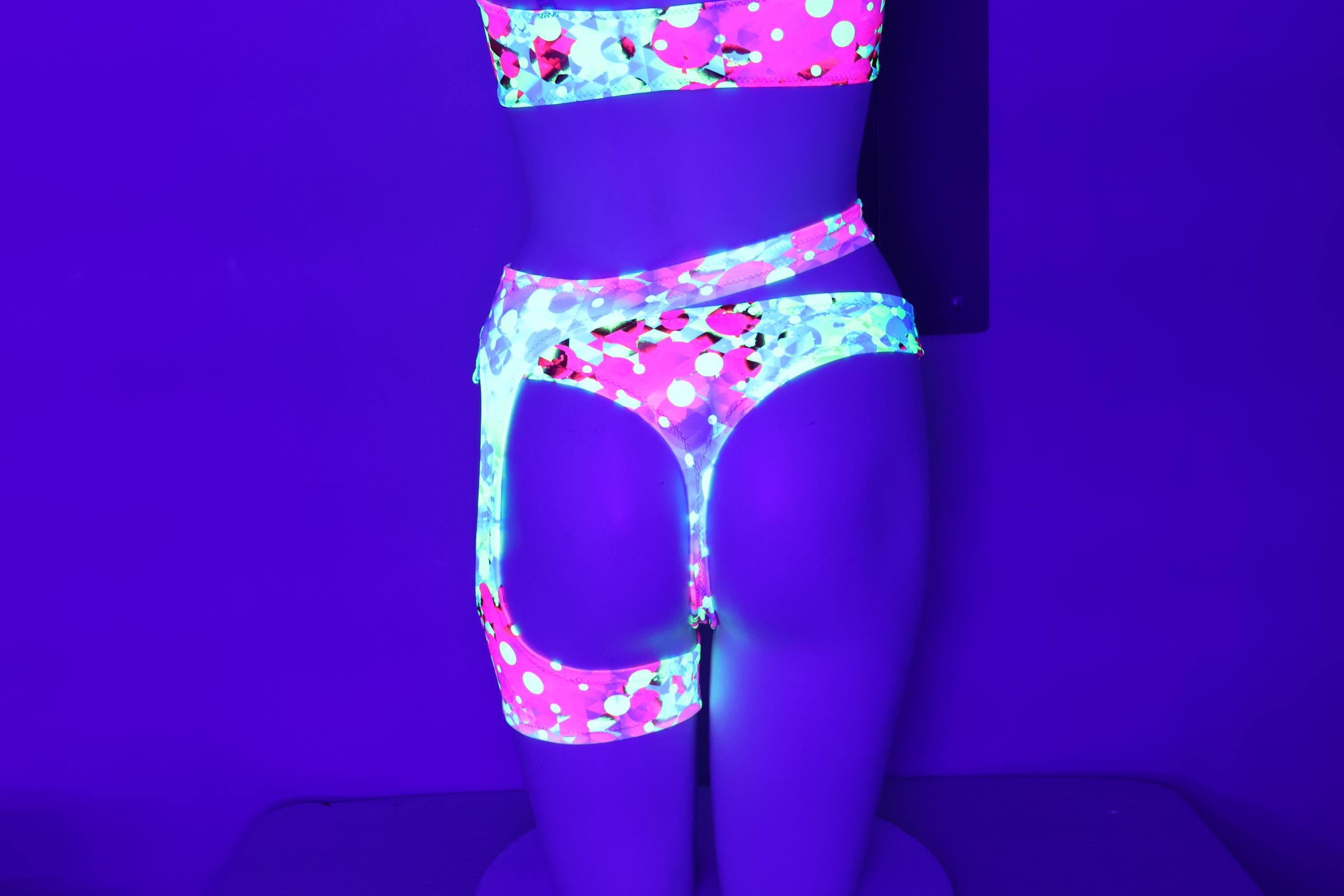 You will receive: 1 Leg Garter in color and size selected with 1 thong panty (2 piece set) in the Psychedelic Rainbow (UV) print, unless larger quantity ordered.