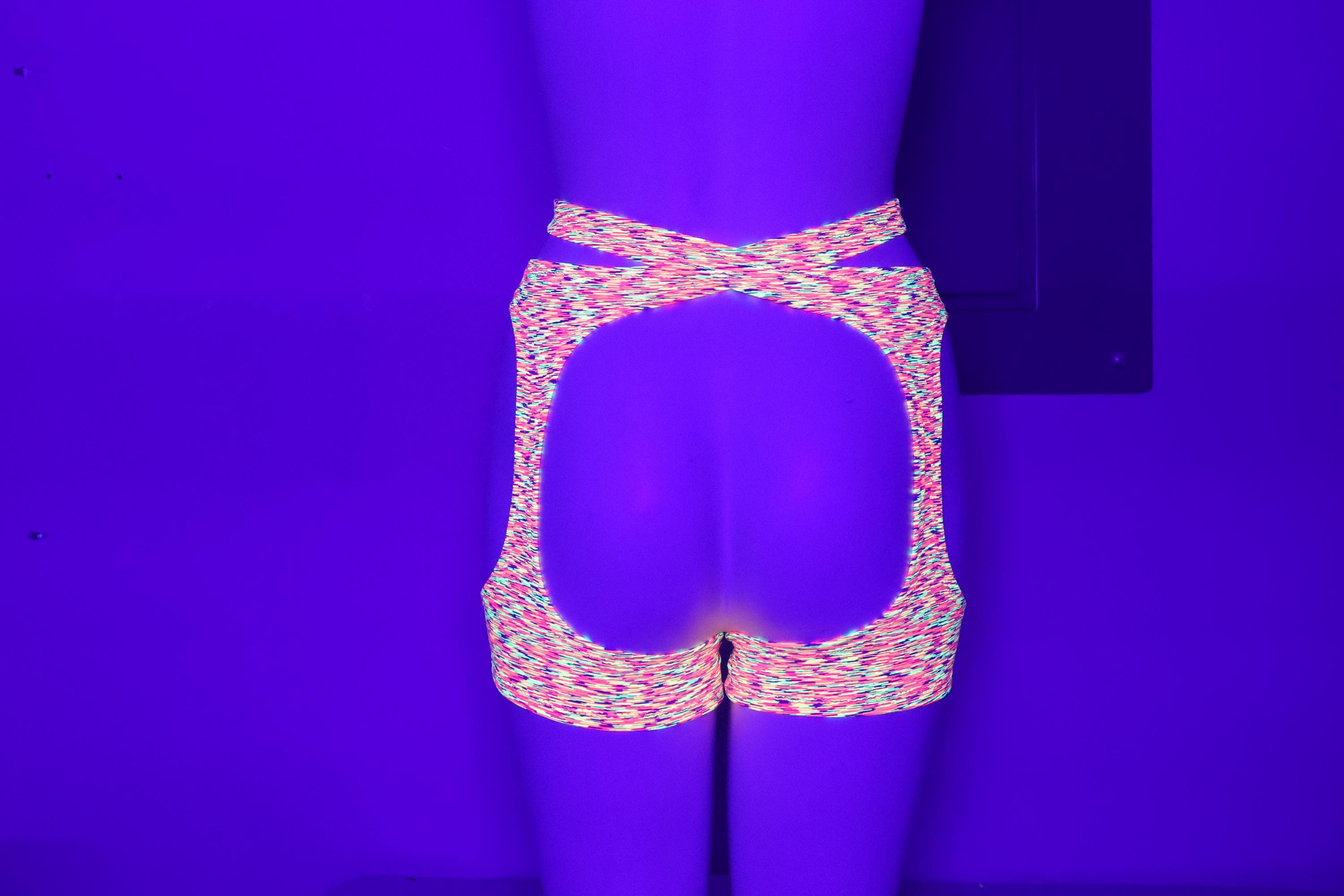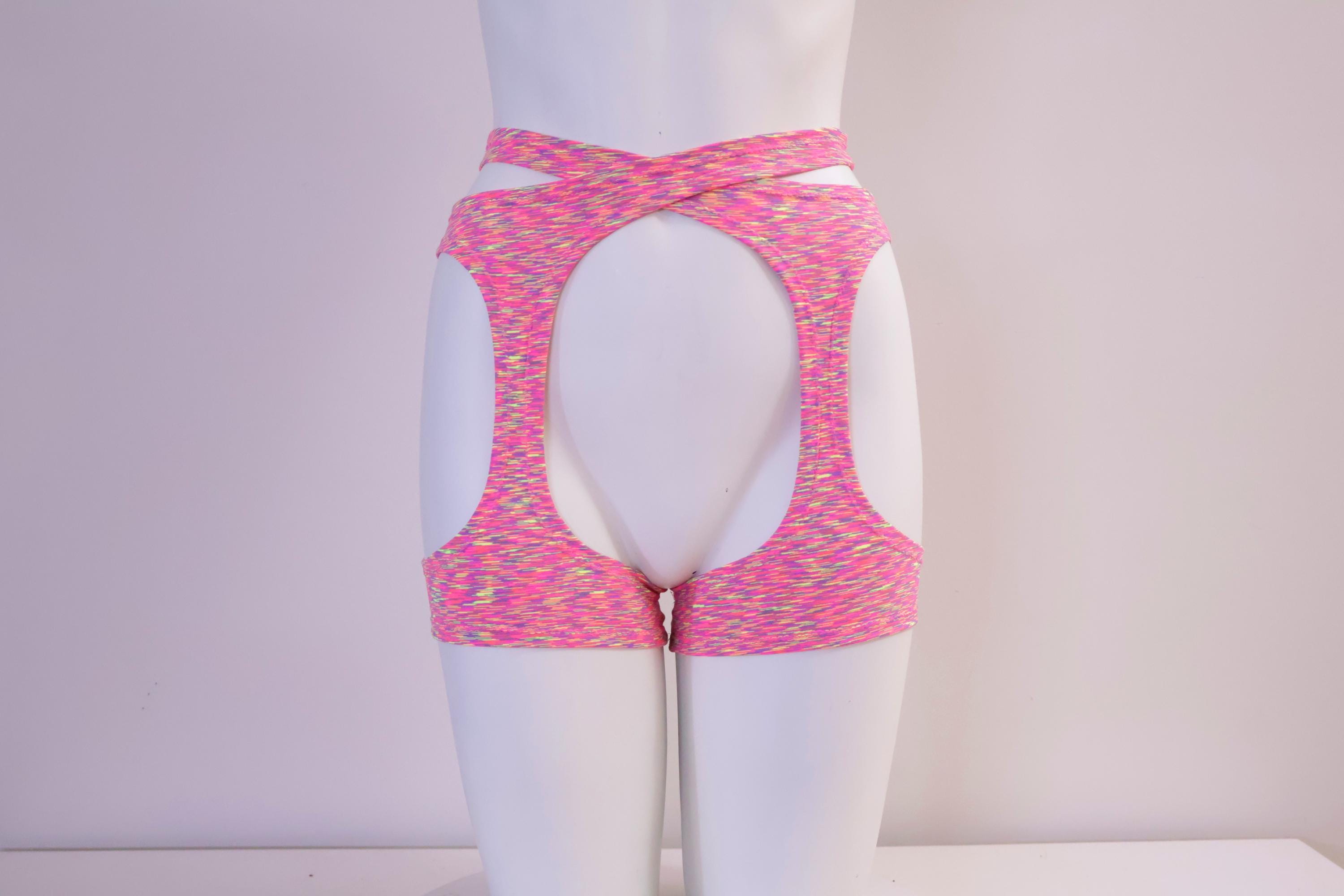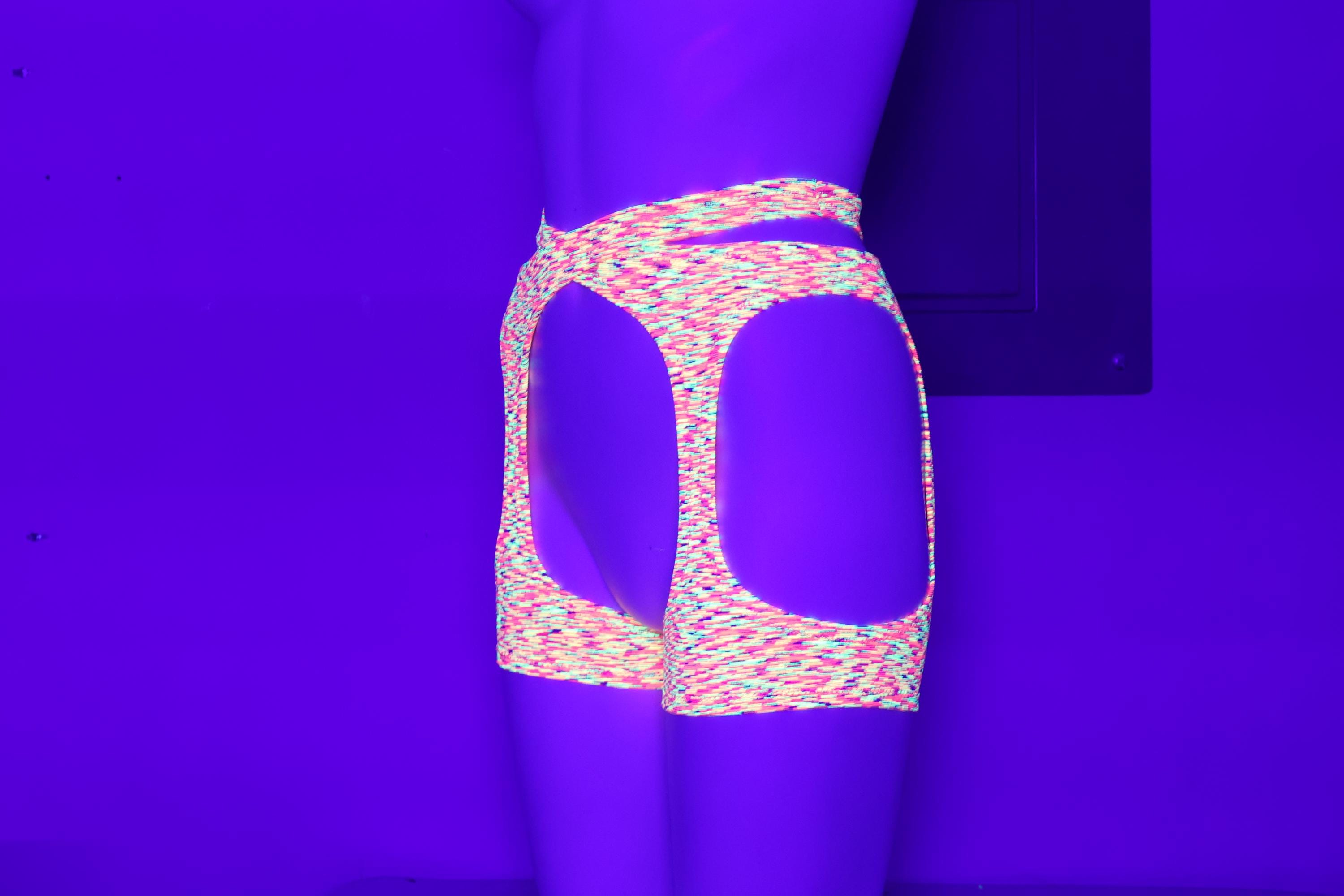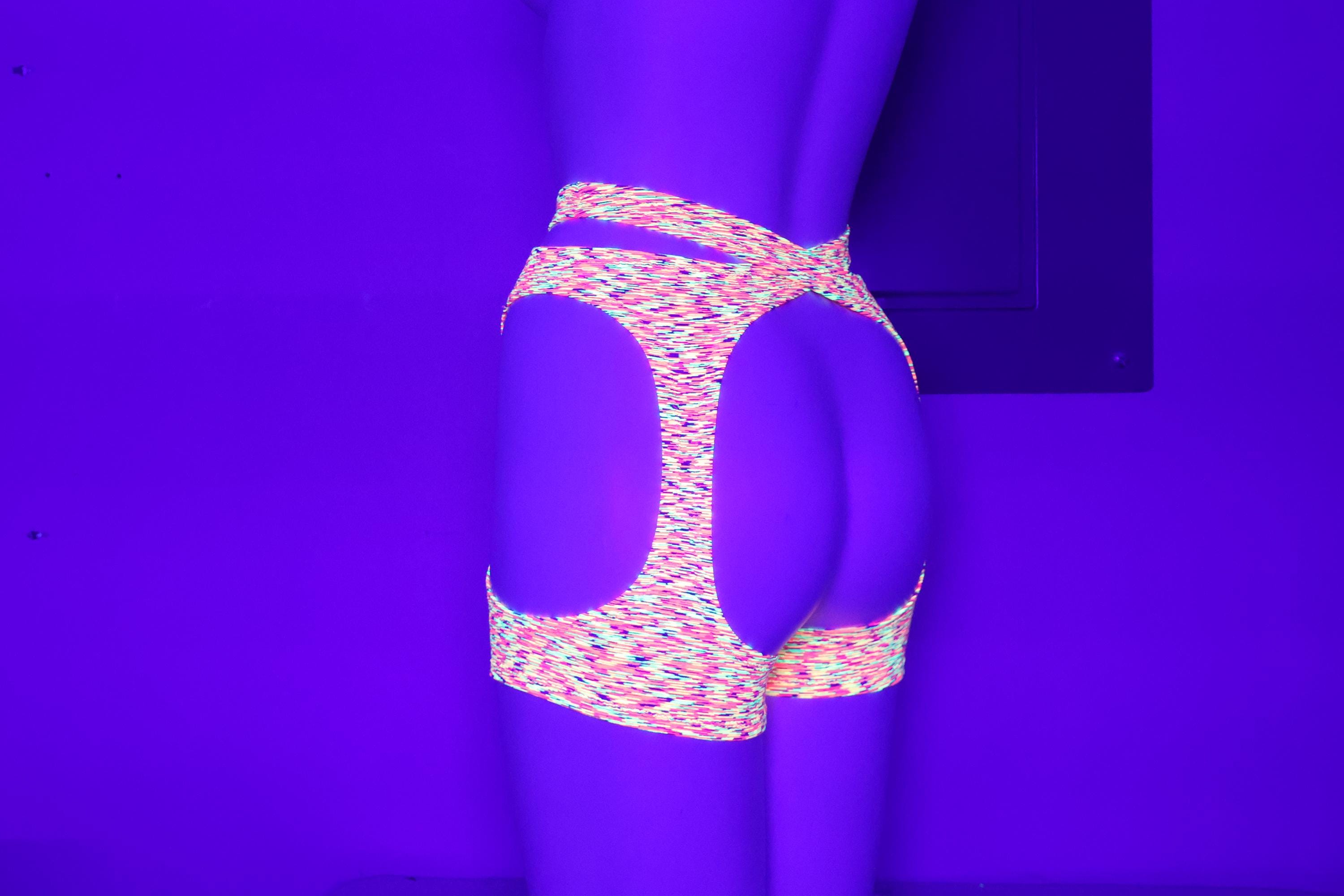 Psychedelic Print Rave Festival Shorts: High Waist Garter, Dancewear Clothing, Stripper Outfit, Cut Out
