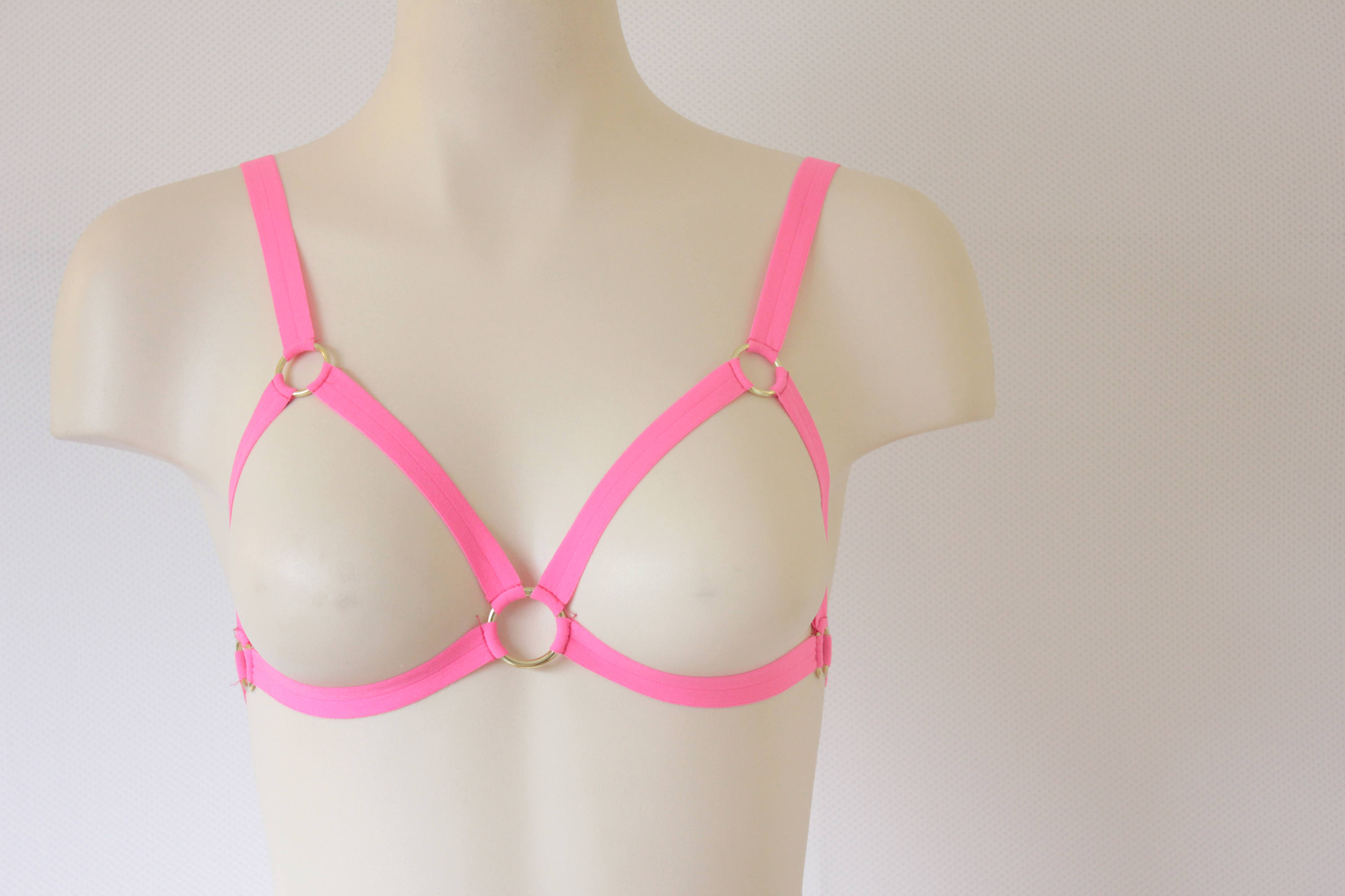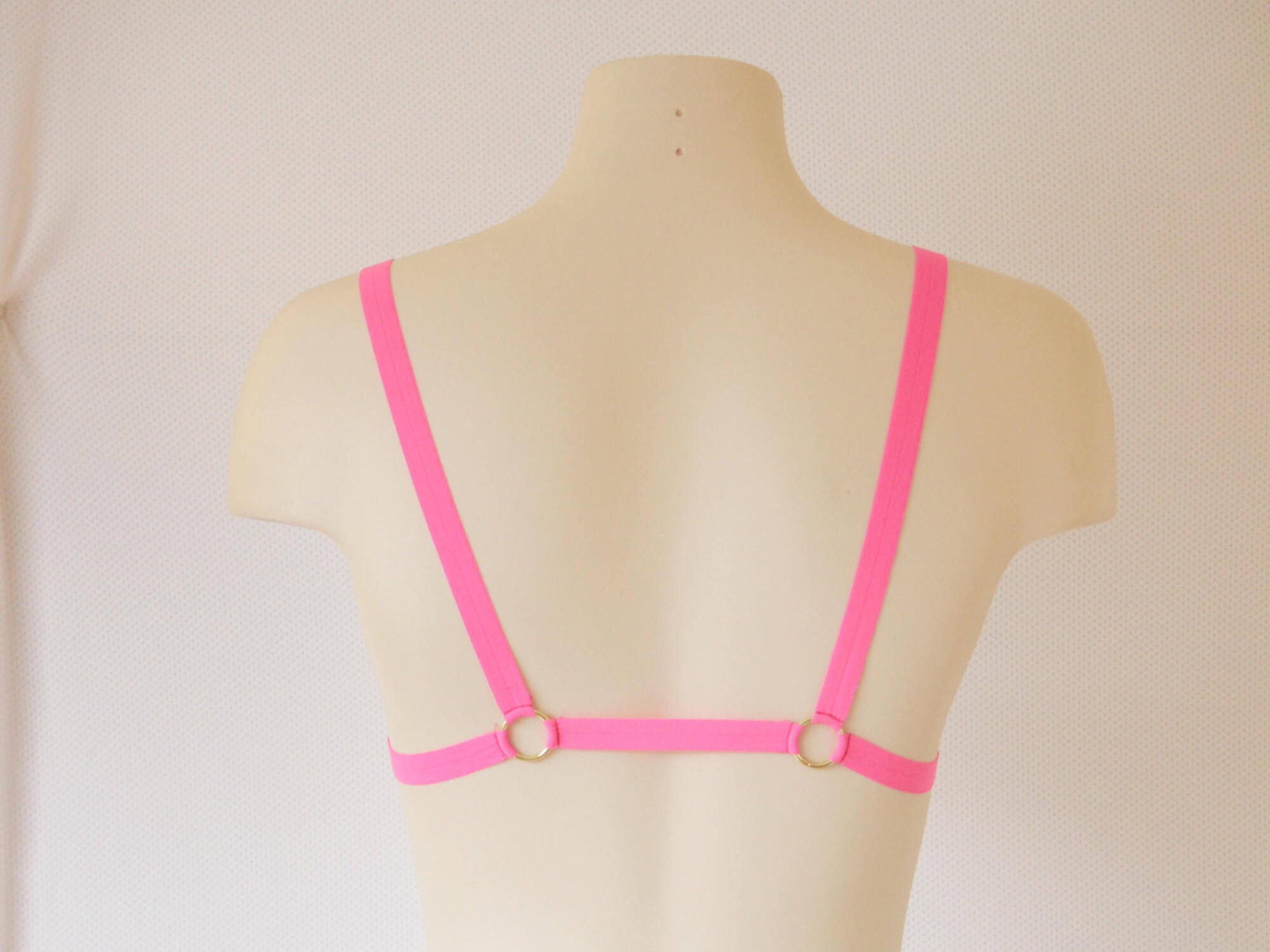 Colour displayed is the Neon Rose Festival Harness Bra with gold rings.