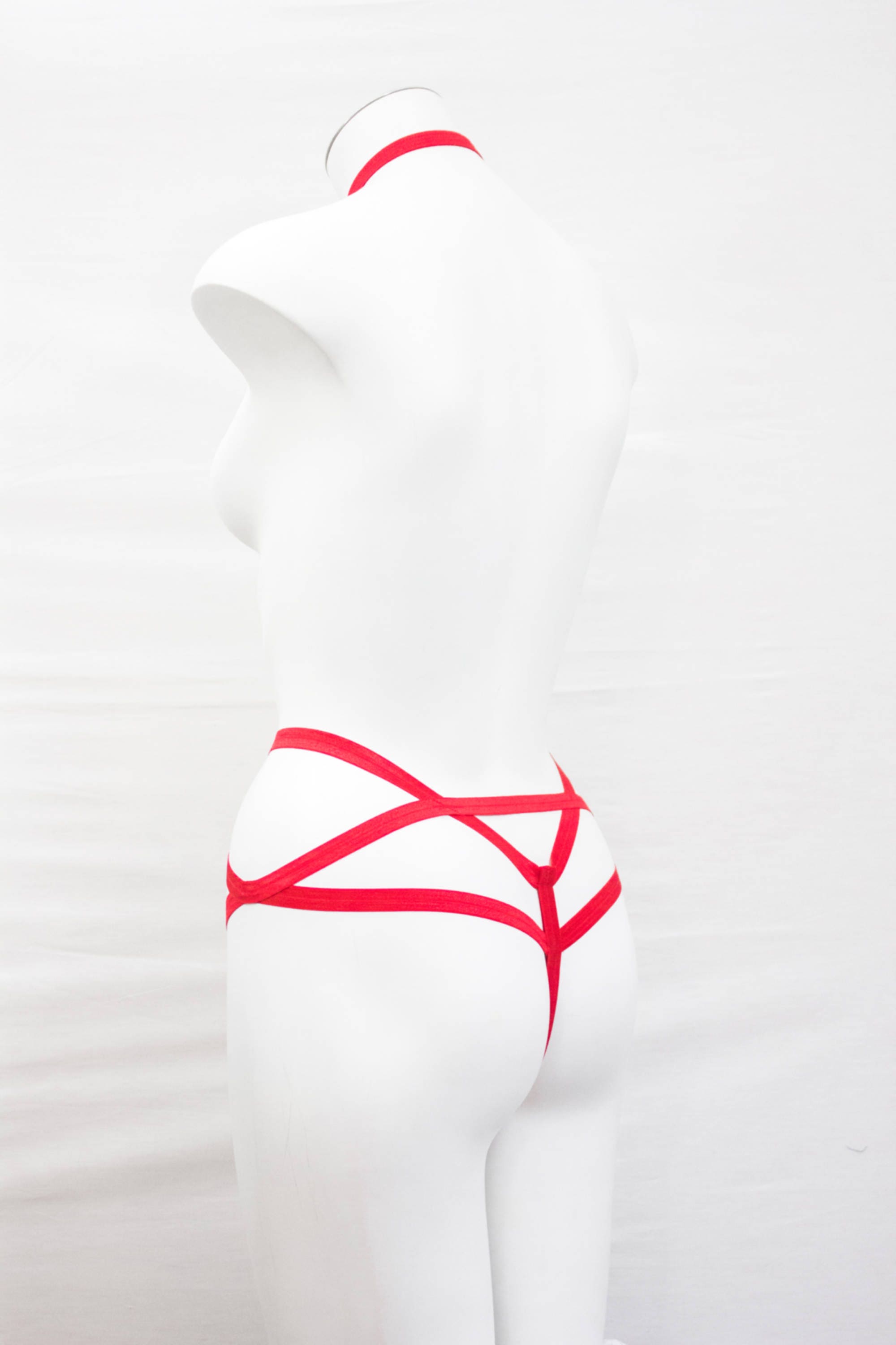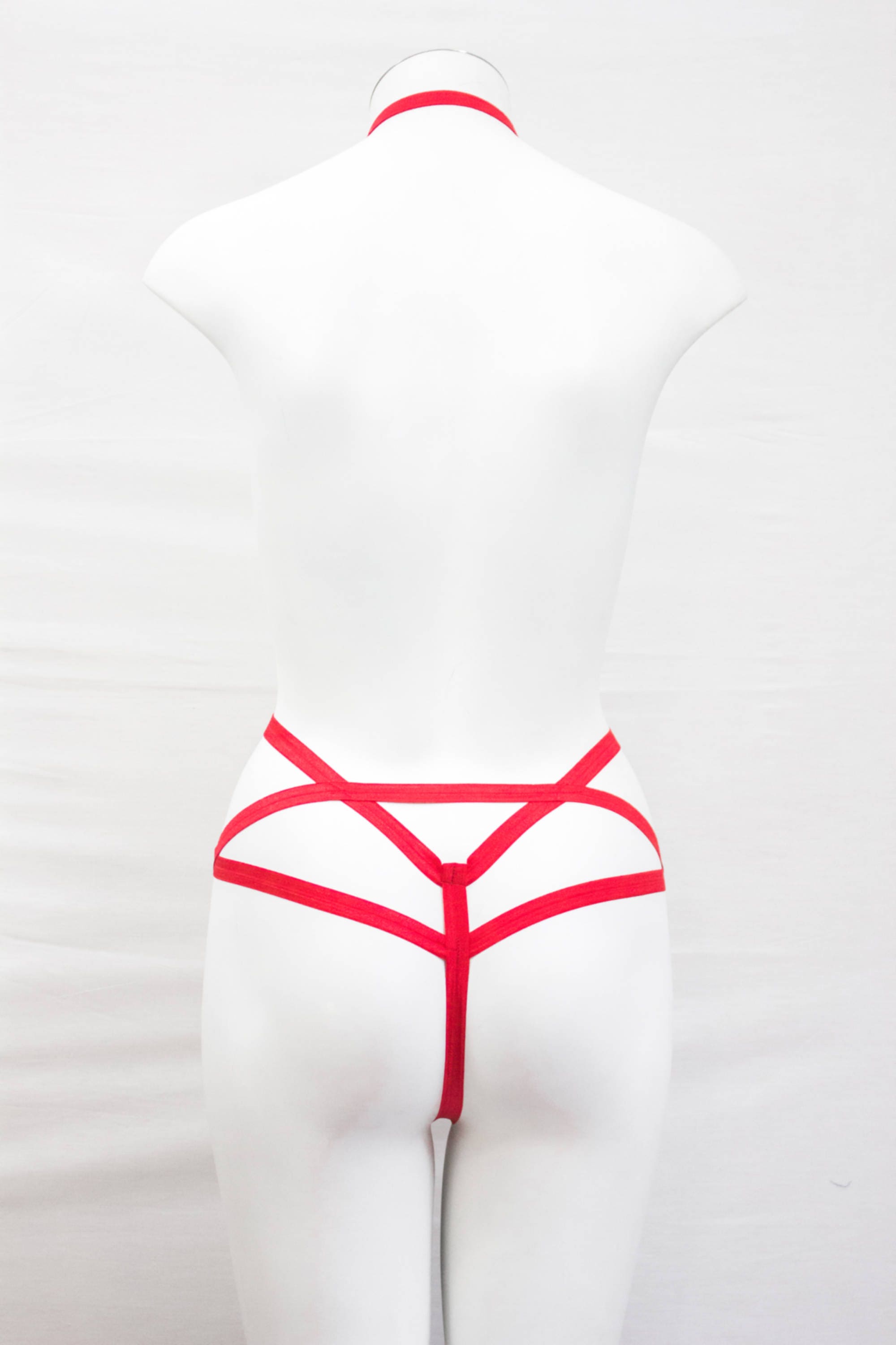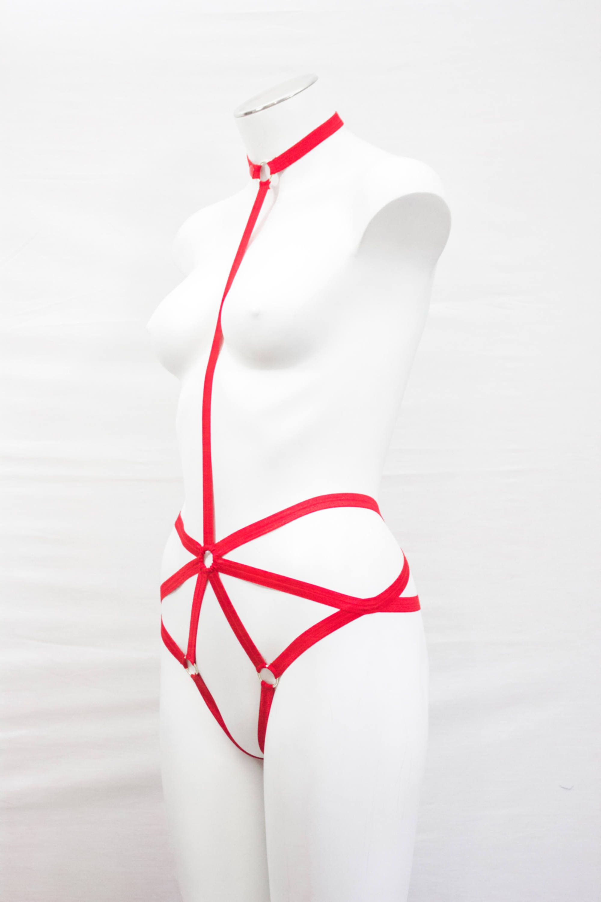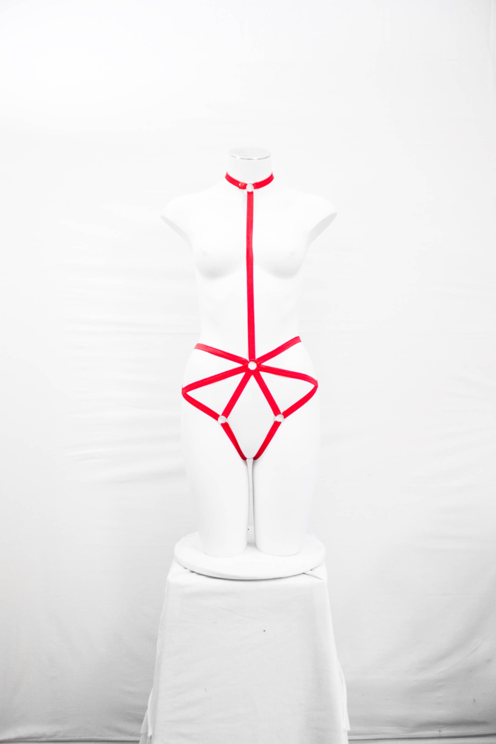 Very sexy lingerie accessory body harness. Perfect for under dresses, or over a bralette and pantie lingerie set you're wanting to add a little more flair to. Open crotch that fits like a thong in the back with straps that separate all the way in the front so nothing gets in the way of you having fun! Necklace choker style that leads to an elaborate geometric open crotch panty style bottoms! Made with stretch elastic, with choice of either clear, silver colour or gold colour rings to finish the look.