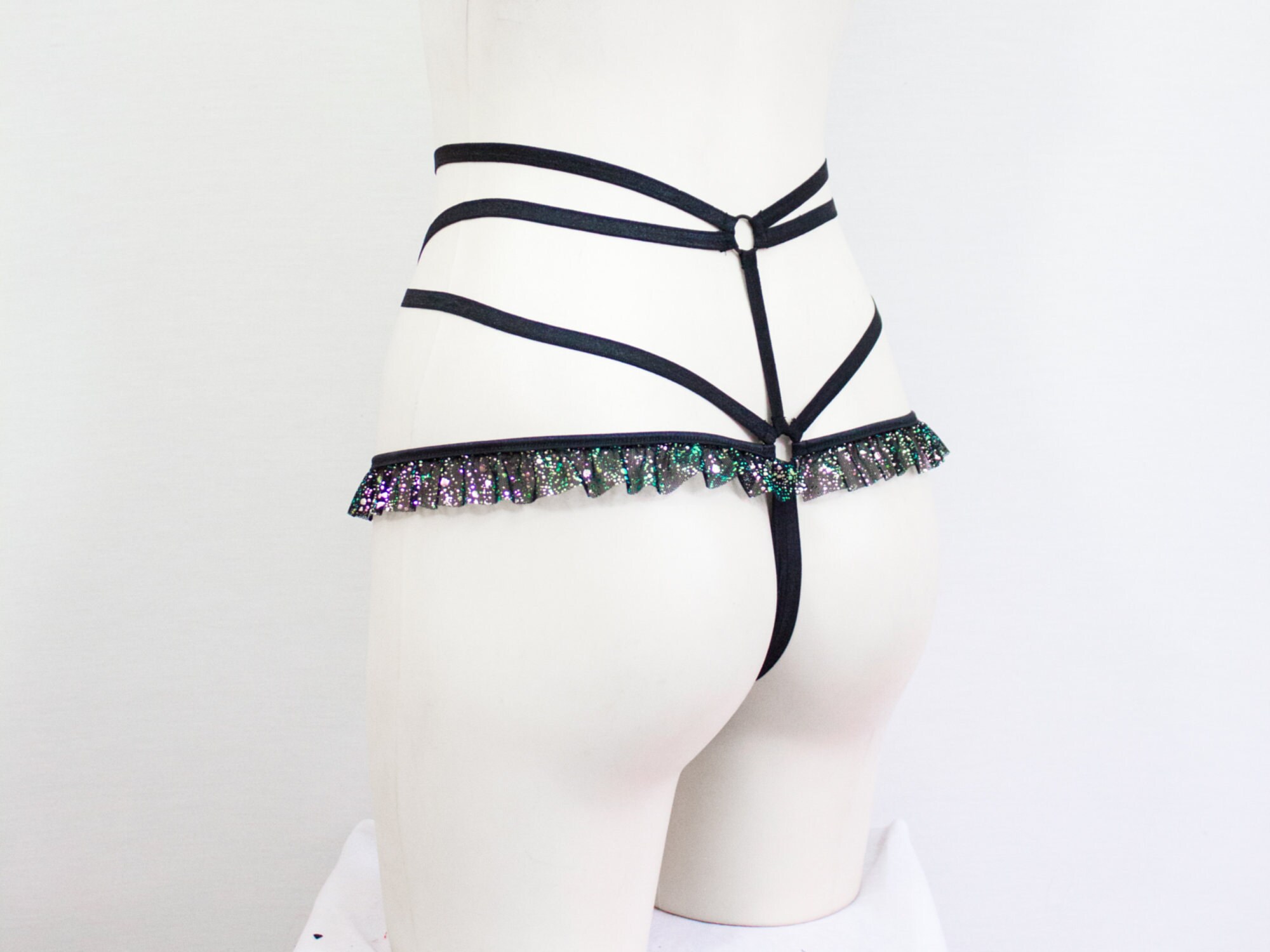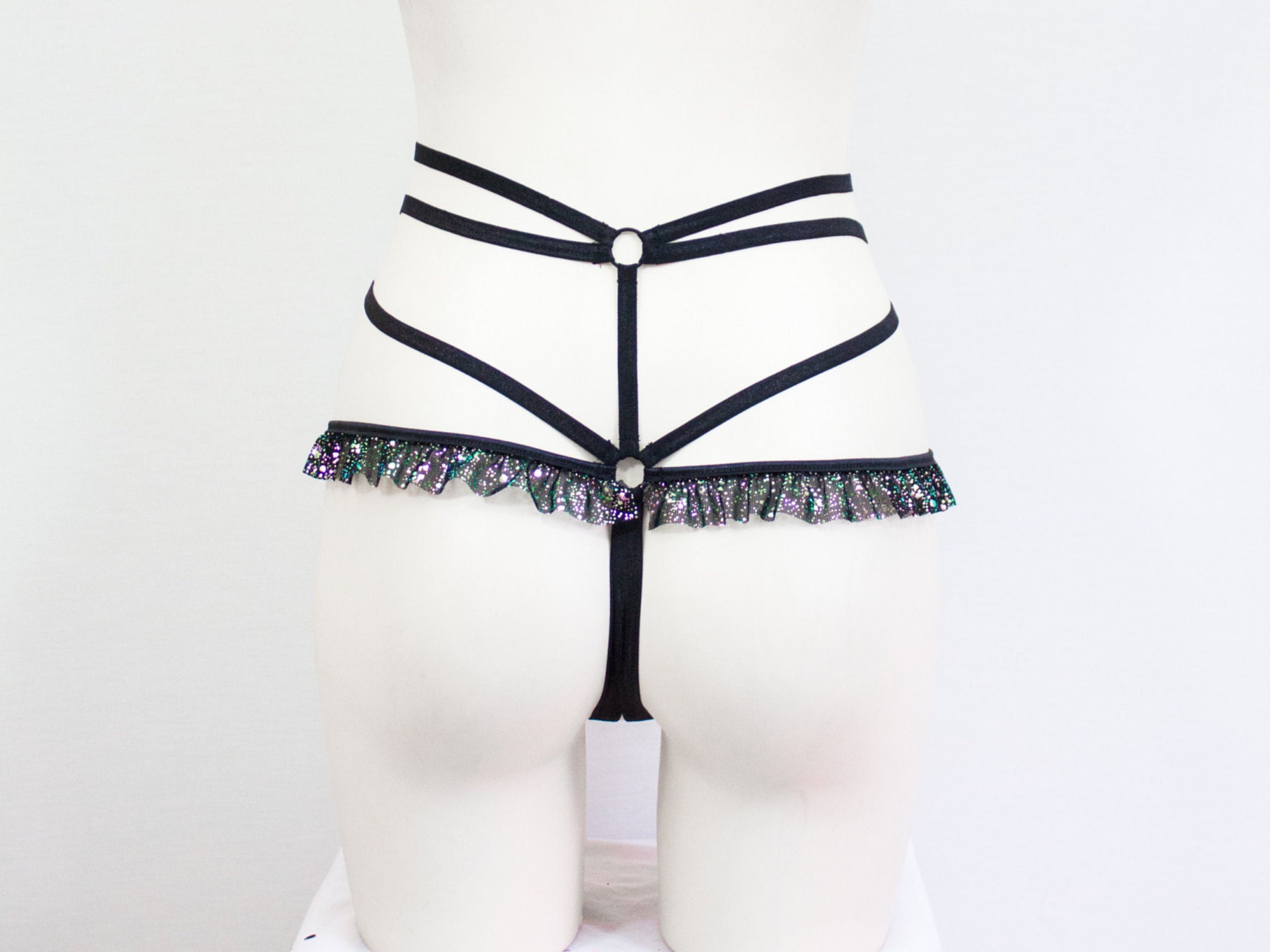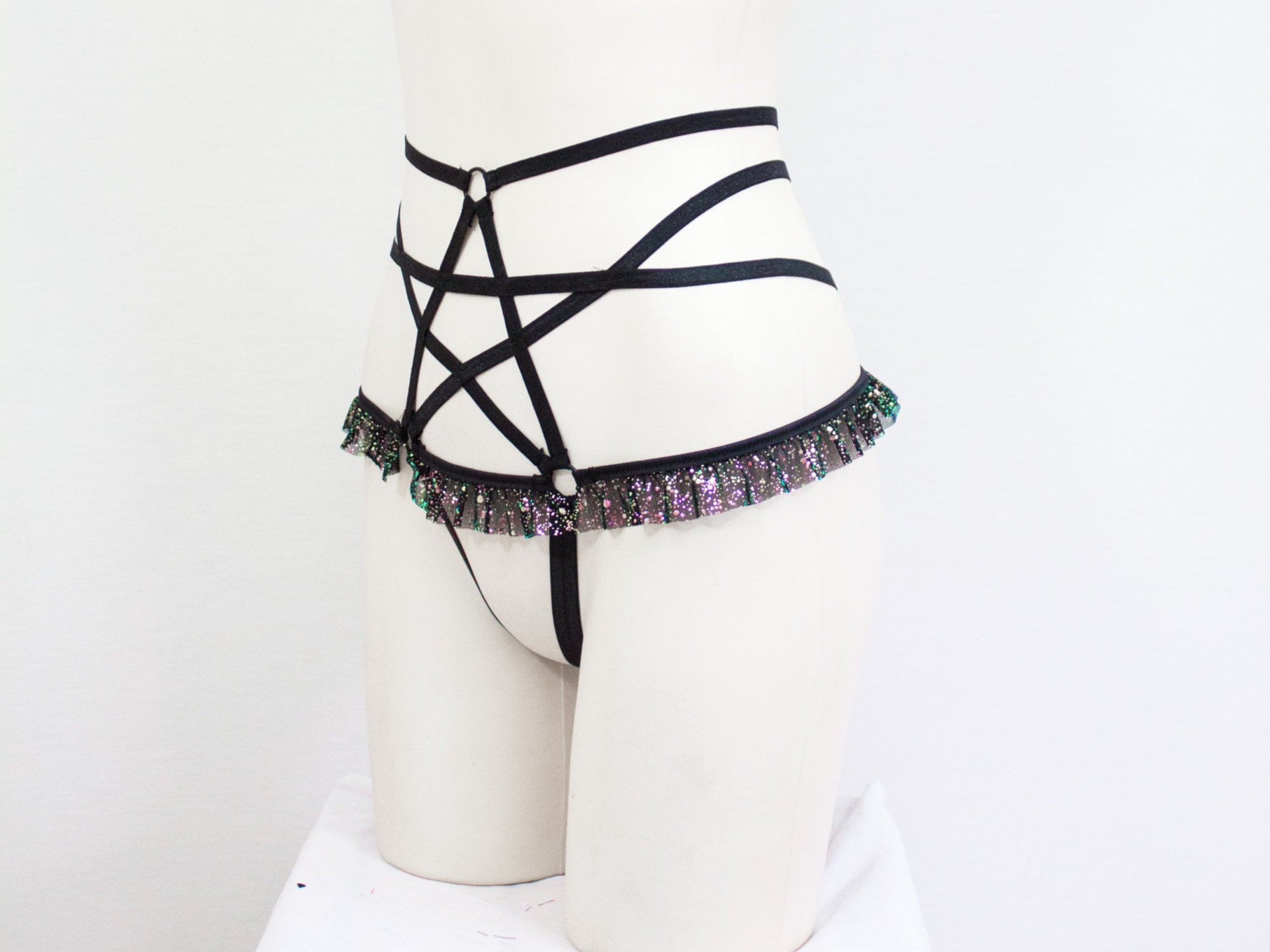 Black Underwear, Body Harness, Glitter Lingerie, Goth Clothing, Pentagram Panties, Festival Outfit, Burlesque Costume, Exotic Dancewear, Strappy