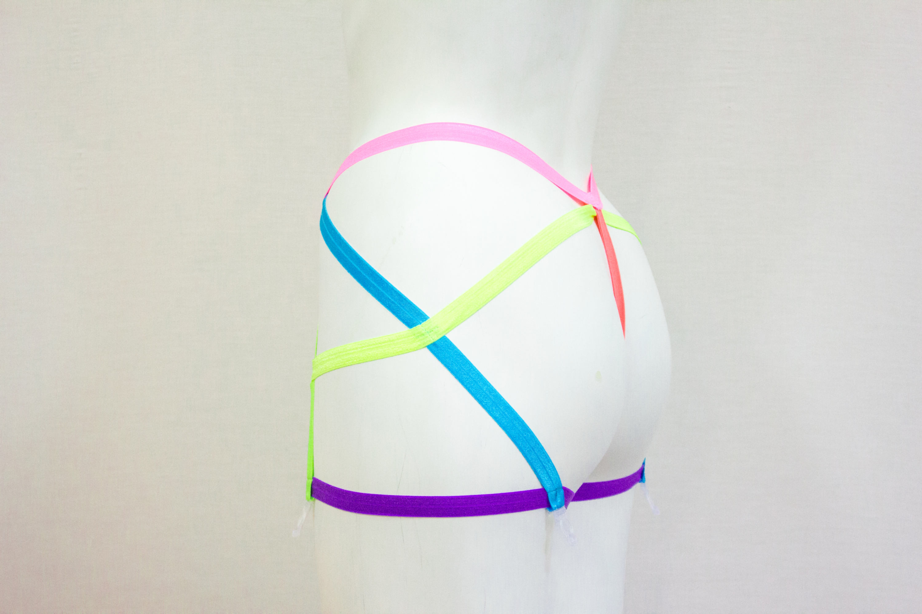 Geometric garter belt of rainbow awesomeness! Represent all of your colours with this hip hugging, stocking clipping, eye catching high waist, open crotch, thong back garter belt. From festivals & raves to up on stage, you'll look amazing in this one of a kind design garter belt. Hand made in Canada by Emily of - HarnessMeDesigns.Com
