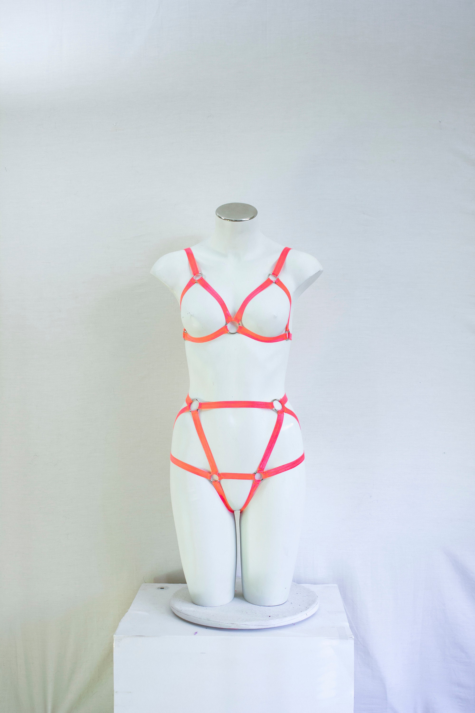 The classic set created by Harness Me Designs features the ever adorable triangle style open bust, adjustable shoulder strap cage bralette with matching open crotch, open bottom mid high waist harness panties. Comfortable stretch straps, perfect for accessorizing or all on it's own! Pick from a variety of colours, pastels, primaries, neon, and even some UV glow options! There's a colour for everyone.