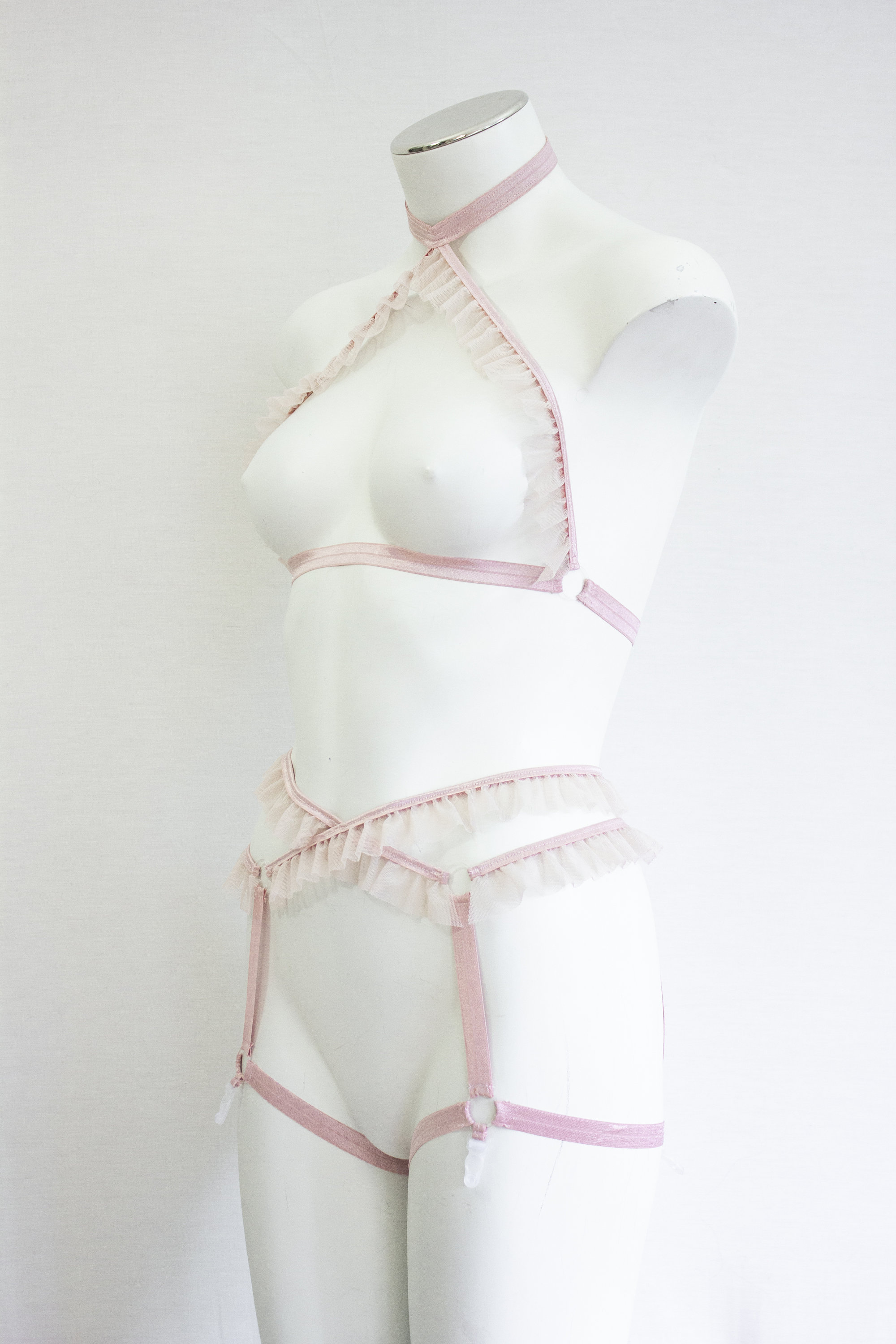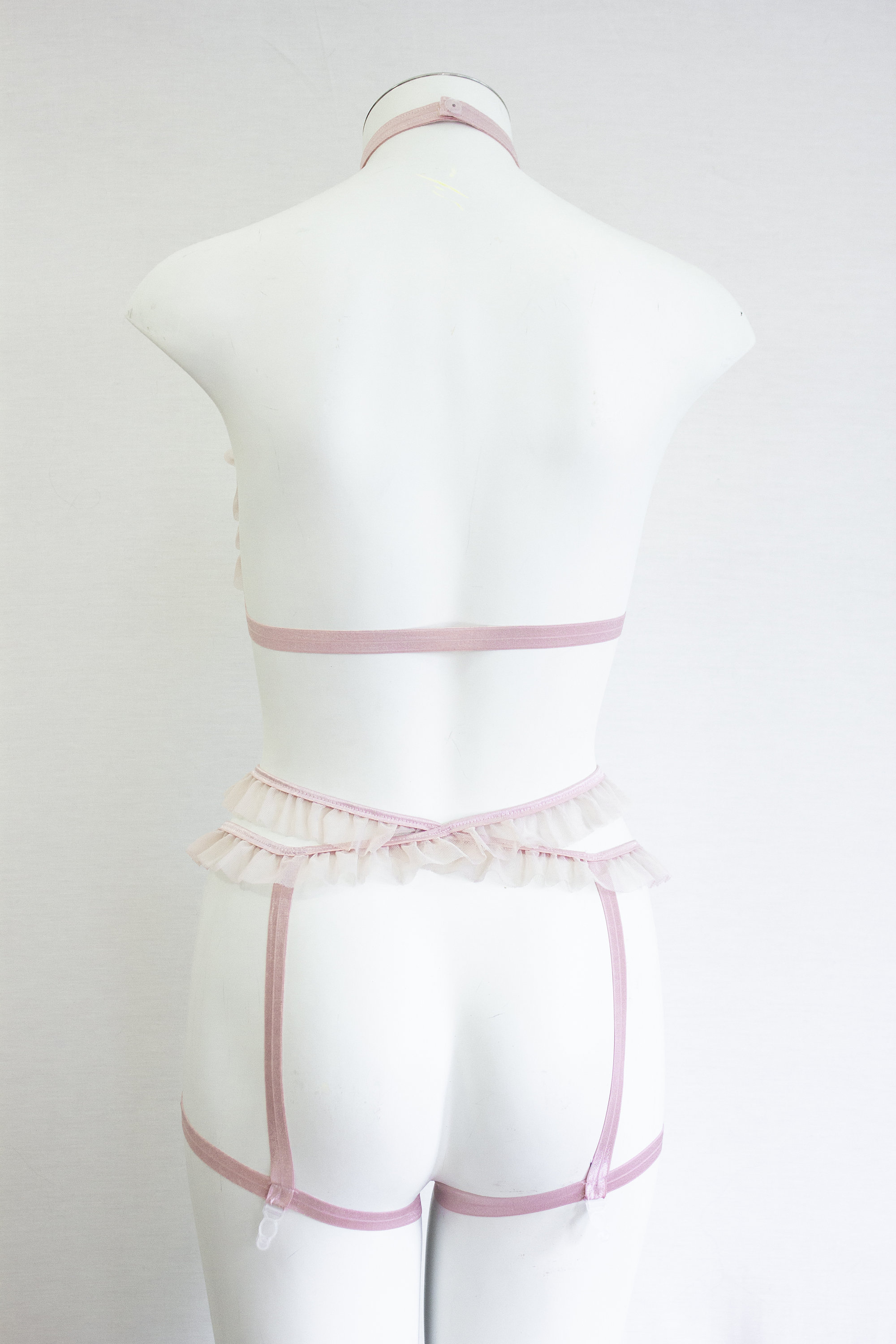 One and only of this set - soft and sensual, blush pink stretch strapping with a soft blush pink mesh ruffle trim in matching tone offers a unique look. Ballerina vibes flow through this soft and gentle feeling harness set. Lite and effervescent, strong and beautiful, just like you. Pick this harness if you feel it will match your soul and it will help you show off your life energy wherever you go.