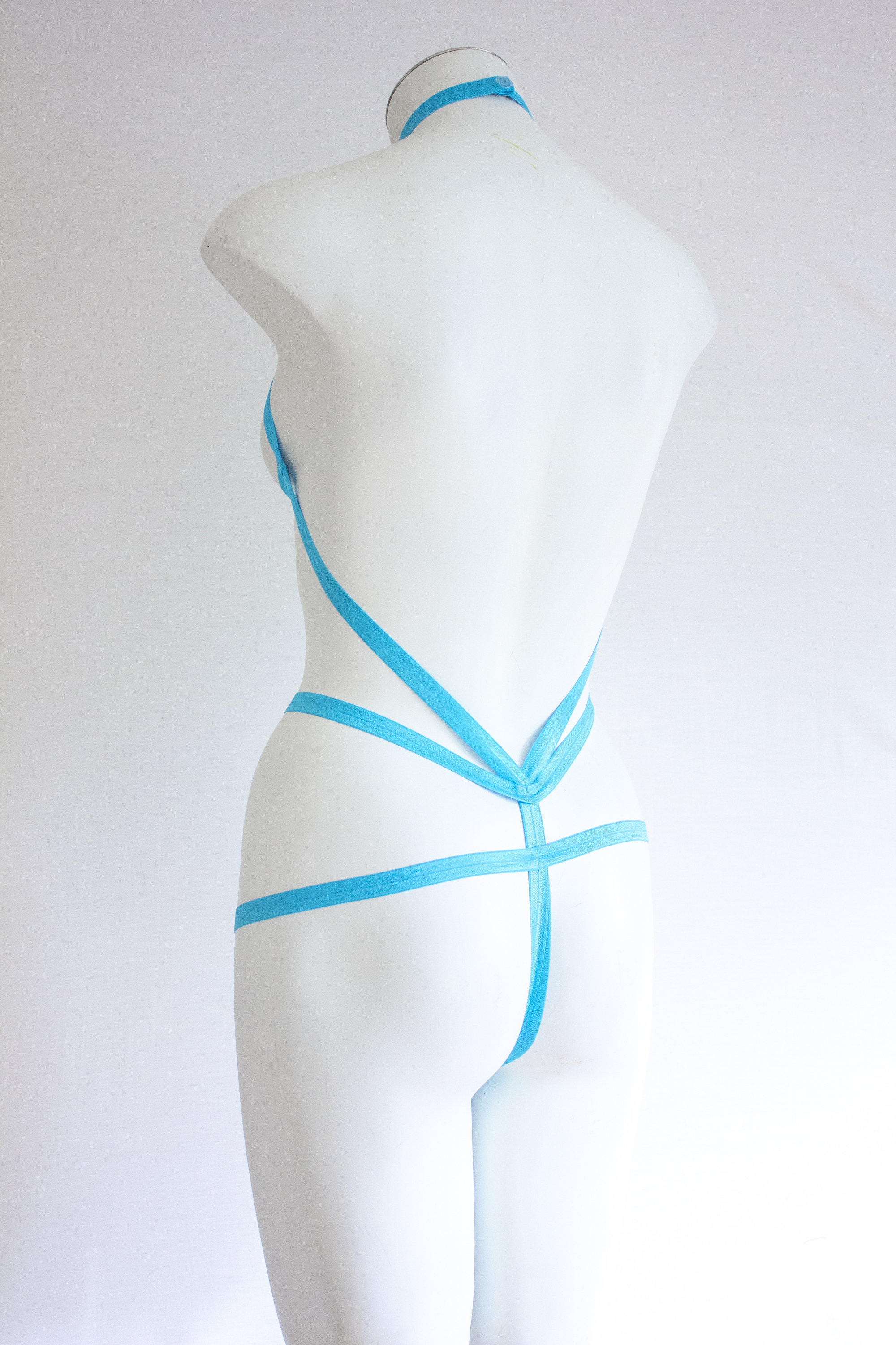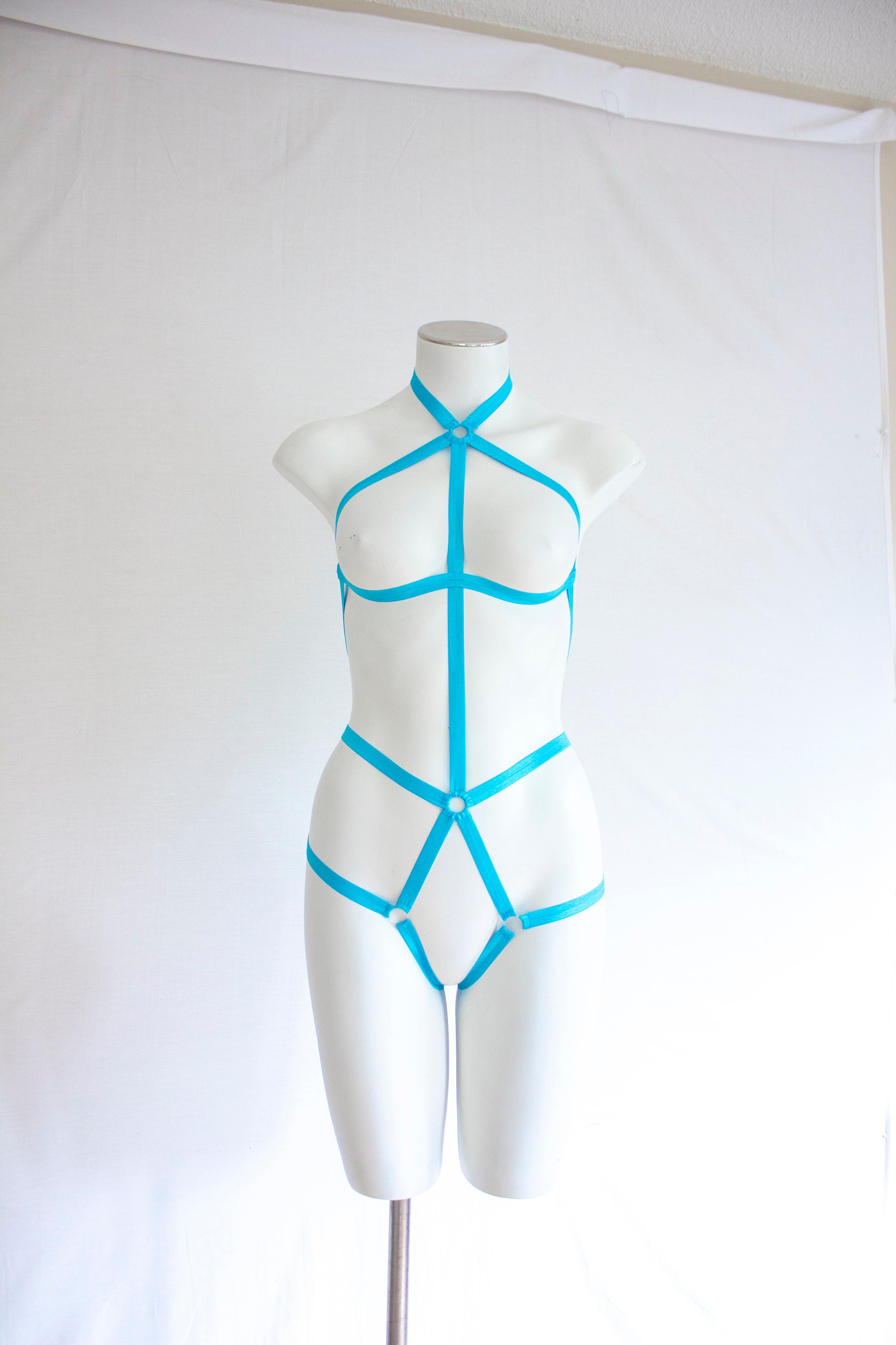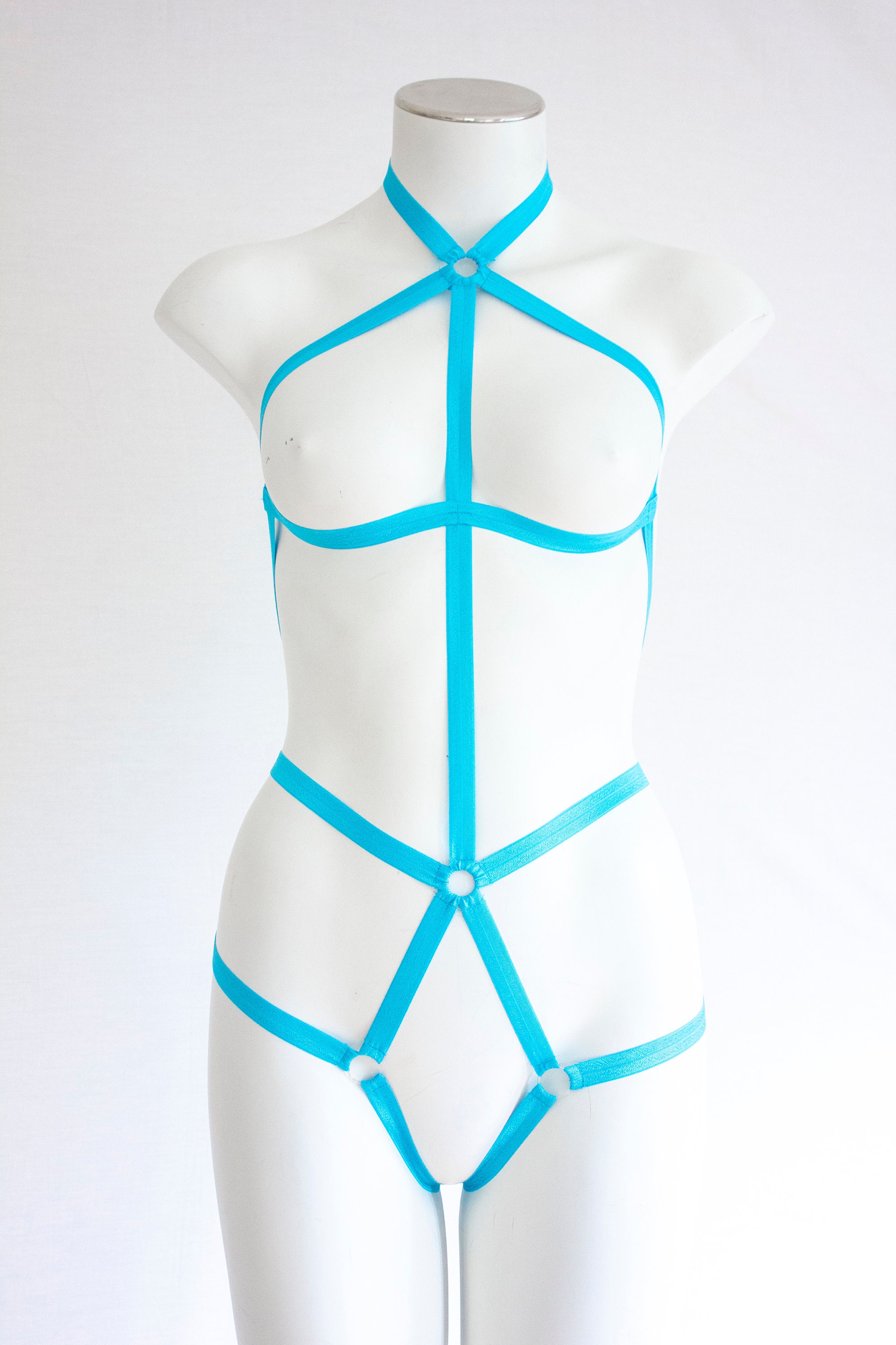 Exotic Dancewear: Rave Outfit, Festival Bodysuit, Strappy Lingerie, Blue Body Harness, High Waist, Halter Top, Neon Clothing, Open Crotch